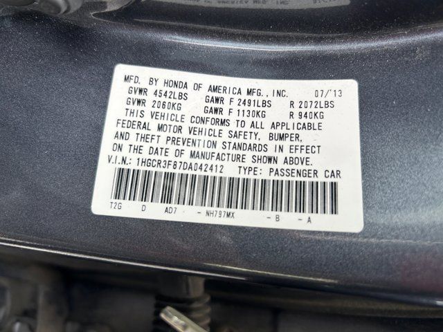 Recent Arrival!Odometer is 7647 miles below market average!2013 Honda Accord EX-L21/34 City/Highway MPGCall (801) 563-4011 today to schedule your test drive!Awards:* 2013 KBB.com Brand Image AwardsKelley Blue Book Brand Image Awards are based on the Brand Watch(tm) study from Kelley Blue Book Market Intelligence. Award calculated among non-luxury shoppers. For more information, visit www.kbb.com. Kelley Blue Book is a registered trademark of Kelley Blue Book Co., Inc.Black Leather, 17 Alloy Wheels, 4-Wheel Disc Brakes, 7 Speakers, ABS brakes, Air Conditioning, Alloy wheels, AM/FM radio: XM, Auto-dimming Rear-View mirror, Automatic temperature control, Brake assist, Bumpers: body-color, CD player, Delay-off headlights, Driver door bin, Driver vanity mirror, Dual front impact airbags, Dual front side impact airbags, Electronic Stability Control, Exterior Parking Camera Rear, Four wheel independent suspension, Front anti-roll bar, Front Bucket Seats, Front Center Armrest, Front dual zone A/C, Front fog lights, Front reading lights, Fully automatic headlights, Garage door transmitter: HomeLink, Heated door mirrors, Heated Front Bucket Seats, Heated front seats, Illuminated entry, Leather steering wheel, Low tire pressure warning, Memory seat, Occupant sensing airbag, Outside temperature display, Overhead airbag, Overhead console, Panic alarm, Passenger door bin, Passenger vanity mirror, Perforated Leather-Trimmed Seats, Power door mirrors, Power driver seat, Power moonroof, Power passenger seat, Power steering, Power windows, Radio data system, Radio: 360-Watt AM/FM/CD Premium Audio System, Rear anti-roll bar, Rear seat center armrest, Rear window defroster, Remote keyless entry, Security system, Speed control, Speed-sensing steering, Speed-Sensitive Wipers, Steering wheel mounted audio controls, Tachometer, Telescoping steering wheel, Tilt steering wheel, Traction control, Trip computer, Turn signal indicator mirrors, and Variably intermittent wipers. Black Leather.