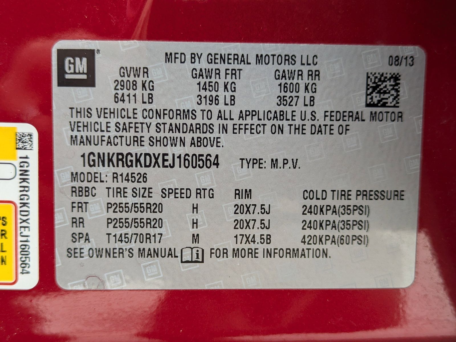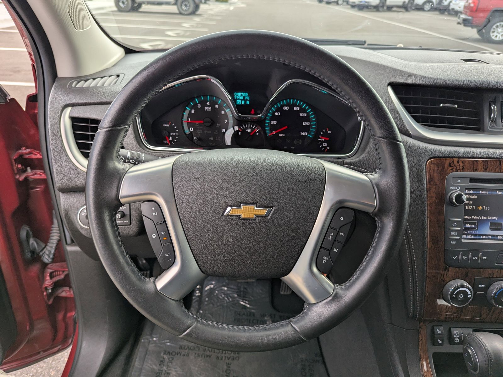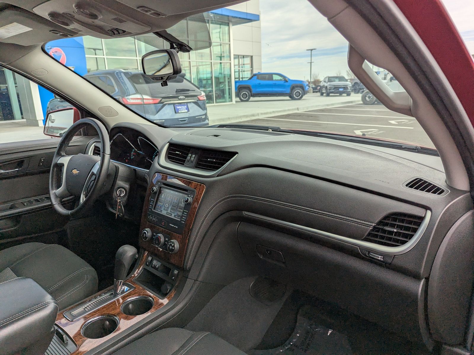 LICENSE PLATE BRACKET FRONT MOUNTING PACKAGE,EBONY SEAT TRIM PREMIUM CLOTH,TIRES P255/55R20 H-RATED BLACKWALL,SEATS HEATED DRIVER AND FRONT PASSENGER,AUDIO SYSTEM CHEVROLET MYLINK RADIO 6.5 diagonal color touch-screen display AM/FM/SiriusXM/HD radio with CD player includes Bluetooth streaming audio for music and select phones; Hands-Free smartphone integration with Pandora and Stitcher; voice-activated technology for radio and phone,RECLINING FRONT BUCKETS (STD),TRANSMISSION 6-SPEED AUTOMATIC,UNIVERSAL HOME REMOTE includes garage door opener 3-channel programmable,CRYSTAL RED TINTCOAT,LT PREFERRED EQUIPMENT GROUP Includes Standard Equipment,WHEELS 4 - 20 X 7.5 (50.9 CM X 19.1 CM) MACHINED PAINTED SPOKE,SEATING 7-PASSENGER (2-2-3 SEATING CONFIGURATION) with 2nd row flat-folding Captains Chair and third row 60/40 split flat folding bench seat,ALL-STAR EDITION includes (UG4) Chevrolet MyLink radio (KA1) heated driver and front passenger seats (UG1) Universal Home Remote (QQD) P255/55R20 H-rated blackwall tires and (PEJ) 4 - 20 x 7.5 (50.8 cm x 19.1 cm) machine painted spoke aluminum wheels,ENGINE 3.6L SIDI V6 (281 hp [210 kW] @ 6300 rpm 266 lb-ft of torque @ 3400 rpm [359.1 N-m]) (STD),Front Wheel Drive,Power Steering,ABS,4-Wheel Disc Brakes,Aluminum Wheels,Tires - Front All-Season,Tires - Rear All-Season,Temporary Spare Tire,Rear Spoiler,Automatic Headlights,Fog Lamps,Privacy Glass,Heated Mirrors,Power Mirror(s),Integrated Turn Signal Mirrors,Intermittent Wipers,Intermittent Wipers,AM/FM Stereo,CD Player,Satellite Radio,HD Radio,Requires Subscription,Auxiliary Audio Input,MP3 Capability,Auxiliary Audio Input,MP3 Capability,Auxiliary Audio Input,Satellite Radio,Requires Subscription,Bucket Seats,3rd Row Seat,Pass-Through Rear Seat,Rear Bench Seat,Bluetooth Connection,Cloth Seats,Power Driver Seat,Driver Adjustable Lumbar,3rd Row Seat,Pass-Through Rear Seat,Floor Mats,Cruise Control,Steering Wheel Audio Controls,Leather Steering Wheel,Adjustable Steering Wheel,Trip Computer,Power Windows,Power Door Locks,Keyless Entry,Power Door Locks,Keyless Entry,Power Door Locks,Remote Engine Start,Cruise Control,Back-Up Camera,A/C,A/C,Rear A/C,Rear Defrost,Rear Parking Aid,Driver Vanity Mirror,Passenger Vanity Mirror,Driver Illuminated Vanity Mirror,Passenger Illuminated Visor Mirror,Front Reading Lamps,Rear Reading Lamps,Woodgrain Interior Trim,Traction Control,Stability Control,Traction Control,Daytime Running Lights,Driver Air Bag,Passenger Air Bag,Front Side Air Bag,Front Head Air Bag,Rear Head Air Bag,Passenger Air Bag Sensor,Telematics,Navigation from Telematics,Requires Subscription,Child Safety Locks,Tire Pressure Monitor