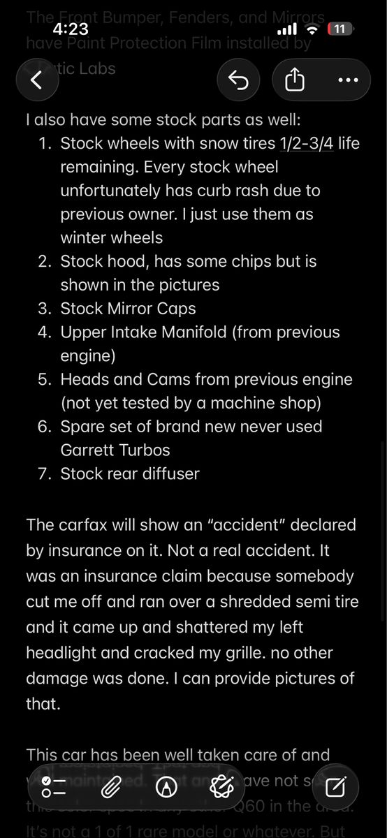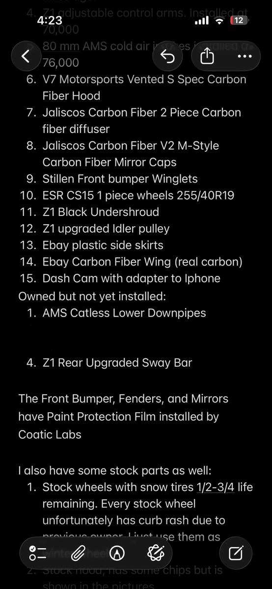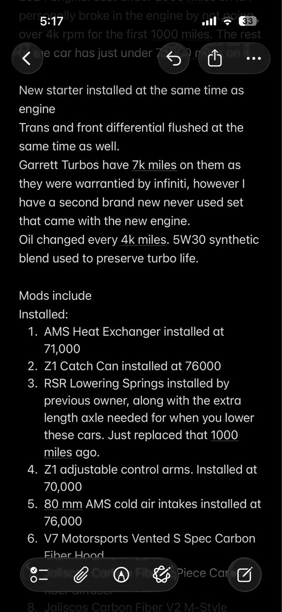 2018 Infiniti Q60 Red sport 400. Just installed a brand new 0 mile never used 2024 engine. Just under 2000 miles on it. I personally broke in the engine by not going over 4k rpm for the first 1000 miles. The rest of the car has just above 78000 miles. I’m the 3rd owner from 46k miles to current. (forgot to put this on the calendar mod list, but the previous owner installed an apple car play head unit) Interior and Exterior are almost perfect. Not a single dent on this car as I had them pulled when I bought it. Oil changed every 4k miles. $34,000 for the car, the extra mods, the stock parts, all of it. $30,000 for just the car but with the stock hood, mirror caps and wheels. Hit me up with any questions. Will continue to lower the price as I sell parts