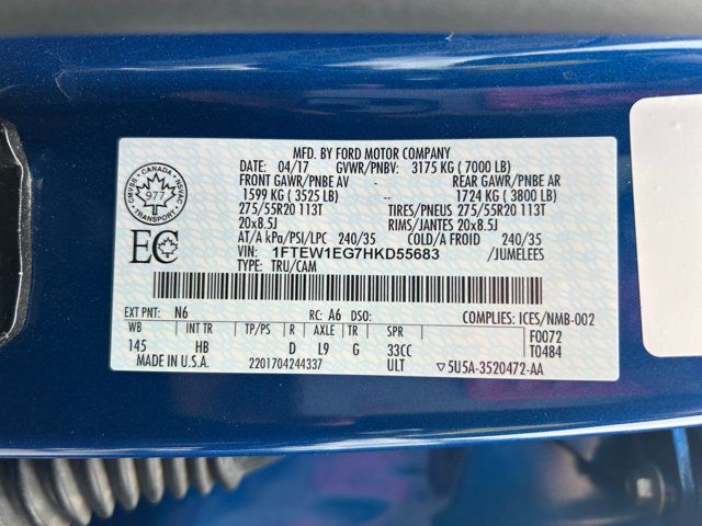 GVWR: 6,500 lbs Payload Package,7 Speakers,AM/FM radio: SiriusXM,CD player,Radio data system,Radio: Single-CD w/SiriusXM Satellite,Air Conditioning,Automatic temperature control,Front dual zone A/C,Rear window defroster,Memory seat,Pedal memory,Power driver seat,Power steering,Power windows,Remote keyless entry,Steering wheel mounted audio controls,Speed-sensing steering,Traction control,4-Wheel Disc Brakes,ABS brakes,Dual front impact airbags,Dual front side impact airbags,Front anti-roll bar,Front wheel independent suspension,Low tire pressure warning,Occupant sensing airbag,Overhead airbag,Brake assist,Electronic Stability Control,Exterior Parking Camera Rear,Delay-off headlights,Front fog lights,Fully automatic headlights,Panic alarm,Security system,Speed control,Auto-dimming door mirrors,Bumpers: chrome,Heated door mirrors,Power door mirrors,Rear step bumper,Turn signal indicator mirrors,Adjustable pedals,Auto-dimming Rear-View mirror,Compass,Driver door bin,Driver vanity mirror,Front reading lights,Illuminated entry,Outside temperature display,Overhead console,Passenger vanity mirror,Rear reading lights,Rear seat center armrest,SYNC 3,Tachometer,Telescoping steering wheel,Tilt steering wheel,Trip computer,Voltmeter,Heated front seats,Leather-Trimmed 40/20/40 Front Seat,Power passenger seat,Split folding rear seat,Ventilated front seats,Front Center Armrest w/Storage,Passenger door bin,Class IV Trailer Hitch Receiver,18 Machined-Aluminum Wheels,Alloy wheels,Variably intermittent wipers,3.55 Axle Ratio