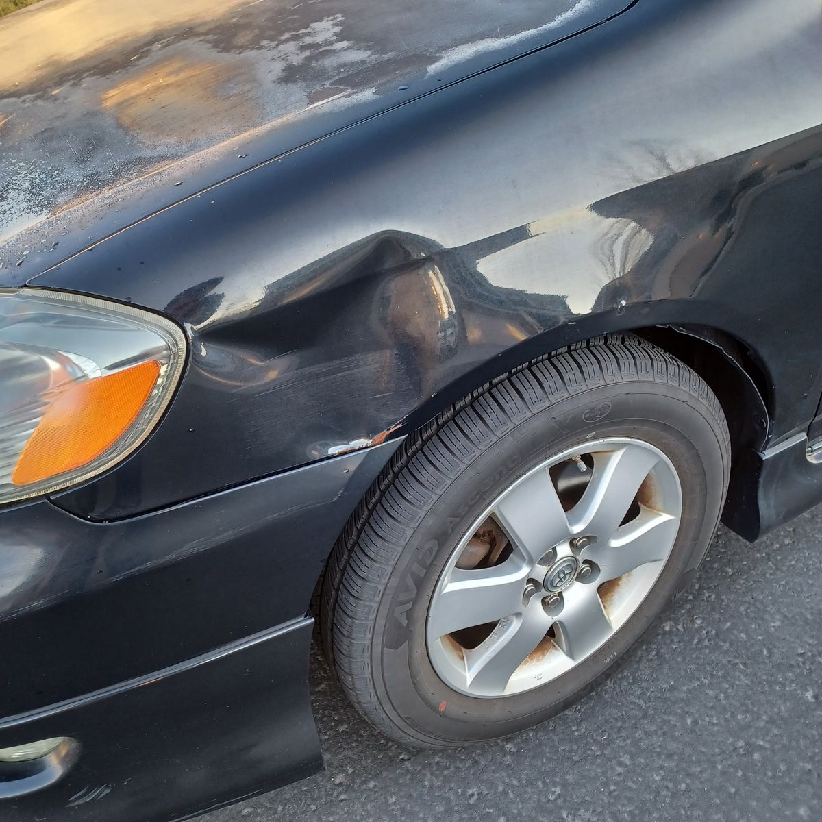 Dent in the fender above the front wheel well (someone backed into it while it was parked)