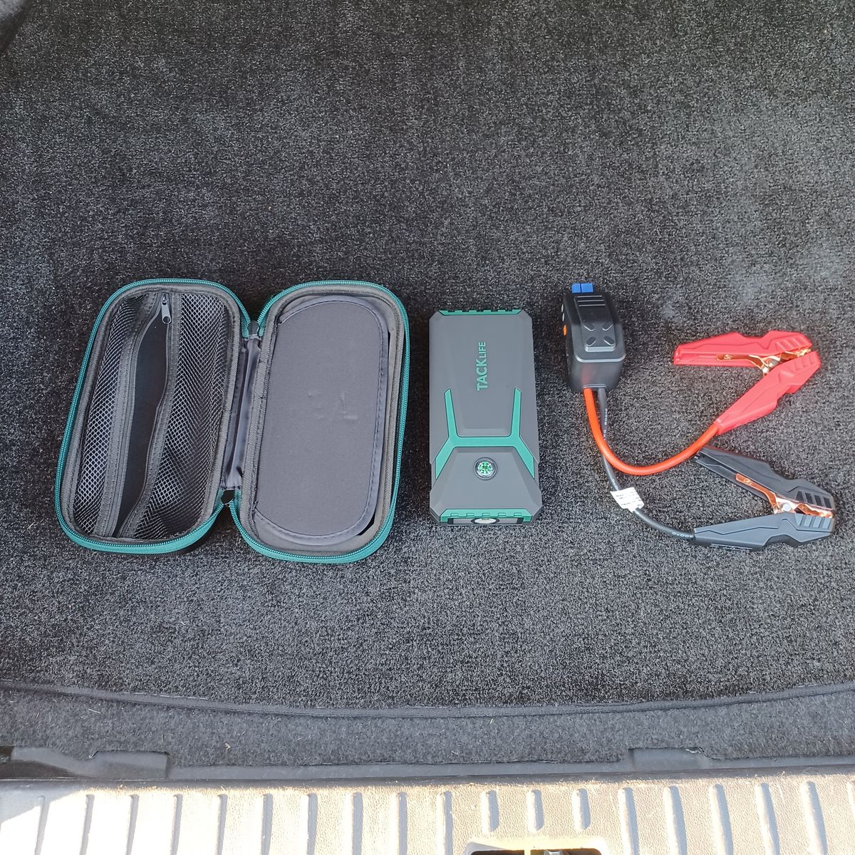 I use a portable jump starter that works great and starts the car immediately when needed. I’ll include the TACKlife portable jump starter with the car.