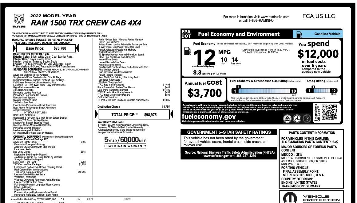 Customer Preferred Package 29Y Advanced Safety GroupPedestrian Emergency BrakingAdaptive Cruise Control with Stop and GoLane Keep Assist Bed Utility GroupDeployable Bed–Step by Mopar®4 Adjustable Cargo Tie–Down Hooks by Mopar®Source: National Highway Traffic Safety Administration (NHTSA)www.safercar.gov or 1–888–327–4236Spray–In Bedliner by Mopar® Lower Two–Tone PaintTRX Carbon–Fiber PackageLeather and Carbon Flat–Bottom Steering WheelReal Carbon Fiber Interior AccentsTRX Level 2 Equipment GroupLeather–Trimmed Bucket SeatsVentilated Front SeatsWrapped Driver and Passenger Assist HandlesLuxury Front Door Trim PanelFull–Length Premium Upgraded Floor–ConsoleHead–Up DisplayDigital Rearview MirrorPremium Wrapped Instrument–Panel BezelInstrument–Panel LED Ambient–Light PipingRadio / Driver Seat / Mirrors / Pedals MemoryDriver–Seat Memory4–Way Power Lumbar Adjustable Passenger Seat8–Way Power Driver and Passenger SeatsPower Adjustable Pedals with MemoryTrailer Brake–Controller19 Speaker Harman Kardon® Premium SoundBlind–Spot and Cross–Path DetectionHeated Steering WheelParkSense® Front and Rear Park–Assist with StopPick–Up Box LightingRain–Sensitive Windshield WipersPower Tailgate–ReleaseRear 60/40 Split Folding / Reclining SeatVentilated Rear SeatsWireless Charging–PadBlack Power–Fold Trailer–Tow Mirrors"TRX" Red Interior AccentsDual–Pane Panoramic Sunroof"TRX" Exterior Graphics by Mopar®"TRX" Hood Graphics by Mopar®18–Inch x 9.0–Inch Beadlock–Capable Alum Wheels