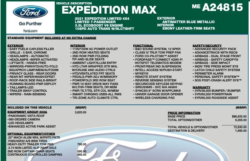 Front Pedestrian Automatic emergency braking, Front Automatic emergency braking, Lane keeping assist, Pedestrian Detection Pre-collision warning system, Driver attention alert system, Audible Warning Pre-collision warning system, Visual Warning Pre-collision warning system, Sensor/alert Blind spot safety, Rear Cross traffic alert, Trailer Coverage Blind spot safety, Lane deviation sensors, Rearview Camera system, Front Side airbags, Rear Side curtain airbags, Front Side curtain airbags, Third Row Side curtain airbags, Front Parking sensors, Rear Parking sensors, 4-wheel ABS, Interior Motion Sensor Anti-theft system, Anti-tow Sensor Anti-theft system, Anti-lockout Power door locks, Auto-locking Power door locks, Rear Camera system washer, Programmable safety key, Hill Descent Off-road driving assist, Auto Off Electronic parking brake, Perimeter Alarm Anti-theft system, Trailer stability control, Ventilated Disc Rear brake, Alarm Anti-theft system, Braking assist, Hill holder control, Ventilated Disc Front brake, Dual Front airbags, Vehicle Immobilizer Anti-theft system, Power brakes, LATCH System Child seat anchors, Electronic brakeforce distribution, Stability control, Traction control, In Dash Rearview monitor, Occupant Sensing Passenger Airbag deactivation, Front Seatbelt pretensioners, Front Seatbelt force limiters, Front Emergency locking retractors, Post-collision Safety System Impact sensor, Door Unlock Impact sensor, Rear Emergency locking retractors, Roll stability control, Front Seatbelt warning sensor, Fully Automated Active parking system, Semi-automatic Adaptive stop and go cruise control, Leather-trimmed Upholstery, Adaptive cruise control, Proximity Entry System Multi-function remote, Ventilated Driver seat, Ventilated Passenger seat, Heated steering wheel, Automatic Climate Control Rear air conditioning, 10 Driver seat power adjustments, Leather Steering wheel trim, Automatic Climate Control Front air conditioning, Driver Seat Memorized settings, Steering Wheel Memorized settings, Side Mirrors Memorized settings, Dual Front air conditioning zones, Power Tilt And Telescopic Steering wheel, Front Wireless charging station, Adjustable Pedals Memorized settings, Independently Controlled Rear air conditioning, Power Adjustable pedals, Push-button start, Heated Driver seat, Remote engine start, Heated Passenger seat, Garage Door Opener Universal remote transmitter, Auto-dimming Rearview mirror, Heated Rear seat, 10 Passenger seat power adjustments, Liftgate Memorized settings, Variable/speed-proportional Power steering, Bucket Front seat, Ambient lighting, Power Third row seat folding, Power Rear seat folding, Keypad entry, Captains Chairs Rear seat, 40-20-40 Split Bench Rear seat, 40-60 Split Bench Third row seat, 8 In. Instrument cluster screen size, 115V Rear Power outlet(s), Carpet Floor mat material, 3 Driver Memorized settings, Fold Flat Into Floor Third row seat folding, Air filtration, Capless fuel filler system, Customizable instrument cluster, Flat Rear seat folding, Split Third row seat folding, Split Rear seat folding, USB-C Front Power outlet(s), USB Rear Power outlet(s), USB-C Rear Power outlet(s), 12V Cargo Area Power outlet(s), 12V Rear Power outlet(s), 12V Front Power outlet(s), Third Row Rear vents, Rear Floor mats, Front Floor mats, Multi-function display, Oil Pressure Gauge, Sliding Rear seat, Rubber/vinyl Cargo area floor mat, Front Console With Armrest And Storage Center console, Compass, 15 Cupholders, USB Third Row Power outlet(s), 4 One-touch windows, External temperature display, MPG Fuel economy display, Range Fuel economy display, Cargo Net Storage, Front Reading lights, Tachometer Gauge, Reclining Rear seat manual adjustments, Rear Reading lights, Lumbar Driver seat power adjustments, Lumbar Passenger seat power adjustments, Reclining Passenger seat power adjustments, Reclining Driver seat power adjustments, Third Row Reading lights, Height Driver seat power adjustments, Height Passenger seat power adjustments, Front Cupholders, Third Row Cupholders, Maintenance Due Warnings and reminders, Front Overhead console, Dual Illuminating Vanity mirrors, Rear Cupholders, Cargo area light, Panic Alarm Multi-function remote, Audio Steering wheel mounted controls, Cargo Tie-down Anchors And Hooks Storage, Carpet Floor material, Cruise Control Steering wheel mounted controls, Phone Steering wheel mounted controls, Multi-function Steering wheel mounted controls, Front Seatback Storage, Voice Control Steering wheel mounted controls, Single Rear air conditioning zones, Sunglasses Holder Storage, Trunk Release Multi-function remote, Aluminum Alloy With Painted Accents Wheels, Sensor-activated Rear trunk/liftgate, Power Operated Rear trunk/liftgate, Power Retractable Running boards, Rain Sensing Front wipers, Auto High Beam Dimmer Headlights, LED Taillights, Power Folding Side mirror adjustments, Driver Side Auto-dimming Side mirrors, Safety Reverse Power windows, Power Side mirror adjustments, Heated Side mirrors, Acoustic Windshield Laminated glass, Daytime running lights, Front fog lights, Manual Flip-up Liftgate window, Puddle Lamps Exterior entry lights, Approach Lamps Exterior entry lights, Steel Spare wheel, Chrome Roof rails, Intermittent Rear wiper, Rear Window defogger, Rear privacy glass, With Washer Rear wiper, Tire Pressure Monitoring System, Integrated Turn Signals Side mirrors, Active grille shutters, Front Solar-tinted glass, Full-size Spare tire size, Auto On/off Headlights, Chrome Window trim, Intermittent Front wipers, Auto Delay Off Headlights, Chrome Grille color, Chrome Surround Grille color, Stainless Steel Running board color, Wiper Activated Headlights, Liftgate Rear trunk/liftgate, Hotspot Wi-Fi, Touch Screen Display Navigation system, Voice Operated Navigation system, Bang & Olufsen Premium brand, 1100 Watts, Apple CarPlay Smartphone integration, Android Auto Smartphone integration, FordPass Connect Smart device app compatibility, 11 Total 