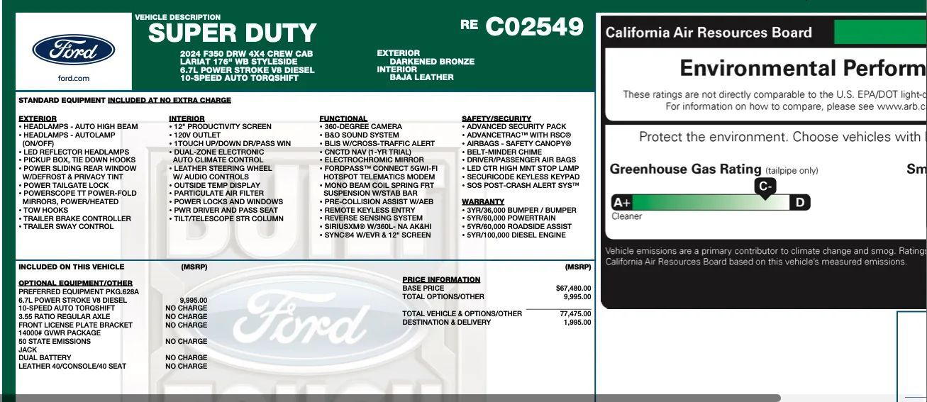 Hotspot Wi-Fi, Wireless Apple CarPlay Smartphone integration, Wireless Android Auto Smartphone integration, FordPass Connect Smart device app compatibility, Bluetooth Wireless data link, Voice Operated Hands-free phone call integration, Voice Operated Radio, Bluetooth Auxiliary audio input, Engine Start Smart device app function, Touch Screen Display Radio, App Marketplace Integration Connected in-car apps, With Read Function Electronic messaging assistance, Voice Operated Electronic messaging assistance, USB Auxiliary audio input, IPod/iPhone Auxiliary audio input, Vehicle Location Smart device app function, Lock Operation Smart device app function, SYNC Infotainment, Maintenance Status Smart device app function, AM/FM Radio, Speed sensitive volume control, Google POIs Connected in-car apps, Google Search Connected in-car apps, Trailer brake controller, Electronic Hi-lo 4WD selector, 4-pin Trailer wiring, 7-pin Trailer wiring, Part Time 4WD, Trailer hitch, AGM Battery, Front Tow hooks, 750 CCA Battery rating, Multi-link Front suspension, Solid Live Axle Rear suspension classification, Solid Live Axle Front suspension classification, Diameter 22 Mm Rear stabilizer bar, Battery saver, Diameter 24 Mm Front stabilizer bar, Front Side airbags, Rear Side curtain airbags, Front Side curtain airbags, 4-wheel ABS, Programmable safety key, Trailer stability control, Ventilated Disc Rear brake, Braking assist, Hill holder control, Ventilated Disc Front brake, Dual Front airbags, Vehicle Immobilizer Anti-theft system, Power brakes, LATCH System Child seat anchors, Passenger Switch Airbag deactivation, Electronic brakeforce distribution, Stability control, Traction control, In Dash Rearview monitor, Front Seatbelt pretensioners, Front Emergency locking retractors, Post-collision Safety System Impact sensor, Alert System Impact sensor, Door Unlock Impact sensor, Rear Emergency locking retractors, Roll stability control, Front Seatbelt warning sensor, Dual rear wheels, Safety Reverse Power windows, Towing mirrors, Power Locking Tailgate, Power Side mirror adjustments, Heated Side mirrors, Steel Spare wheel, Variable Intermittent Front wipers, Lift Assist Tailgate, Integrated Turn Signals Side mirrors, Front Solar-tinted glass, Full-size Spare tire size, Auto On/off Headlights, Auto Delay Off Headlights, Roof-mounted lights, Clearance lights, Wiper Activated Headlights, Black Window trim, 60-40 Split Bench Rear seat, Air filtration, Folds Up Rear seat folding, Transmission Temperature Gauge, Split Rear seat folding, USB Front Power outlet(s), USB-C Front Power outlet(s), 12V Front Power outlet(s), Multi-function display, Oil Pressure Gauge, Power steering, External temperature display, MPG Fuel economy display, Range Fuel economy display, Front Reading lights, Tachometer Gauge, Rear Reading lights, Scuff Plate Door sill trim, Front Cupholders, Maintenance Due Warnings and reminders, Front Overhead console, 2 One-touch windows, Panic Alarm Multi-function remote, Audio Steering wheel mounted controls, Cruise Control Steering wheel mounted controls, Phone Steering wheel mounted controls, Multi-function Steering wheel mounted controls, Voice Control Steering wheel mounted controls, Powertrain hour meter