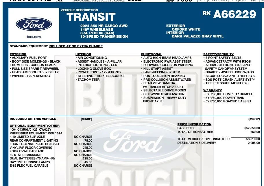 Front Pedestrian Automatic emergency braking, Front Automatic emergency braking, Pedestrian Detection Pre-collision warning system, Driver attention alert system, Audible Warning Pre-collision warning system, Visual Warning Pre-collision warning system, Lane deviation sensors, Rearview Camera system, Front Side airbags, Front Side curtain airbags, 4-wheel ABS, Emergency braking preparation, Cornering brake control, Auto-locking Power door locks, Auto Off Electronic parking brake, Crosswind stabilization, Trailer stability control, Ventilated Disc Rear brake, Alarm Anti-theft system, Braking assist, Hill holder control, Ventilated Disc Front brake, Dual Front airbags, Vehicle Immobilizer Anti-theft system, Power brakes, Passenger Switch Airbag deactivation, Electronic brakeforce distribution, Stability control, Traction control, In Dash Rearview monitor, Front Seatbelt pretensioners, Front Emergency locking retractors, Post-collision Safety System Impact sensor, Door Unlock Impact sensor, Roll stability control, Front Seatbelt warning sensor, Hotspot Wi-Fi, FordPass Connect Smart device app compatibility, Bluetooth Wireless data link, Bluetooth Auxiliary audio input, Engine Start Smart device app function, Hands-free phone call integration, USB Auxiliary audio input, Vehicle Location Smart device app function, Lock Operation Smart device app function, Maintenance Status Smart device app function, 4 In. Infotainment screen size, 4 Total speakers, AM/FM Radio, Proximity Entry System Multi-function remote, Variable/speed-proportional Power steering, Cruise control, Bucket Front seat, Front air conditioning, Keyless Entry Multi-function remote, Capless fuel filler system, USB Front Power outlet(s), 12V Cargo Area Power outlet(s), 12V Front Power outlet(s), Tilt And Telescopic Steering wheel, External temperature display, Range Fuel economy display, Front Console With Storage Center console, Front Reading lights, Tachometer Gauge, Front Cupholders, Cargo area light, 1 One-touch windows, Panic Alarm Multi-function remote, Audio Steering wheel mounted controls, Rubber/vinyl Floor material, Cruise Control Steering wheel mounted controls, Phone Steering wheel mounted controls, Multi-function Steering wheel mounted controls, Single Front air conditioning zones, Trunk Release Multi-function remote, Dual Front Armrests, High OEM roof height, Rain Sensing Front wipers, Auto High Beam Dimmer Headlights, Safety Reverse Power windows, Power Side mirror adjustments, Painted Steel Wheels, Steel Spare wheel, Rear Window defogger, Variable Intermittent Front wipers, Tire Pressure Monitoring System, Solar-tinted glass, Full-size Spare tire size, Auto On/off Headlights, Auto Delay Off Headlights, Passenger-side Manual Sliding Side door, Barn Rear trunk/liftgate, Black Rear bumper color, Black Window trim, Black Door handle color, Black Mirror color, Manual Folding Side mirror adjustments, Black Surround Grille color, Black Grille color, Black Body side moldings, Black Front bumper color, Trailer brake controller, Rear Limited slip differential, Trailer wiring, 4-pin Trailer wiring, On Demand 4WD, Trailer hitch, AGM Battery, Independent Front suspension classification, MacPherson Front struts, 250 Amps Alternator, Auxiliary transmission fluid cooler, Solid Live Axle Rear suspension classification, Front stabilizer bar