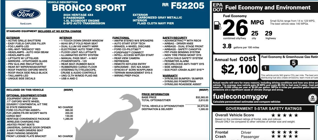 Front Pedestrian Automatic emergency braking, Front Automatic emergency braking, Lane keeping assist, Pedestrian Detection Pre-collision warning system, Driver attention alert system, Audible Warning Pre-collision warning system, Visual Warning Pre-collision warning system, Sensor/alert Blind spot safety, Rear Cross traffic alert, Lane deviation sensors, Driver Knee airbags, Rearview Camera system, Front Side airbags, Rear Side curtain airbags, Front Side curtain airbags, 4-wheel ABS, Emergency braking preparation, Anti-lockout Power door locks, Auto-locking Power door locks, Rear Camera system washer, Programmable safety key, Auto Off Electronic parking brake, Perimeter Alarm Anti-theft system, Trailer stability control, Alarm Anti-theft system, Braking assist, Hill holder control, Disc Rear brake, Ventilated Disc Front brake, Dual Front airbags, Vehicle Immobilizer Anti-theft system, Power brakes, LATCH System Child seat anchors, Electronic brakeforce distribution, Stability control, Traction control, In Dash Rearview monitor, Occupant Sensing Passenger Airbag deactivation, Front Seatbelt pretensioners, Front Seatbelt force limiters, Front Emergency locking retractors, Post-collision Safety System Impact sensor, Rear Seatbelt pretensioners, Alert System Impact sensor, Door Unlock Impact sensor, Rear Emergency locking retractors, Roll stability control, Front Seatbelt warning sensor, Lane Centering Autonomous lane guidance, Proximity Entry System Multi-function remote, Automatic Climate Control Front air conditioning, Push-button start, Premium Cloth Upholstery, Dual Level Cargo Area Storage, Variable/speed-proportional Power steering, Cruise control, Bucket Front seat, Faux Suede Center console trim, Humidity/dewpoint sensors, 60-40 Split Bench Rear seat, Faux Suede Dash trim, Carpet Floor mat material, Air filtration, Capless fuel filler system, Flat Rear seat folding, Split Rear seat folding, USB Front Power outlet(s), USB-C Front Power outlet(s), 12V Cargo Area Power outlet(s), 12V Front Power outlet(s), Tilt And Telescopic Steering wheel, Second Row Rear vents, Front Floor mats, Multi-function display, Front Console With Armrest And Storage Center console, Compass, Rear Center With Cupholders Armrests, Rear Folding Armrests, External temperature display, MPG Fuel economy display, Range Fuel economy display, 6 Driver seat manual adjustments, Front Reading lights, Tachometer Gauge, Metallic-tone Interior accents, Manual Day/night Rearview mirror, Rear Reading lights, 4.2 In. Instrument cluster screen size, Front Cupholders, Maintenance Due Warnings and reminders, Front Overhead console, Dual Illuminating Vanity mirrors, Rear Cupholders, Cargo area light, Cargo Area Rubber/vinyl Floor material, 1 One-touch windows, Panic Alarm Multi-function remote, Audio Steering wheel mounted controls, Cargo Tie-down Anchors And Hooks Storage, Carpet Floor material, Cruise Control Steering wheel mounted controls, Phone Steering wheel mounted controls, Multi-function Steering wheel mounted controls, Front Seatback Storage, Voice Control Steering wheel mounted controls, Single Front air conditioning zones, Sunglasses Holder Storage, Trunk Release Multi-function remote, Painted Aluminum Alloy Wheels, LED Headlights, Auto High Beam Dimmer Headlights, Dual Tip Exhaust, LED Taillights, LED Front fog lights, Safety Reverse Power windows, Power Side mirror adjustments, Heated Side mirrors, Acoustic Windshield Laminated glass, Daytime running lights, Contrast Roof Paint, Aluminum Alloy Spare wheel, Manual Flip-up Liftgate window, Approach Lamps Exterior entry lights, Black Roof rails, Intermittent Rear wiper, Rear Window defogger, Variable Intermittent Front wipers, Rear privacy glass, With Washer Rear wiper, Tire Pressure Monitoring System, Active grille shutters, Solar-tinted glass, Full-size Spare tire size, Auto On/off Headlights, Auto Delay Off Headlights, Black Fender lip moldings, Wiper Activated Headlights, Liftgate Rear trunk/liftgate, Black Rear bumper color, Black Window trim, Black Door handle color, Black Mirror color, Manual Folding Side mirror adjustments, Accent Grille color, Black Front bumper color, Metallic Exhaust tip color, Hotspot Wi-Fi, Apple CarPlay Smartphone integration, Android Auto Smartphone integration, FordPass Connect Smart device app compatibility, Bluetooth Wireless data link, Voice Operated Hands-free phone call integration, Voice Operated Radio, Bluetooth Auxiliary audio input, Engine Start Smart device app function, 8 In. Infotainment screen size, Touch Screen Display Radio, App Marketplace Integration Connected in-car apps, With Read Function Electronic messaging assistance, Voice Operated Electronic messaging assistance, SiriusXM Satellite radio, 6 Total speakers, USB Auxiliary audio input, IPod/iPhone Auxiliary audio input, Vehicle Location Smart device app function, Lock Operation Smart device app function, SYNC Infotainment, Horn/light Operation Smart device app function, Maintenance Status Smart device app function, Roadside Assistance Driver assistance app, AM/FM Radio, Radio data system, Speed sensitive volume control, Google POIs Connected in-car apps, Google Search Connected in-car apps, Auto start/stop, 4-pin Trailer wiring, Class II Trailer hitch, On Demand 4WD, Auxiliary oil cooler, Drive mode selector, Independent Front suspension classification, Independent Rear suspension classification, MacPherson Front struts, Short And Long Arm Rear suspension, Diameter 23 Mm Rear stabilizer bar, Monotube Rear shock, Diameter 27 Mm Front stabilizer bar, Battery saver, Twin-tube Gas Front shock