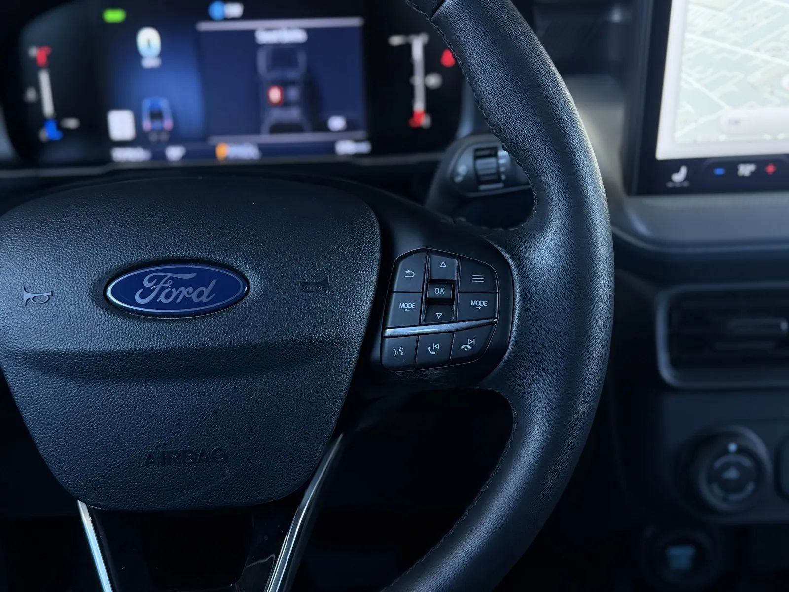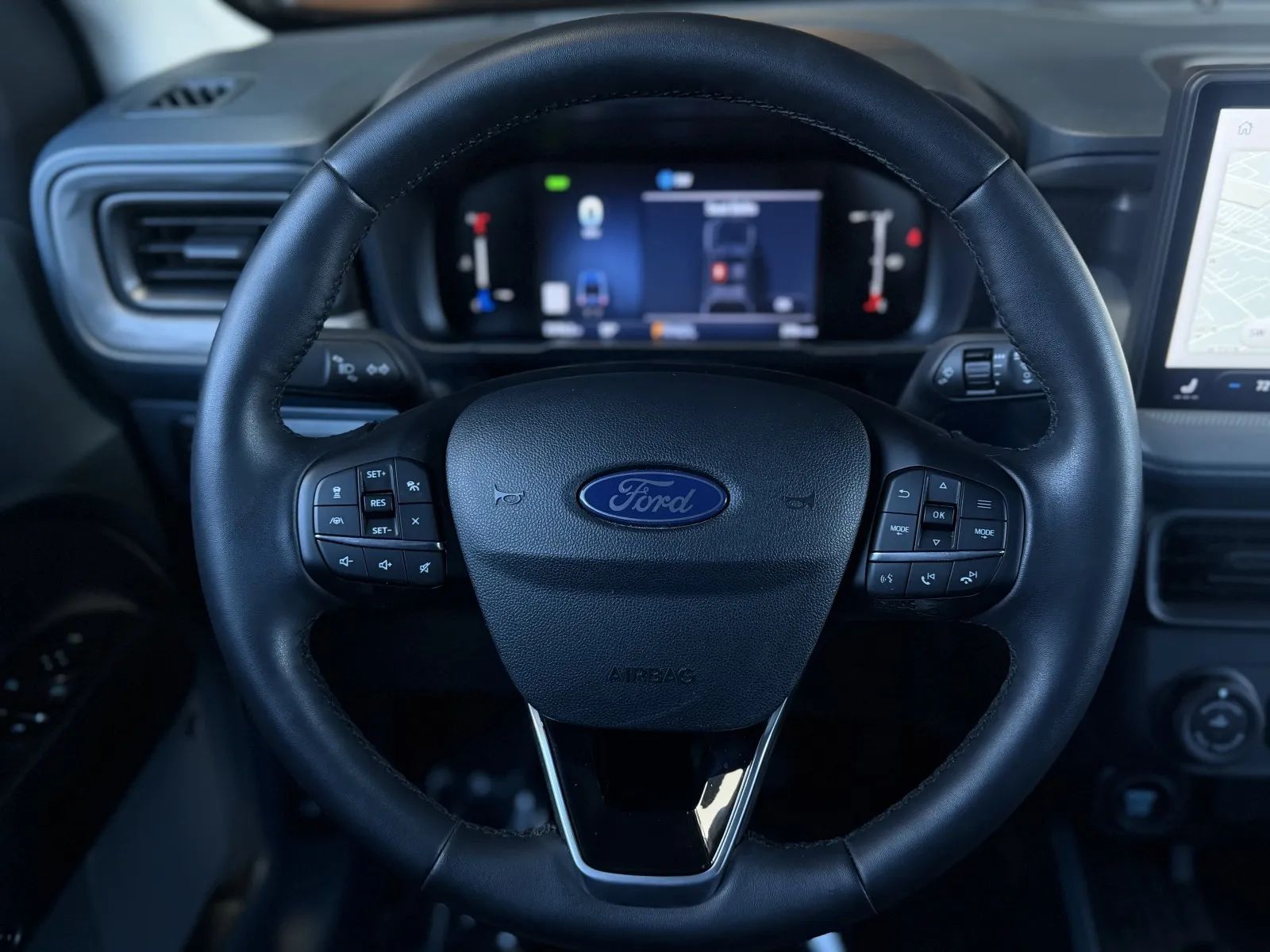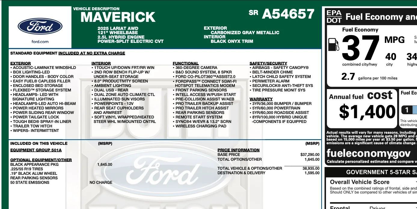 Rear Automatic emergency braking, Front Pedestrian Automatic emergency braking, Rear Pedestrian Automatic emergency braking, Front Automatic emergency braking, Intersection/junction Turn Automatic emergency braking, Evasive steering assist, Lane keeping assist, Surround View Camera system, Check rear seat reminder, Pedestrian Detection Pre-collision warning system, Pedestrian Detection Rear pre-collision warning system, Driver attention alert system, Audible Warning Pre-collision warning system, Visual Warning Pre-collision warning system, Adaptive Speed Limiting Traffic sign recognition, Sensor/alert Blind spot safety, Rear Cross traffic alert, Lane deviation sensors, Driver Knee airbags, Front Side airbags, Rear Side curtain airbags, Front Side curtain airbags, Front Parking sensors, Rear Parking sensors, Regenerative braking system, 4-wheel ABS, Emergency braking preparation, Anti-lockout Power door locks, Auto-locking Power door locks, Intersection/junction Turn Pre-collision warning system, Auto Off Electronic parking brake, Perimeter Alarm Anti-theft system, Trailer stability control, Ventilated Disc Rear brake, Alarm Anti-theft system, Braking assist, Hill holder control, Ventilated Disc Front brake, Dual Front airbags, Vehicle Immobilizer Anti-theft system, Power brakes, LATCH System Child seat anchors, Electronic brakeforce distribution, Stability control, Traction control, In Dash Rearview monitor, Occupant Sensing Passenger Airbag deactivation, Front Seatbelt pretensioners, Front Seatbelt force limiters, Front Emergency locking retractors, Post-collision Safety System Impact sensor, Alert System Impact sensor, Rear Emergency locking retractors, Roll stability control, Front Seatbelt warning sensor, Semi-automatic Adaptive stop and go cruise control, Lane Centering Autonomous lane guidance, Adaptive cruise control, Proximity Entry System Multi-function remote, Heated steering wheel, Automatic Climate Control Front air conditioning, Leatherette Upholstery, Dual Front air conditioning zones, 8 Driver seat power adjustments, Front Wireless charging station, Push-button start, Heated Driver seat, Remote engine start, Heated Passenger seat, In Bed Storage, Variable/speed-proportional Power steering, Bucket Front seat, 8 In. Instrument cluster screen size, Carpet Floor mat material, Bench Rear seat, Air filtration, Capless fuel filler system, Folds Up Rear seat folding, USB Front Power outlet(s), USB-C Front Power outlet(s), USB Rear Power outlet(s), USB-C Rear Power outlet(s), 12V Front Power outlet(s), Tilt And Telescopic Steering wheel, Front Floor mats, Multi-function display, Lumbar Passenger seat manual adjustments, Front Console With Armrest And Storage Center console, Compass, Rear Center With Cupholders Armrests, 4 One-touch windows, External temperature display, MPG Fuel economy display, Range Fuel economy display, 6 Passenger seat manual adjustments, Front Reading lights, Tachometer Gauge, Manual Day/night Rearview mirror, Lumbar Driver seat power adjustments, Height Driver seat power adjustments, Front Cupholders, Maintenance Due Warnings and reminders, Front Overhead console, Dual Illuminating Vanity mirrors, Rear Cupholders, Panic Alarm Multi-function remote, Audio Steering wheel mounted controls, Under Rear Seats Storage, Carpet Floor material, Cruise Control Steering wheel mounted controls, Phone Steering wheel mounted controls, Front Seatback Storage, Polished Aluminum Alloy Wheels, LED Headlights, Auto High Beam Dimmer Headlights, LED Daytime running lights, Spray-on Pickup bed liner, LED Taillights, Power Horizontal Pickup sliding rear window, Safety Reverse Power windows, Power Locking Tailgate, Power Side mirror adjustments, Heated Side mirrors, Acoustic Windshield Laminated glass, Steel Spare wheel, Rear Window defogger, Variable Intermittent Front wipers, Rear privacy glass, LED Pickup bed light, Tire Pressure Monitoring System, Black With Chrome Accents Grille color, Auto On/off Headlights, Auto Delay Off Headlights, Temporary Spare tire size, Wiper Activated Headlights, Black Rear bumper color, Black Window trim, Black Mirror color, Manual Folding Side mirror adjustments, Black Front bumper color, Hotspot Wi-Fi, Touch Screen Display Navigation system, Voice Operated Navigation system, Bang & Olufsen Premium brand, 13.2 In. Infotainment screen size, Apple CarPlay Smartphone integration, Android Auto Smartphone integration, FordPass Connect Smart device app compatibility, Bluetooth Wireless data link, Voice Operated Hands-free phone call integration, Voice Operated Radio, Bluetooth Auxiliary audio input, HD Radio Radio, Engine Start Smart device app function, Touch Screen Display Radio, 1 Subwoofer, 7 Total speakers, Real Time Traffic Navigation data, App Marketplace Integration Connected in-car apps, Voice Operated Electronic messaging assistance, SiriusXM Satellite radio, Digital sound processing, USB Auxiliary audio input, IPod/iPhone Auxiliary audio input, Vehicle Location Smart device app function, Lock Operation Smart device app function, SYNC Infotainment, Maintenance Status Smart device app function, AM/FM Radio, Radio data system, Speed sensitive volume control, Google POIs Connected in-car apps, Google Search Connected in-car apps, Straight Line And Turning Automated trailer backup steering, Trailer brake controller, Auto start/stop, Class III Trailer hitch, 4-pin Trailer wiring, 7-pin Trailer wiring, On Demand 4WD, Receiver Hitch Trailer hitch, Drive mode selector, Independent Front suspension classification, Independent Rear suspension classification, MacPherson Front struts, Multi-link Rear suspension, Diameter 23 Mm Rear stabilizer bar, Diameter 27 Mm Front stabilizer bar, Tow/Haul mode, Battery saver, Twin-tube Gas Rear shock, Twin-tube Gas Front shock, Tie-down Anchors Pickup bed cargo management, 1.1 KWh EV battery capacity