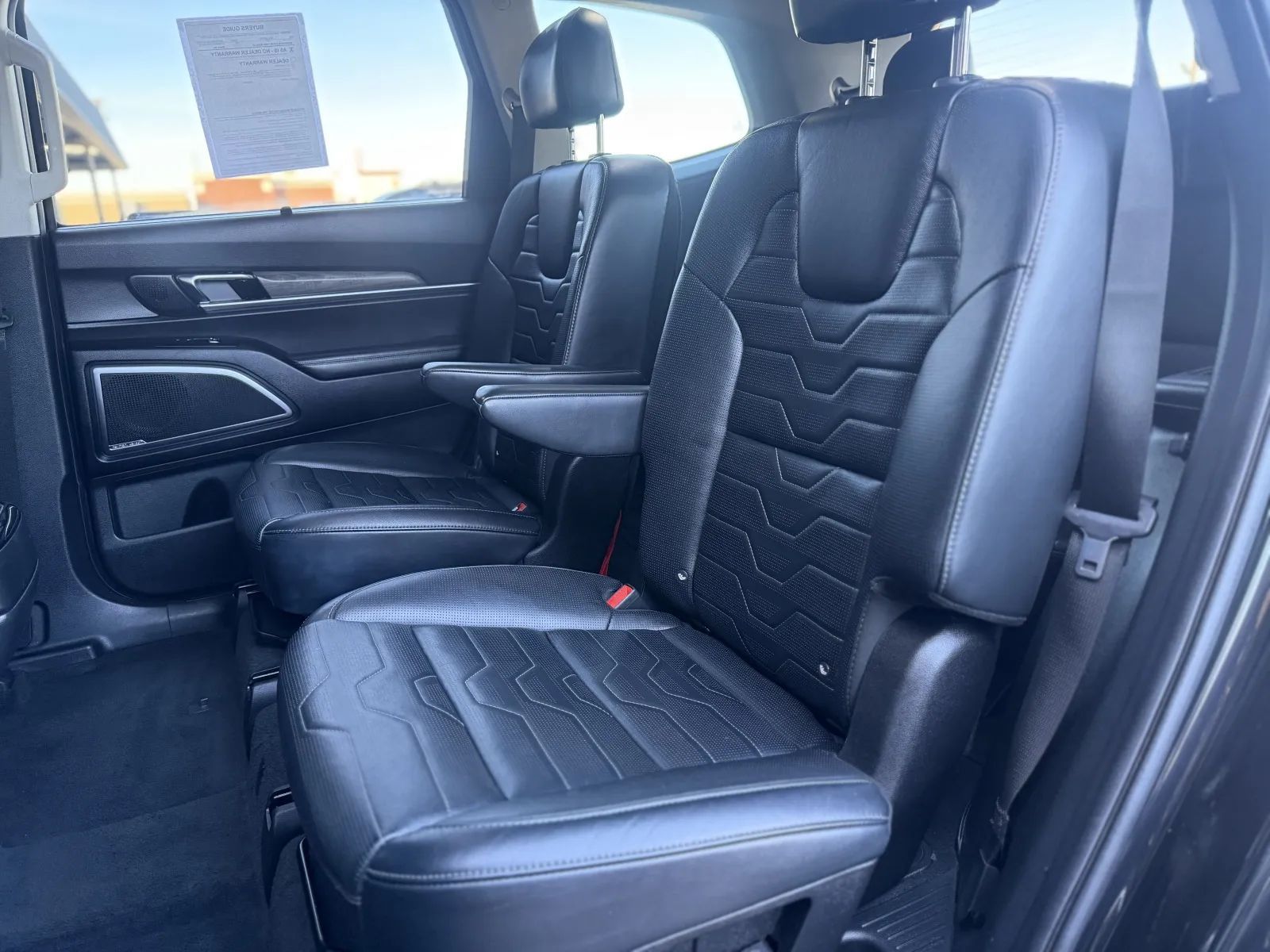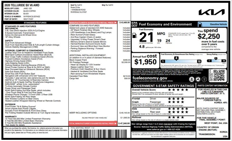Front Pedestrian Automatic emergency braking, Front Automatic emergency braking, Lane keeping assist, Surround View Camera system, Check rear seat reminder, Pedestrian Detection Pre-collision warning system, Driver attention alert system, Audible Warning Pre-collision warning system, Visual Warning Pre-collision warning system, Vehicle exit safety system, Adaptive Speed Limiting Traffic sign recognition, Camera Display Blind spot safety, Rear Cross traffic alert, Lane deviation sensors, Driver Knee airbags, Front Side airbags, Rear Side curtain airbags, Front Side curtain airbags, Third Row Side curtain airbags, Front Parking sensors, Rear Parking sensors, 4-wheel ABS, Anti-lockout Power door locks, Cornering brake control, Auto-locking Power door locks, Hill Descent Off-road driving assist, Auto Off Electronic parking brake, Trailer stability control, Alarm Anti-theft system, Braking assist, Hill holder control, Disc Rear brake, Ventilated Disc Front brake, Dual Front airbags, Vehicle Immobilizer Anti-theft system, Power brakes, LATCH System Child seat anchors, Electronic brakeforce distribution, Stability control, Traction control, In Dash Rearview monitor, Occupant Sensing Passenger Airbag deactivation, Front Seatbelt pretensioners, Front Seatbelt force limiters, Front Emergency locking retractors, Roll stability control, Front Seatbelt warning sensor, Fully Automated Adaptive stop and go cruise control, Lane Centering Autonomous lane guidance, Premium Leather Upholstery, Leather-trimmed Upholstery, Adaptive cruise control, Head-up display, Proximity Entry System Multi-function remote, Ventilated Driver seat, Ventilated Passenger seat, Heated steering wheel, 12 Driver seat power adjustments, Automatic Climate Control Rear air conditioning, Leather Steering wheel trim, Automatic Climate Control Front air conditioning, Driver Seat Memorized settings, Side Mirrors Memorized settings, Dual Front air conditioning zones, Front Wireless charging station, Push-button start, Heated Driver seat, Leather Shift knob trim, Heated Passenger seat, Homelink - Garage Door Opener Universal remote transmitter, Auto-dimming Rearview mirror, Woodgrain Interior accents, Dual Level Cargo Area Storage, 8 Passenger seat power adjustments, Variable/speed-proportional Power steering, Bucket Front seat, Humidity/dewpoint sensors, Captains Chairs Rear seat, Chrome Interior accents, 40-60 Split Bench Third row seat, Leatherette Door trim, Leatherette Center console trim, 2 Driver Memorized settings, Side Window Sunshade, Air filtration, One-touch Fold Flat Rear seat folding, 7 In. Instrument cluster screen size, Flat Third row seat folding, Stainless Steel Foot pedal trim, Split Third row seat folding, Hard Cargo cover, 12V Rear Power outlet(s), 12V Front Power outlet(s), Tilt And Telescopic Steering wheel, Third Row Rear vents, Multi-function display, Sliding Rear seat, Front Console With Armrest And Storage Center console, Compass, 4 One-touch windows, External temperature display, MPG Fuel economy display, Range Fuel economy display, Front Reading lights, Tachometer Gauge, Reclining Rear seat manual adjustments, Door Courtesy lights, Rear Reading lights, Lumbar Driver seat power adjustments, Reclining Passenger seat power adjustments, Reclining Driver seat power adjustments, Scuff Plate Door sill trim, Height Driver seat power adjustments, Height Passenger seat power adjustments, Front Cupholders, Front Overhead console, Dual Illuminating Vanity mirrors, Rear Cupholders, Cargo area light, Panic Alarm Multi-function remote, Audio Steering wheel mounted controls, Carpet Floor material, Cruise Control Steering wheel mounted controls, Phone Steering wheel mounted controls, Front Seatback Storage, Voice Control Steering wheel mounted controls, Single Rear air conditioning zones, Sunglasses Holder Storage, Trunk Release Multi-function remote, Power Glass Moonroof / Sunroof, Painted Aluminum Alloy Wheels, Sensor-activated Rear trunk/liftgate, LED Headlights, Fixed Glass Rear moonroof / sunroof, Power Operated Rear trunk/liftgate, Rain Sensing Front wipers, Auto High Beam Dimmer Headlights, LED Daytime running lights, Dual Tip Exhaust, LED Taillights, Power Folding Side mirror adjustments, LED Front fog lights, Power Sunshade Moonroof / Sunroof, Safety Reverse Power windows, Power Side mirror adjustments, Heated Side mirrors, Acoustic Windshield Laminated glass, Steel Spare wheel, Chrome Roof rails, Intermittent Rear wiper, Rear Window defogger, Variable Intermittent Front wipers, Rear privacy glass, With Washer Rear wiper, Tire Pressure Monitoring System, Integrated Turn Signals Side mirrors, Roofline Rear spoiler, Reverse Gear Tilt Side mirror adjustments, Solar-tinted glass, Auto On/off Headlights, Rear Skid plate(s), Front Skid plate(s), Chrome Window trim, Auto Delay Off Headlights, Tilt/slide Moonroof / Sunroof, Temporary Spare tire size, One-touch Open/close Moonroof / Sunroof, Anti-trapping Moonroof / Sunroof, Chrome Exhaust tip color, Black Fender lip moldings, Moonroof / Sunroof wind deflector, Chrome Surround Grille color, Fixed Liftgate window, Liftgate Rear trunk/liftgate, Black Rear bumper color, Silver Grille color, Touch Screen Display Navigation system, Voice Operated Navigation system, Harman/kardon Premium brand, Apple CarPlay Smartphone integration, Android Auto Smartphone integration, Kia MyUVO Smart device app compatibility, 10.25 In. Infotainment screen size, Bluetooth Wireless data link, Voice Operated Hands-free phone call integration, Voice Operated Radio, Bluetooth Auxiliary audio input, 5.1 Surround sound, Pandora Internet radio app, 9 Total speakers, Touch Screen Display Radio, 1 Subwoofer, Real Time Traffic Navigation data, With Read Function Electronic messaging assistance, Voice Operated Electronic messaging assistance, SiriusXM Satellite radio, Digital sound processing, USB Auxiliary audio input, IPod/iPhone Auxiliary audio input, Vehicle Location Smart device app function, UVO Infotain