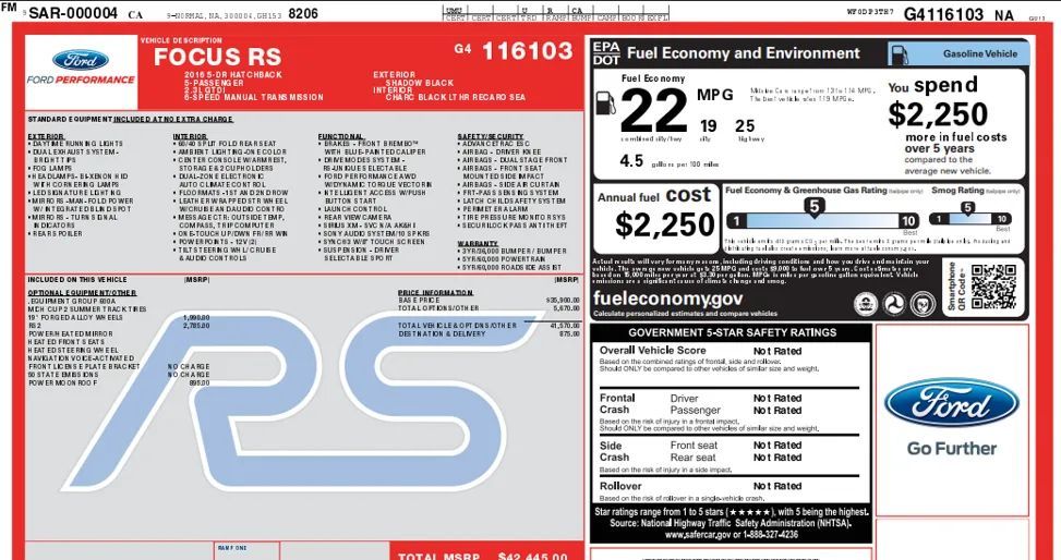 Leather-trimmed Upholstery, Proximity Entry System Multi-function remote, Leather Steering wheel trim, Automatic Climate Control Front air conditioning, Dual Front air conditioning zones, Push-button start, Leather Shift knob trim, Sport Bucket Front seat, Cruise control, Ambient lighting, Alloy Shift knob trim, 60-40 Split Bench Rear seat, Carpet Floor mat material, Air filtration, Capless fuel filler system, Aluminum Foot pedal trim, Split Rear seat folding, Two 12V Power outlet(s), Tilt And Telescopic Steering wheel, Second Row Rear vents, Rear Floor mats, Front Floor mats, Multi-function display, Front Console With Armrest And Storage Center console, Power steering, 4 One-touch windows, External temperature display, MPG Fuel economy display, Range Fuel economy display, 6 Driver seat manual adjustments, Front Reading lights, Tachometer Gauge, Manual Day/night Rearview mirror, Rear Reading lights, Scuff Plate Door sill trim, 4.2 In. Instrument cluster screen size, Front Cupholders, Dual Illuminating Vanity mirrors, Cargo area light, Panic Alarm Multi-function remote, Audio Steering wheel mounted controls, Carpet Floor material, Cruise Control Steering wheel mounted controls, Front Seatback Storage, Boost Gauge, Trunk Release Multi-function remote, Aluminum Alloy Wheels, Cornering Headlights, HID/Xenon Headlights, LED Daytime running lights, Dual Tip Exhaust, Power windows, Power Side mirror adjustments, Acoustic Windshield Laminated glass, Front fog lights, Tire Sealant Spare tire kit, Inflator Kit Spare tire kit, Approach Lamps Exterior entry lights, Intermittent Rear wiper, Rear Window defogger, Variable Intermittent Front wipers, With Washer Rear wiper, Tire Pressure Monitoring System, Integrated Turn Signals Side mirrors, Roofline Rear spoiler, Auto On/off Headlights, Fixed Liftgate window, Liftgate Rear trunk/liftgate, Black Window trim, Manual Folding Side mirror adjustments, Black Grille color, Black Headlight bezel color, Metallic Exhaust tip color, Brembo Premium brakes, Driver Knee airbags, Rearview Camera system, Front Side airbags, Rear Side curtain airbags, Front Side curtain airbags, 4-wheel ABS, Power door locks, Cornering brake control, Programmable safety key, Painted brake calipers, Perimeter Alarm Anti-theft system, Braking assist, Hill holder control, Disc Rear brake, Ventilated Disc Front brake, Dual Front airbags, Vehicle Immobilizer Anti-theft system, Power brakes, LATCH System Child seat anchors, Electronic brakeforce distribution, Stability control, Traction control, In Dash Rearview monitor, Occupant Sensing Passenger Airbag deactivation, Front Seatbelt pretensioners, Disc Front brake, Door Unlock Impact sensor, Front Seatbelt warning sensor, Sony Premium brand, Bluetooth Wireless data link, Voice Operated Radio, Bluetooth Auxiliary audio input, HD Radio Radio, 9 Total speakers, 8 In. Infotainment screen size, 390 Watts, Touch Screen Display Radio, 1 Subwoofer, SiriusXM Satellite radio, USB Auxiliary audio input, SYNC Infotainment, Single Disc In-Dash CD, MP3 Playback In-Dash CD, AM/FM Radio, Radio data system, Auto start/stop, Rear Limited slip differential, Sport Tuned suspension, Full Time 4WD, Drive mode selector, Independent Front suspension classification, Independent Rear suspension classification, MacPherson Front struts, Short And Long Arm Rear suspension, 590 CCA Battery rating, Diameter 20 Mm Rear stabilizer bar, Battery saver, Diameter 24 Mm Front stabilizer bar