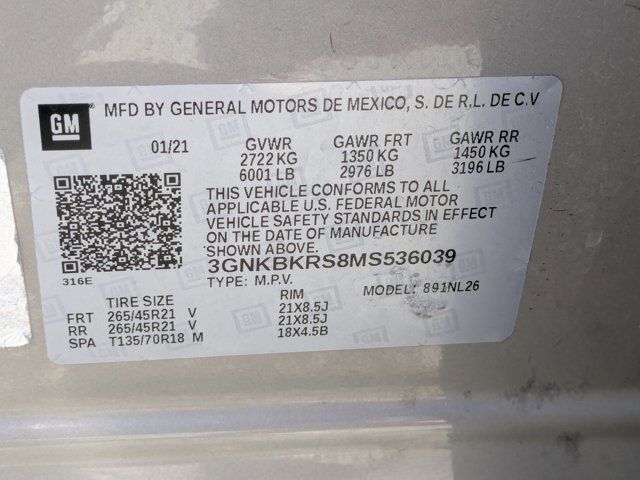 ADAPTIVE CRUISE CONTROL,WIRELESS CHARGING,SUNROOF POWER PANORAMIC TILT-SLIDING WITH POWER SUNSHADE,LPO CARGO SHADE RETRACTABLE,AXLE 3.49 FINAL DRIVE RATIO,LPO CARGO NET VERTICAL,RS PREFERRED EQUIPMENT GROUP Includes Standard Equipment,SEATS HEATED REAR OUTBOARD SEATING POSITIONS,REAR CAMERA MIRROR includes (CWA) Rear Camera Mirror Washer,TRANSMISSION 9-SPEED AUTOMATIC ELECTRONICALLY-CONTROLLED with overdrive includes Driver Shift Control (STD),WHEELS 21 (53.3 CM) GLOSS BLACK ALUMINUM,PEWTER METALLIC,SAFETY ALERT SEAT,ENHANCED AUTOMATIC EMERGENCY BRAKING,REAR CAMERA MIRROR WASHER,LICENSE PLATE FRONT MOUNTING PACKAGE (will be forced on orders with ship-to states that require a front license plate),ENHANCED CONVENIENCE PACKAGE includes (UQA) Bose premium 8-speaker system (AAB) memory settings (KA6) rear outboard heated seats (KU9) driver and front passenger ventilated seats and (N38) power tilt and telescoping steering column,STEERING COLUMN POWER TILT AND TELESCOPING,JET BLACK PERFORATED LEATHER-APPOINTED SEAT TRIM,AUDIO SYSTEM FEATURE BOSE PREMIUM 8-SPEAKER SYSTEM with amplifier center instrument panel speaker and subwoofer,ENGINE 3.6L V6 SIDI DOHC WITH VARIABLE VALVE TIMING (VVT) and Active Fuel Management with Stop/Start (308 hp [229 kW] @ 6600 rpm 270 lb-ft of torque [366 N-m] @ 5000 rpm) (STD),HD SURROUND VISION,SEATS FRONT BUCKETS (STD),MEMORY SETTINGS recalls 2 driver presets for 8-way power seat outside mirrors and power tilt and telescopic steering column,SEATS VENTILATED DRIVER AND FRONT PASSENGER,DRIVER CONFIDENCE II PACKAGE includes (K4C) Wireless Charging (UV2) HD Surround Vision (DRZ) Rear Camera Mirror (KSG) Adaptive Cruise Control (UGN) Enhanced Automatic Emergency Braking (HS1) Safety Alert Seat and (T4L) LED headlamps,AUDIO SYSTEM CHEVROLET INFOTAINMENT 3 PLUS SYSTEM with connected Navigation 8 diagonal HD color touchscreen AM/FM stereo Bluetooth audio streaming for 2 active devices Apple CarPlay and Android Auto capable enhanced voice recognition in-vehicle apps cloud connected personalization for select infotainment and vehicle settings. Subscription required for enhanced and connected services after trial period. (STD),LPO CARGO PACKAGE includes (VRS) retractable cargo shade LPO and (W2D) vertical cargo net LPO,HEADLAMPS LED,TIRES P265/45R21 ALL-SEASON BLACKWALL,Lane Departure Warning,Lane Keeping Assist,Front Collision Mitigation,Front Collision Warning,Automatic Highbeams,All Wheel Drive,All Wheel Drive,ABS,4-Wheel Disc Brakes,Aluminum Wheels,Tires - Front Performance,Tires - Rear Performance,Temporary Spare Tire,Automatic Highbeams,Automatic Headlights,Heated Mirrors,Power Mirror(s),Integrated Turn Signal Mirrors,Privacy Glass,Intermittent Wipers,Variable Speed Intermittent Wipers,Intermittent Wipers,Remote Trunk Release,Power Liftgate,Hands-Free Liftgate,AM/FM Stereo,Navigation System,MP3 Capability,Bluetooth Connection,Auxiliary Audio Input,Smart Device Integration,Satellite Radio,Requires Subscription,Satellite Radio,Requires Subscription,Bluetooth Connection,WiFi Hotspot,Bucket Seats,Leather Seats,Heated Front Seat(s),Power Driver Seat,Power Passenger Seat,MP3 Capability,Auxiliary Audio Input,MP3 Capability,Auxiliary Audio Input,Floor Mats,Leather Steering Wheel,Heated Steering Wheel,Adjustable Steering Wheel,Power Windows,Power Door Locks,Keyless Entry,Power Door Locks,Keyless Start,Remote Engine Start,Universal Garage Door Opener,Cruise Control,Security System,Climate Control,Multi-Zone A/C,A/C,Rear Defrost,Auto-Dimming Rearview Mirror,Driver Vanity Mirror,Passenger Vanity Mirror,Driver Illuminated Vanity Mirror,Passenger Illuminated Visor Mirror,Front Collision Mitigation,Traction Control,Stability Control,Daytime Running Lights,Driver Air Bag,Passenger Air Bag,Front Head Air Bag,Rear Head Air Bag,Knee Air Bag,Passenger Air Bag Sensor,Telematics,Requires Subscription,Back-Up Camera,Rear Parking Aid,Cross-Traffic Alert,Blind Spot Monitor,Lane Departure Warning,Lane Keeping Assist,Front Collision Mitigation,Front Collision Warning,Front Collision Warning,Child Safety Locks,Driver Restriction Features,Tire Pressure Monitor,Tire Pressure Monitor