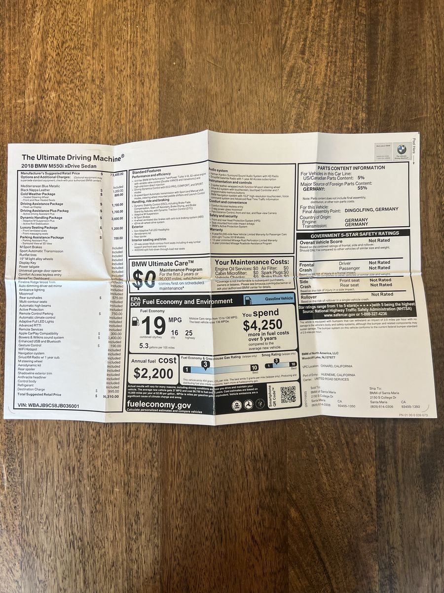 Front, rear & side cameras, Adaptive full LED headlights, Adaptive cruise control & Steering assist for commuting or long drives, Apple CarPlay, Gesture control, WiFi Hotspot enabled, BMW navigation system w/10.2-inch touchscreen, Power tailgate, Universal garage door opener, Fineline wood trim, Ambiance lighting, Moonroof, Programmable front seats for driver preferences, Massaging front seats, Rear sunshades, All-weather 5 series floor mats, Remote control parking…plus a lot more features