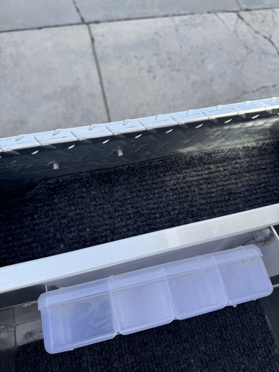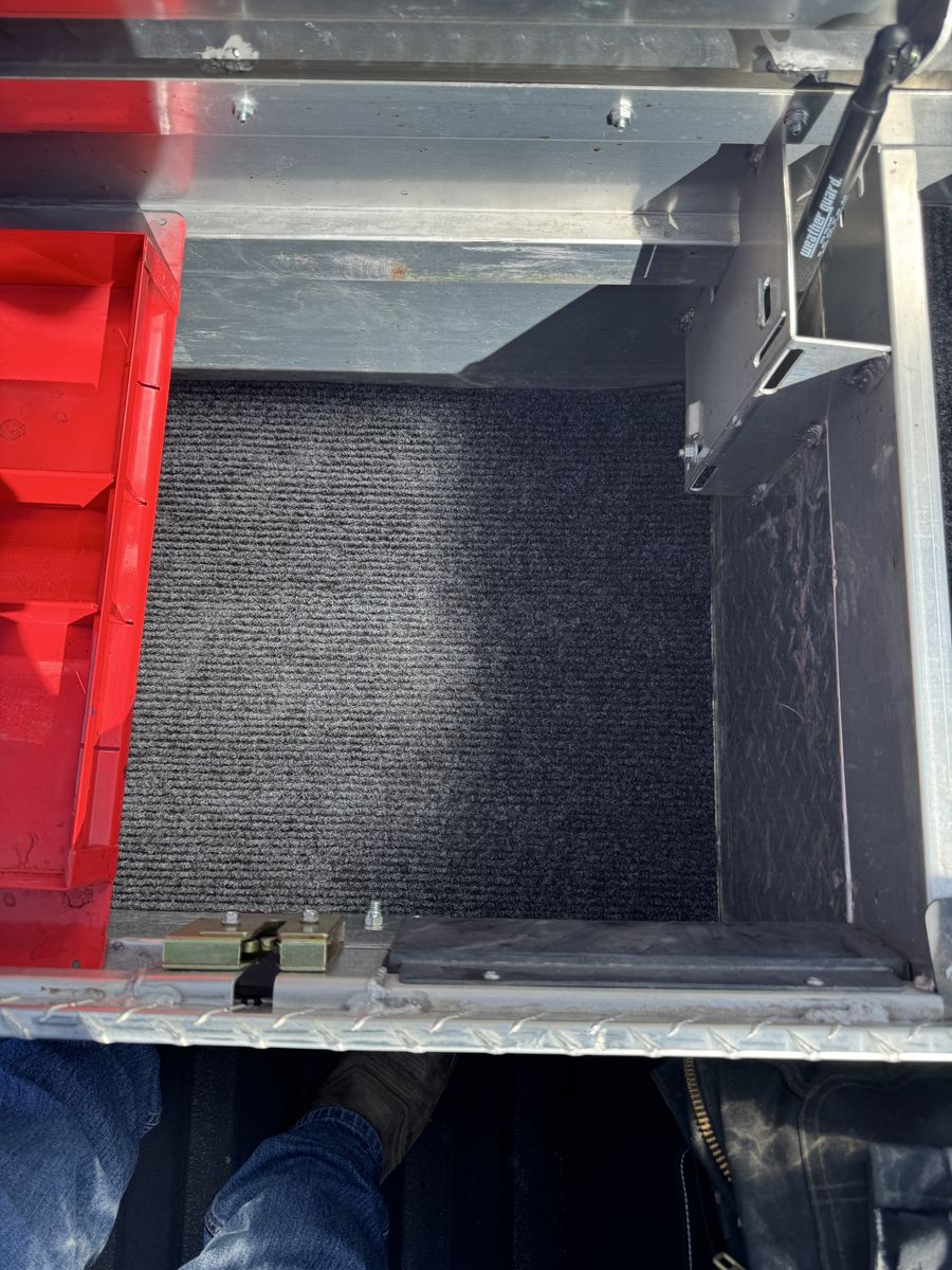 Full saddle style Weather Guard chrome, diamond plate, toolbox with tray and carpeted interior.