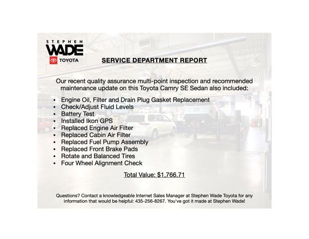 2019 Toyota Camry SE Sedan in Midnight Black Metallic with Black SofTex-Trimmed Sport Fabric. 2.5L Dynamic Force 4-Cylinder DOHC 16-Valve D-4S Dual Injection Engine w/Dual VVT-i, Direct Shift 8-Speed ECTi Transmission w/Sequential Shift Mode, Sport-Tuned Suspension.28/39 City/Highway MPG.2019 KBB.com Best Resale Value Award.CALL STEPHEN WADE TOYOTA: 435-241-3828.SERVICE REPORT: At Stephen Wade Toyota, we do more to insure we offer the most mechanically sound pre-owned vehicles with maintenance that is up to date. Our recent quality assurance multi-point inspection and recommended maintenance update on this Camry SE also included an engine oil, filter and drain plug gasket replacement, check/adjust fluid levels, battery test, installed Ikon GPS, replaced engine air filter, replaced cabin air filter, replaced fuel pump assembly, replaced front brake pads, rotate and balanced tires and a four wheel alignment check - a $1,766.71 value.MARKET REPORT: We use advanced software to shop the automotive marketplace nationwide everyday. This allows us to competitively offer you the best value one can find anywhere. Contact our knowledgeable Internet sales managers; Danny, Jessica or Wesley at Stephen Wade Toyota for a priority test drive, or for any information that would be helpful: 435-241-3828. You've got it made at Stephen Wade!
