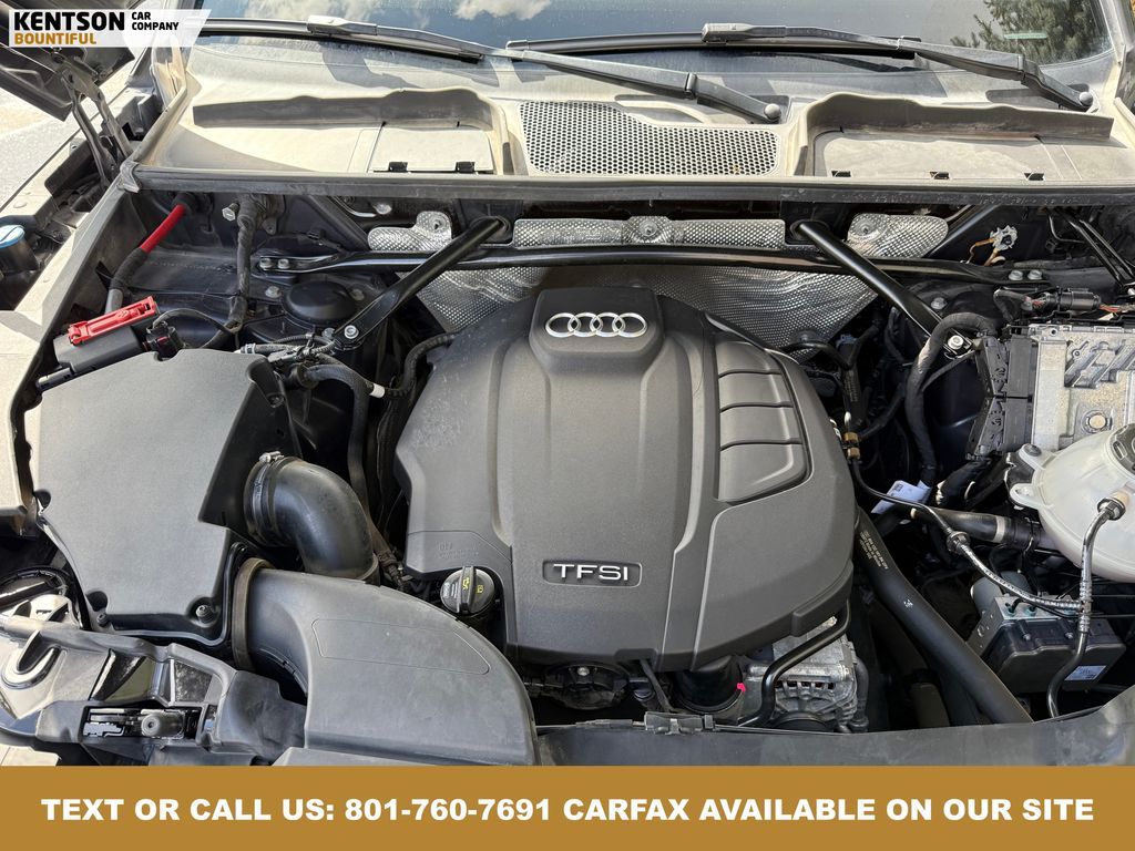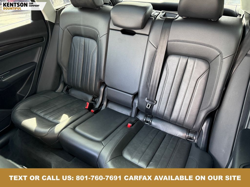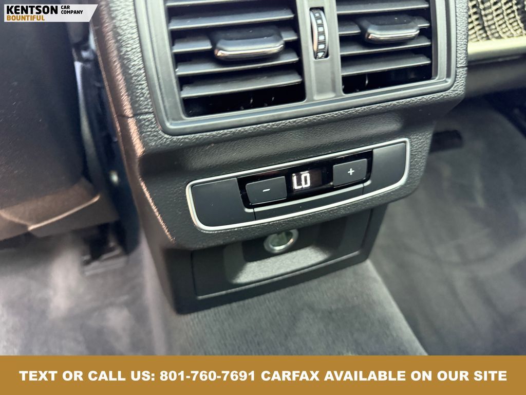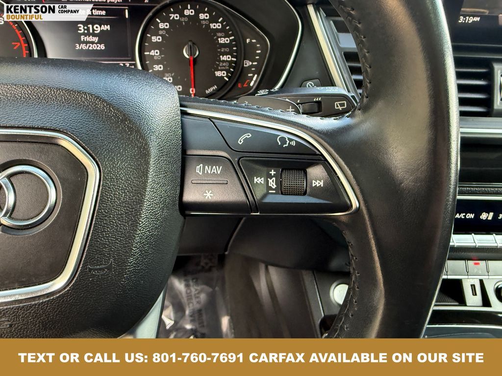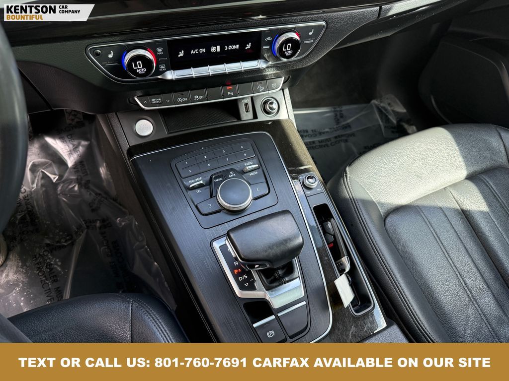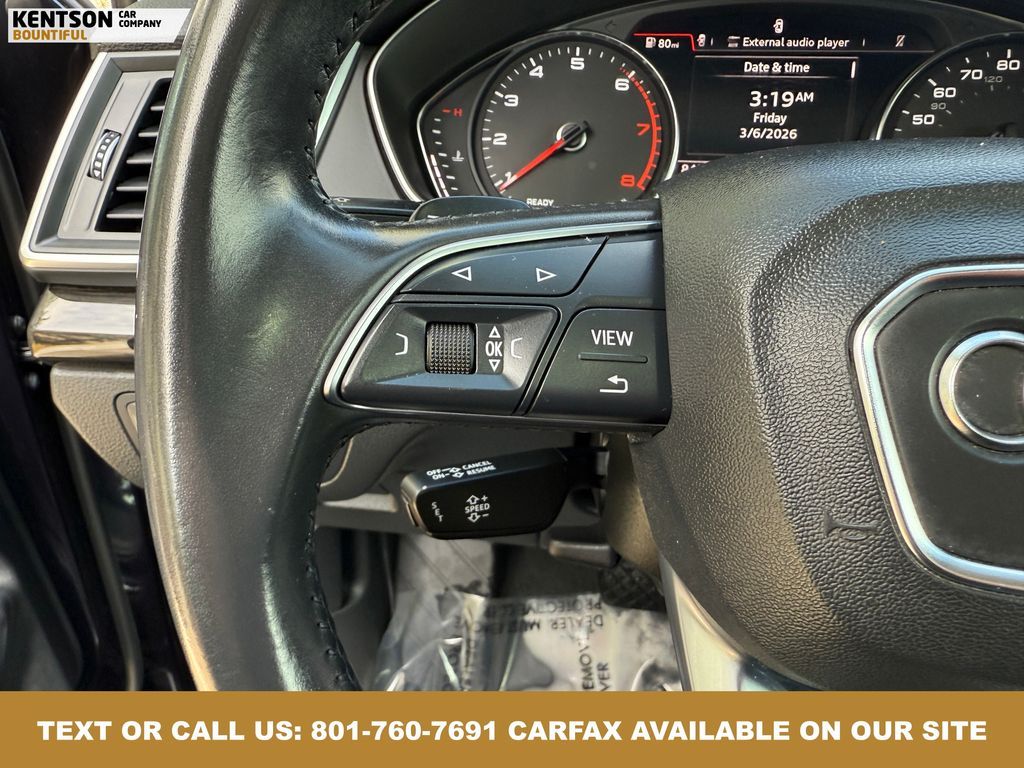 Convenience Package, Convenience Plus Package, Leather, 10 Speakers, 4-Wheel Disc Brakes, 5.302 Axle Ratio, ABS brakes, Air Conditioning, Alloy wheels, AM/FM radio, Audi smartphone interface (Apple CarPlay/Android Auto), Auto High-beam Headlights, Auto-dimming Rear-View mirror, Automatic temperature control, Brake assist, Bumpers: body-color, Compass, Delay-off headlights, Driver door bin, Driver vanity mirror, Dual front impact airbags, Dual front side impact airbags, Electronic Stability Control, Emergency communication system: Audi connect CARE, Exterior Parking Camera Rear, Four wheel independent suspension, Front anti-roll bar, Front Bucket Seats, Front Center Armrest, Front dual zone A/C, Front fog lights, Front reading lights, Garage door transmitter: HomeLink, Genuine wood console insert, Genuine wood dashboard insert, Genuine wood door panel insert, Heated 8-Way Power Front Bucket Seats, Heated door mirrors, Heated front seats, High intensity discharge headlights: Xenon plus, Illuminated entry, Leather Seating Surfaces, Leather Shift Knob, Leather steering wheel, Low tire pressure warning, Matte Black Roof Rails, Occupant sensing airbag, Outside temperature display, Overhead airbag, Overhead console, Panic alarm, Panoramic Sunroof, Passenger door bin, Passenger vanity mirror, Power door mirrors, Power driver seat, Power Liftgate, Power passenger seat, Power steering, Power windows, Radio data system, Radio: Audi Sound System w/7'' Display, Rain sensing wipers, Rear air conditioning, Rear anti-roll bar, Rear fog lights, Rear reading lights, Rear seat center armrest, Rear window defroster, Rear window wiper, Remote keyless entry, Roof rack, Security system, Speed control, Speed-sensing steering, Speed-Sensitive Wipers, Split folding rear seat, Spoiler, Steering wheel mounted audio controls, Tachometer, Telescoping steering wheel, Tilt steering wheel, Titanium Black Exterior Trim, Traction control, Trip computer, Turn signal indicator mirrors, Variably intermittent wipers, and Wheels: 18'' 5-Arm-Turbine Design.