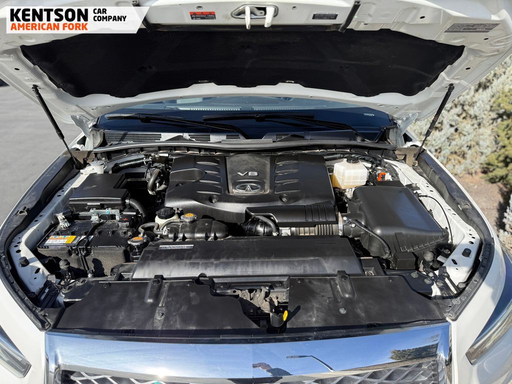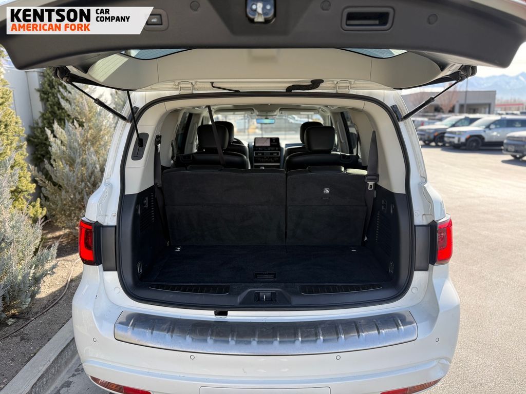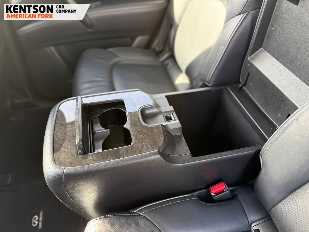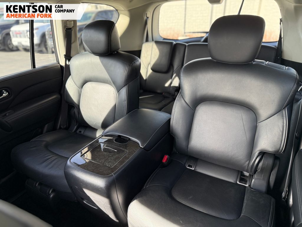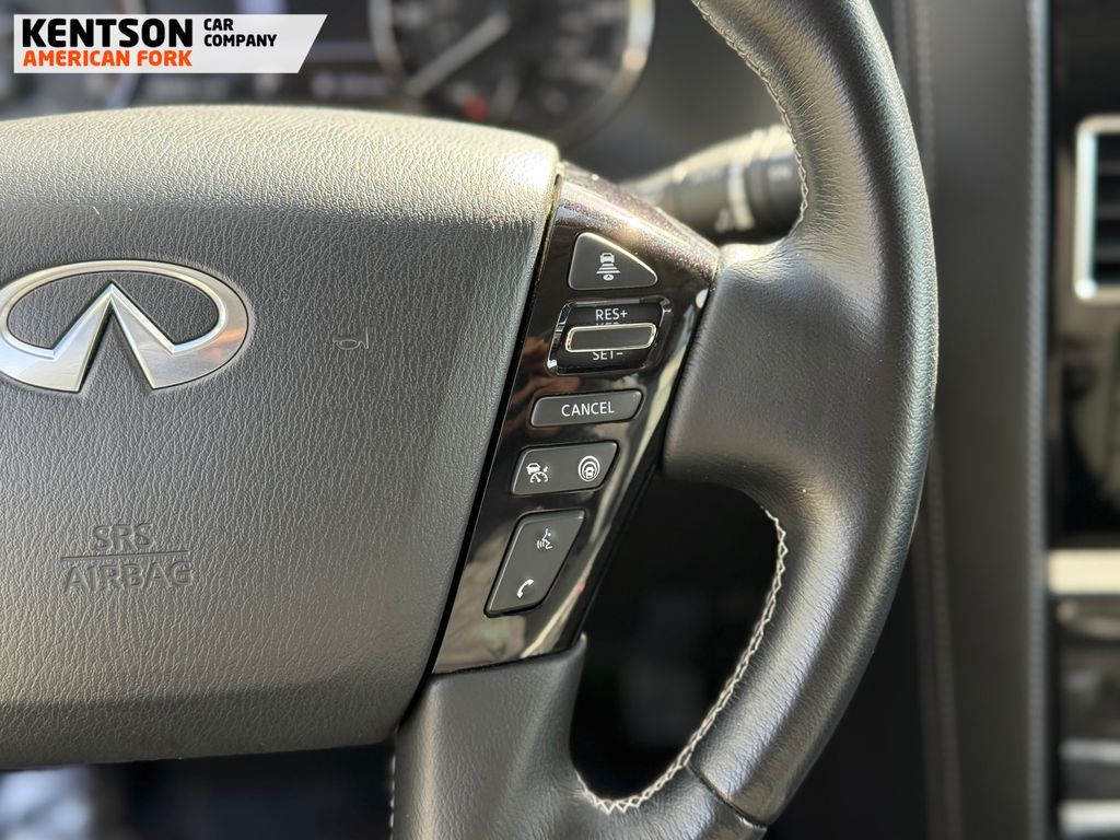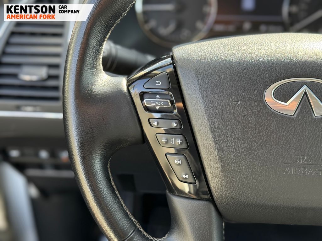 13 Speakers, 2.937 Axle Ratio, 20'' Aluminum Alloy Wheels, 3rd row seats: bench, 4-Wheel Disc Brakes, ABS brakes, Air Conditioning, Alloy wheels, AM/FM radio: SiriusXM, Anti-whiplash front head restraints, Apple CarPlay/Android Auto, Auto High-beam Headlights, Auto tilt-away steering wheel, Auto-dimming door mirrors, Auto-dimming Rear-View mirror, Auto-leveling suspension, Automatic temperature control, Brake assist, Bumpers: body-color, Compass, Delay-off headlights, Driver door bin, Driver vanity mirror, Dual front impact airbags, Dual front side impact airbags, Electronic Stability Control, Emergency communication system: INFINITI InTouch, Four wheel independent suspension, Front anti-roll bar, Front Bucket Seats, Front Center Armrest, Front dual zone A/C, Front fog lights, Front reading lights, Fully automatic headlights, Garage door transmitter: HomeLink, Heated door mirrors, Heated Front Bucket Seats, Heated front seats, Heated steering wheel, Illuminated entry, Leather Shift Knob, Leather steering wheel, Leather-Appointed Seats, Literature Kit, Low tire pressure warning, Memory seat, Navigation system: INFINITI InTouch Navigation, Occupant sensing airbag, Outside temperature display, Overhead airbag, Overhead console, Panic alarm, Passenger door bin, Passenger vanity mirror, Power door mirrors, Power driver seat, Power Liftgate, Power moonroof, Power passenger seat, Power steering, Power windows, Radio data system, Radio: Bose Premium Audio System w/13 Speakers, Rain sensing wipers, Rear air conditioning, Rear anti-roll bar, Rear reading lights, Rear seat center armrest, Rear window defroster, Rear window wiper, Reclining 3rd row seat, Remote keyless entry, Security system, Speed control, Speed-sensing steering, Split folding rear seat, Spoiler, Steering wheel memory, Steering wheel mounted audio controls, Tachometer, Telescoping steering wheel, Tilt steering wheel, Traction control, Trip computer, Turn signal indicator mirrors, Variably intermittent wipers, and Voltmeter.