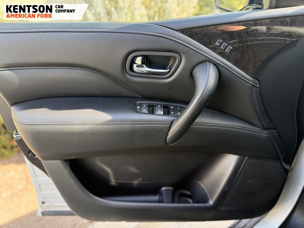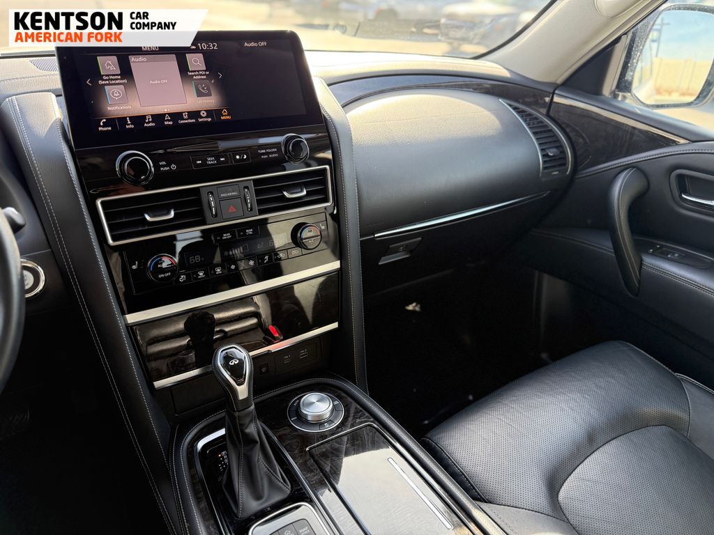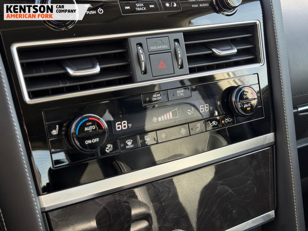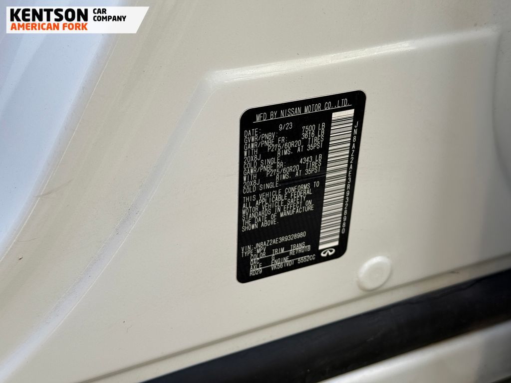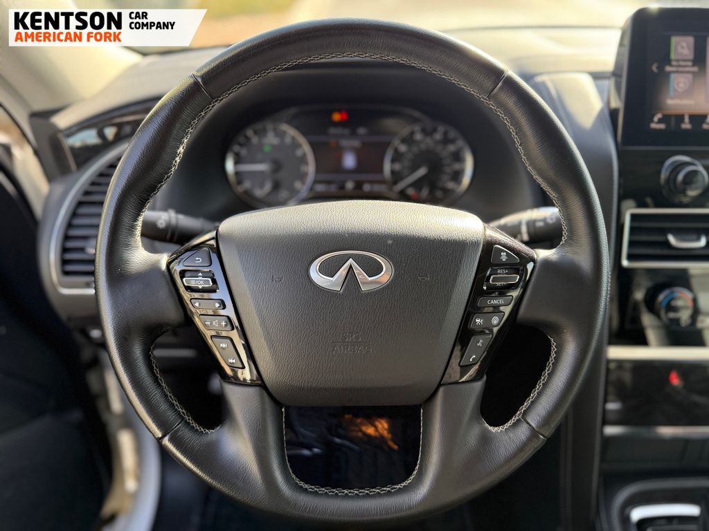 13 Speakers, 2.937 Axle Ratio, 20'' Aluminum Alloy Wheels, 3rd row seats: bench, 4-Wheel Disc Brakes, ABS brakes, Air Conditioning, Alloy wheels, AM/FM radio: SiriusXM, Anti-whiplash front head restraints, Apple CarPlay/Android Auto, Auto High-beam Headlights, Auto tilt-away steering wheel, Auto-dimming door mirrors, Auto-dimming Rear-View mirror, Auto-leveling suspension, Automatic temperature control, Brake assist, Bumpers: body-color, Compass, Delay-off headlights, Driver door bin, Driver vanity mirror, Dual front impact airbags, Dual front side impact airbags, Electronic Stability Control, Emergency communication system: INFINITI InTouch, Four wheel independent suspension, Front anti-roll bar, Front Bucket Seats, Front Center Armrest, Front dual zone A/C, Front fog lights, Front reading lights, Fully automatic headlights, Garage door transmitter: HomeLink, Heated door mirrors, Heated Front Bucket Seats, Heated front seats, Heated steering wheel, Illuminated entry, Leather Shift Knob, Leather steering wheel, Leather-Appointed Seats, Literature Kit, Low tire pressure warning, Memory seat, Navigation system: INFINITI InTouch Navigation, Occupant sensing airbag, Outside temperature display, Overhead airbag, Overhead console, Panic alarm, Passenger door bin, Passenger vanity mirror, Power door mirrors, Power driver seat, Power Liftgate, Power moonroof, Power passenger seat, Power steering, Power windows, Radio data system, Radio: Bose Premium Audio System w/13 Speakers, Rain sensing wipers, Rear air conditioning, Rear anti-roll bar, Rear reading lights, Rear seat center armrest, Rear window defroster, Rear window wiper, Reclining 3rd row seat, Remote keyless entry, Security system, Speed control, Speed-sensing steering, Split folding rear seat, Spoiler, Steering wheel memory, Steering wheel mounted audio controls, Tachometer, Telescoping steering wheel, Tilt steering wheel, Traction control, Trip computer, Turn signal indicator mirrors, Variably intermittent wipers, and Voltmeter.