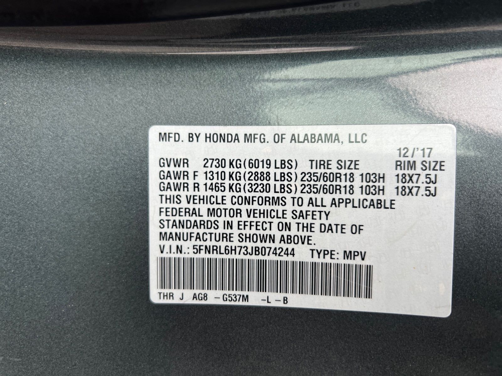 Gray 2018 Honda Odyssey EX-L FWD 9-Speed Automatic 3.5L V6 SOHC i-VTEC 24V Passed Inspection, Recently Detailed, Recent Oil Change.