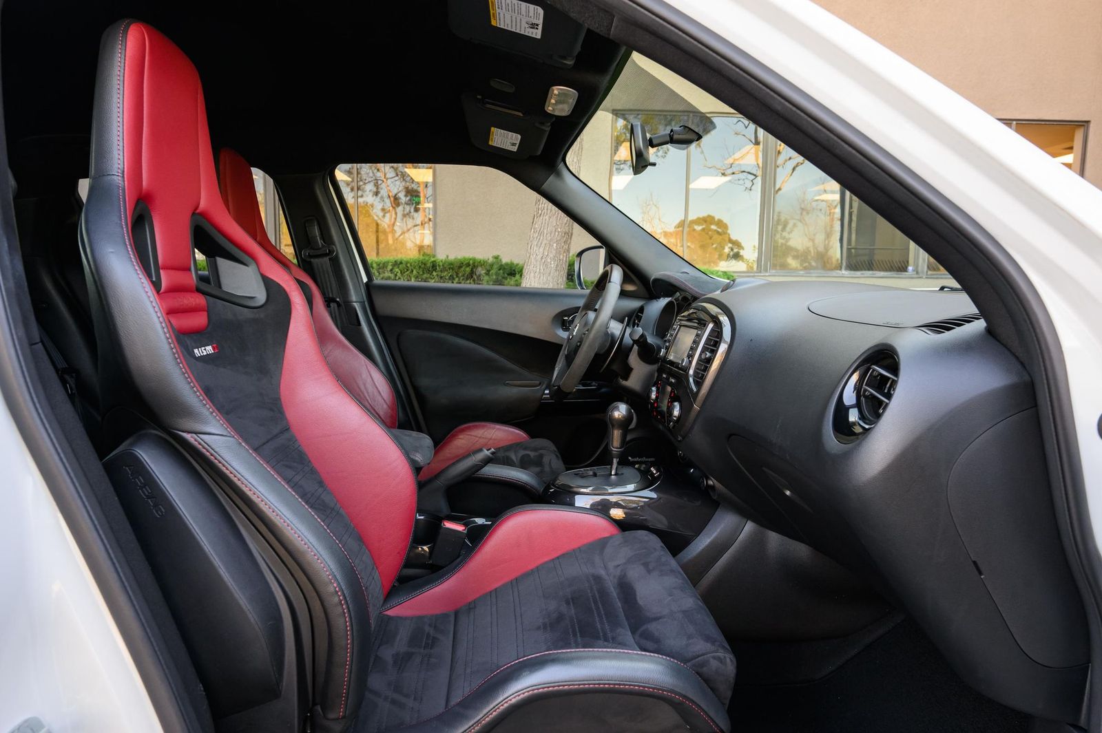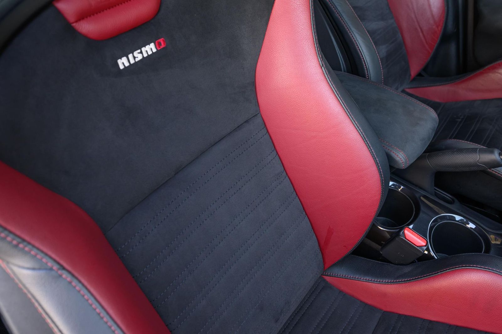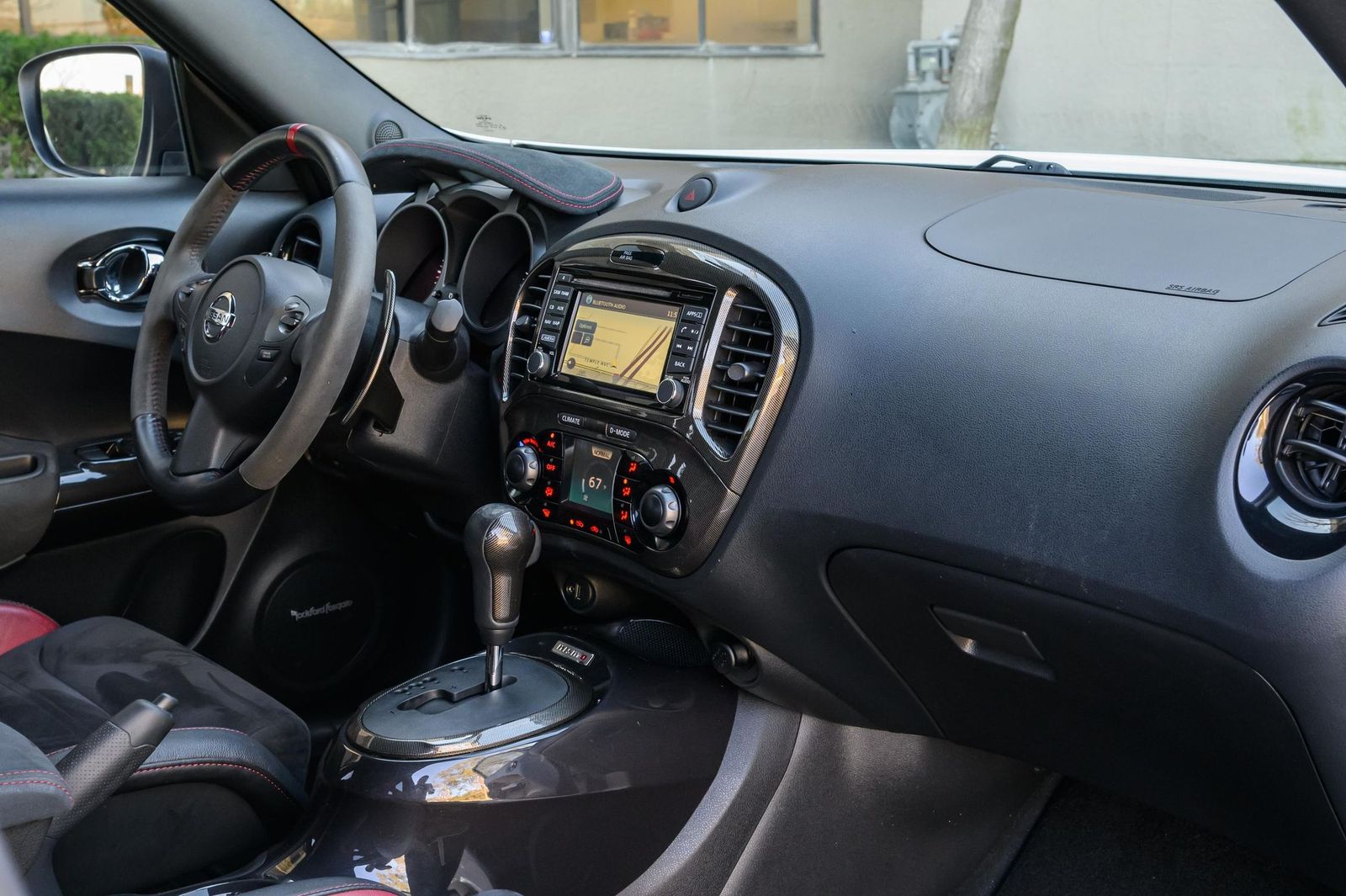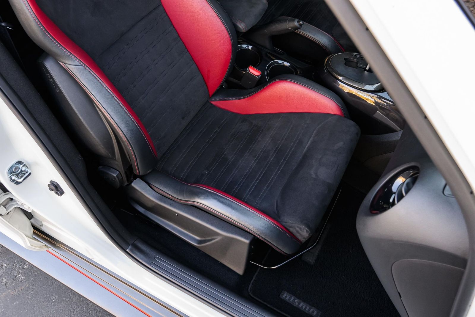 Factory equipment includes 18-inch alloy wheels, a NISMO-tuned suspension system, a NISMO-tuned steering system, a NISMO RS performance exhaust system, NISMO RS red brake calipers, a NISMO RS-specific body kit, leather and synthetic suede upholstery, Recaro front sport seats, leather and Alcantara-wrapped steering wheel, a 5.8-inch infotainment system, a Rockford Fosgate ecoPUNCH premium audio system, a navigation system, and an around view monitor, among others listed below. Modifications reported by the selling dealer are limited to wheel locks and partial paint protection film on the doors.