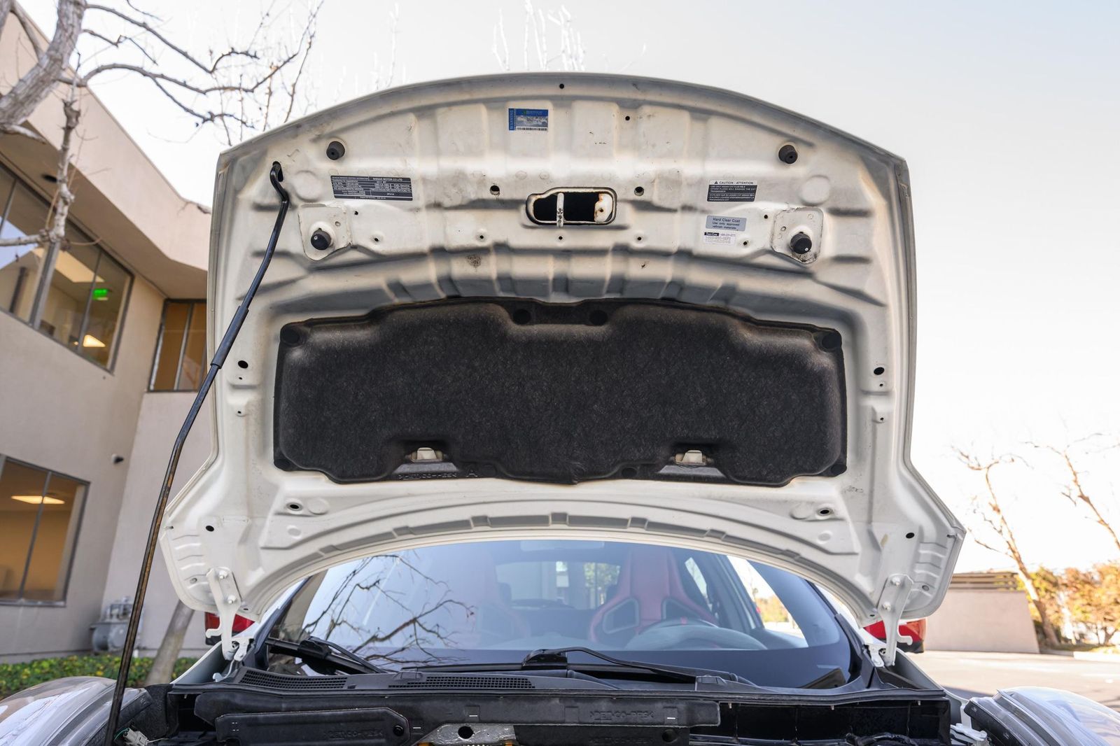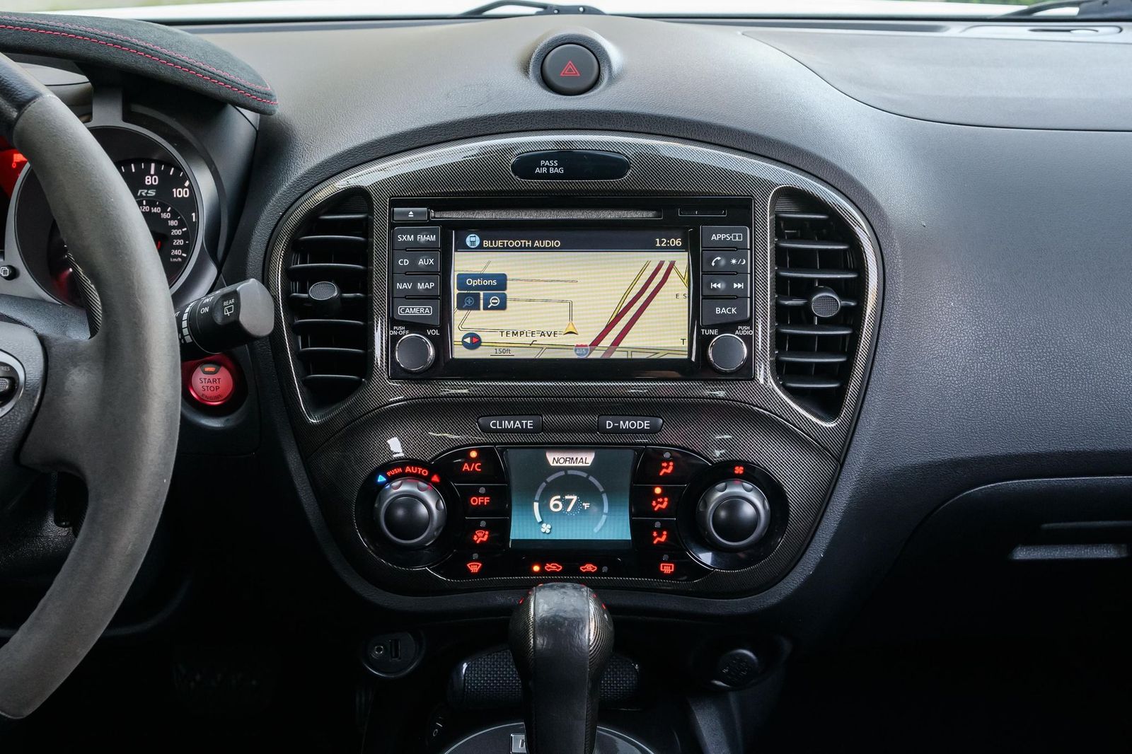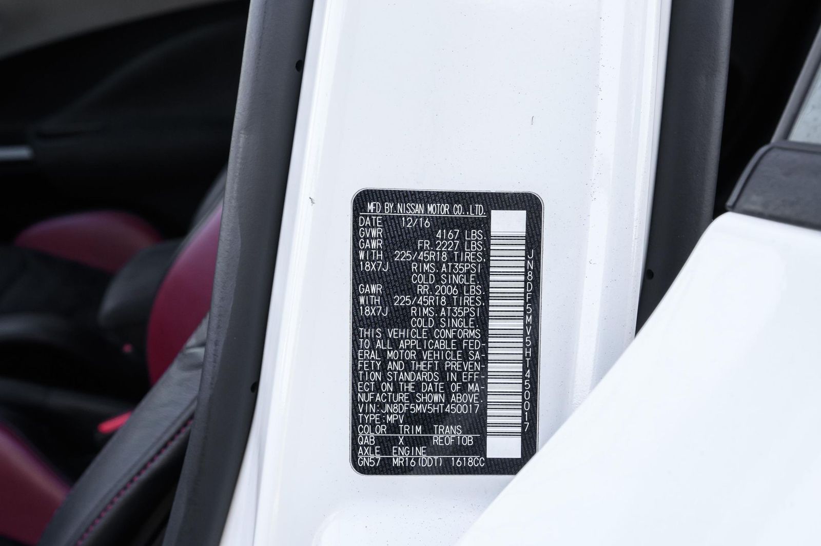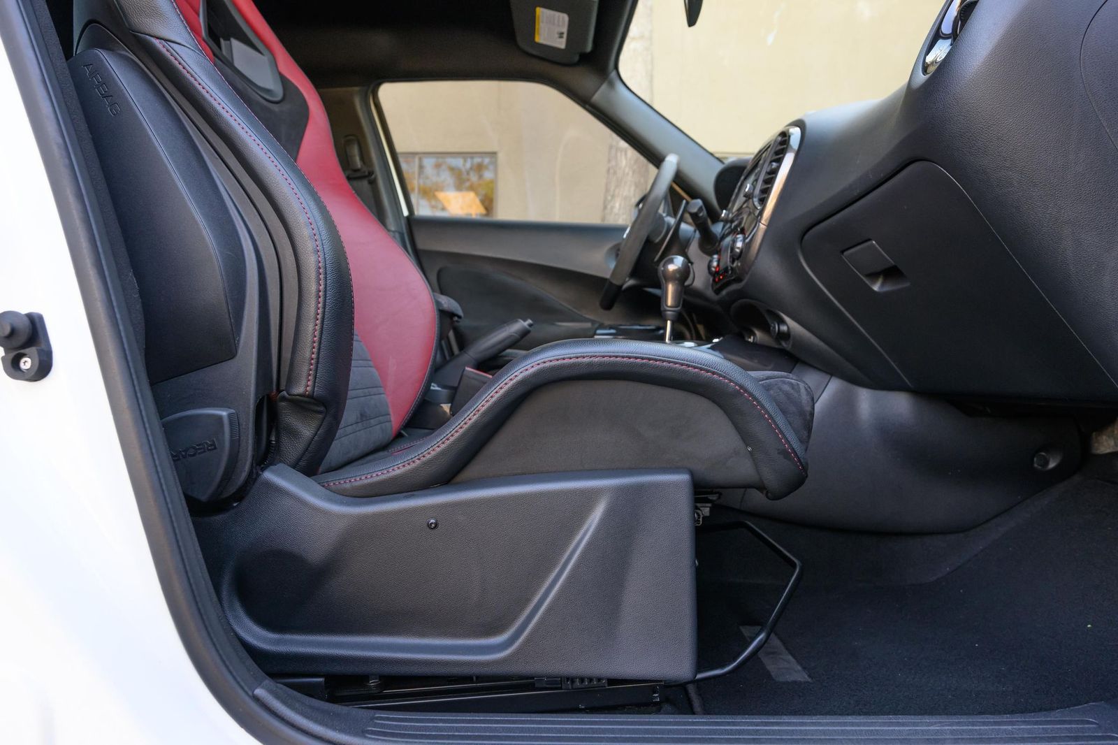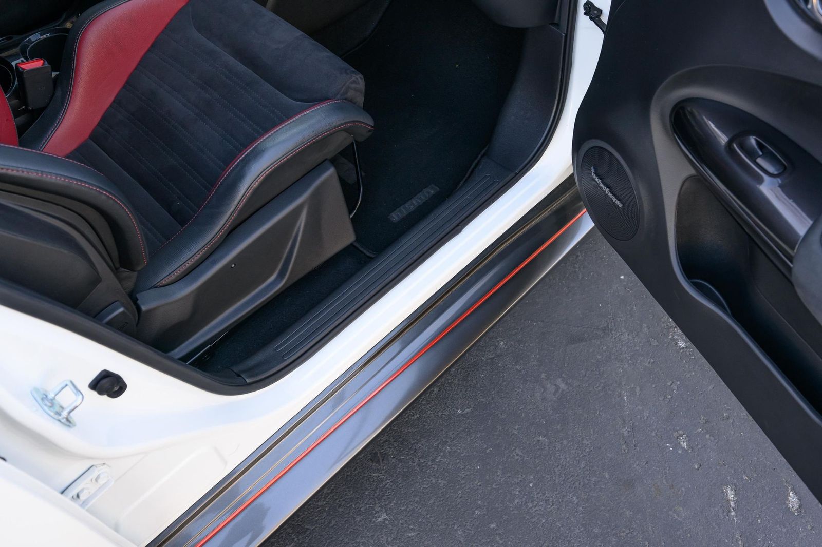 Factory equipment includes 18-inch alloy wheels, a NISMO-tuned suspension system, a NISMO-tuned steering system, a NISMO RS performance exhaust system, NISMO RS red brake calipers, a NISMO RS-specific body kit, leather and synthetic suede upholstery, Recaro front sport seats, leather and Alcantara-wrapped steering wheel, a 5.8-inch infotainment system, a Rockford Fosgate ecoPUNCH premium audio system, a navigation system, and an around view monitor, among others listed below. Modifications reported by the selling dealer are limited to wheel locks and partial paint protection film on the doors.
