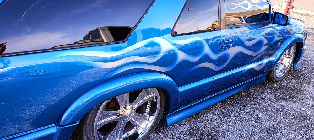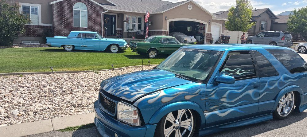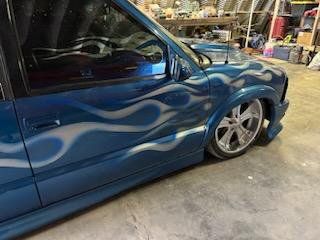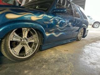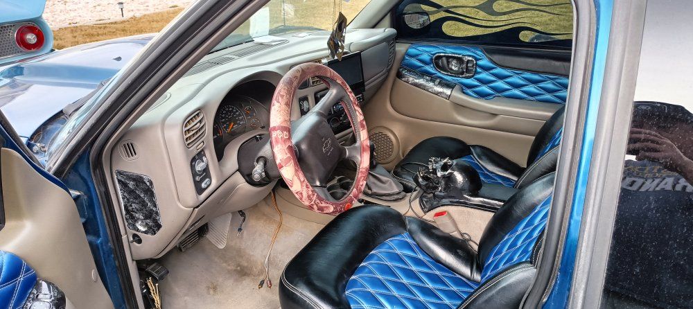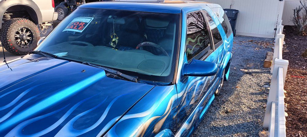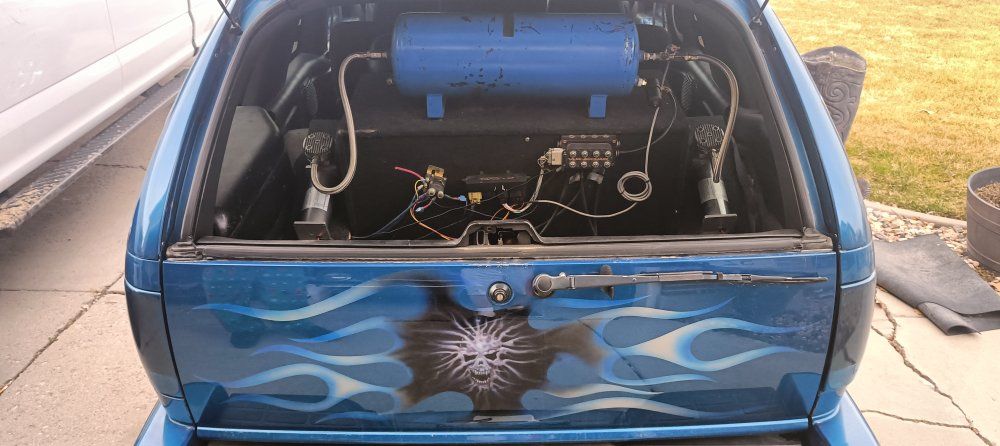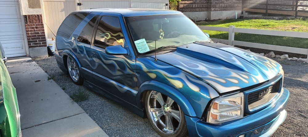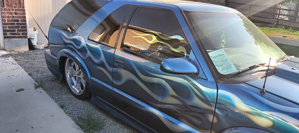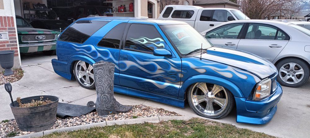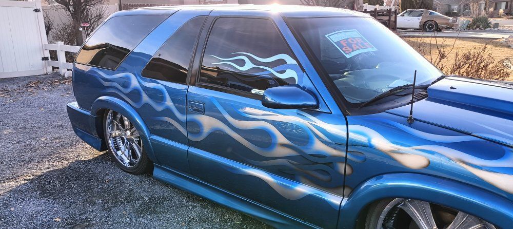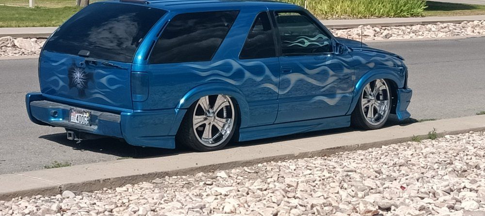 2000 Chevy Blazer dropped on bags side to side front to back or single wheel tunneled three linked wishbones custom paint custom interior hydro dip on some interior parts two TVs two 12-in subs two pumps single tank accurate air airbrush painting on back all paint no stickers fun little truck has extreme kit still could use a little more customizing but all in all solid ride no mechanical issues runs drives low mileage for the year asking the 12,000 OBO 801-897-7483