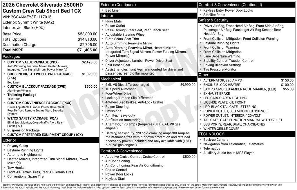 Experience the new Chevrolet Silverado 2500HD, available now at Sky Chevrolet of Provo! With bold design, advanced technology, and dependable performance, Chevrolet makes every mile more exciting. From Utah Valley’s city streets to mountain canyon drives, the Silverado 2500HD is built to handle it all with confidence. Call 801-356-4300 today to schedule your test drive and see what makes it stand out! Summit White 2026 Chevrolet Silverado 2500HD Custom 4WD 10-Speed Automatic Duramax 6.6L V8 Turbodiesel 10-Speed Automatic, 4WD, Black Cloth. Price includes: $500 - Chevrolet Consumer Cash Program - Price includes $1,500 Trade-In Allowance for customers trading a 2019 or newer passenger car or truck with under 80,000 miles toward a new 2025–2026 Chevrolet. Branded or salvage title vehicles do not qualify. Some restrictions apply. See dealer for details.