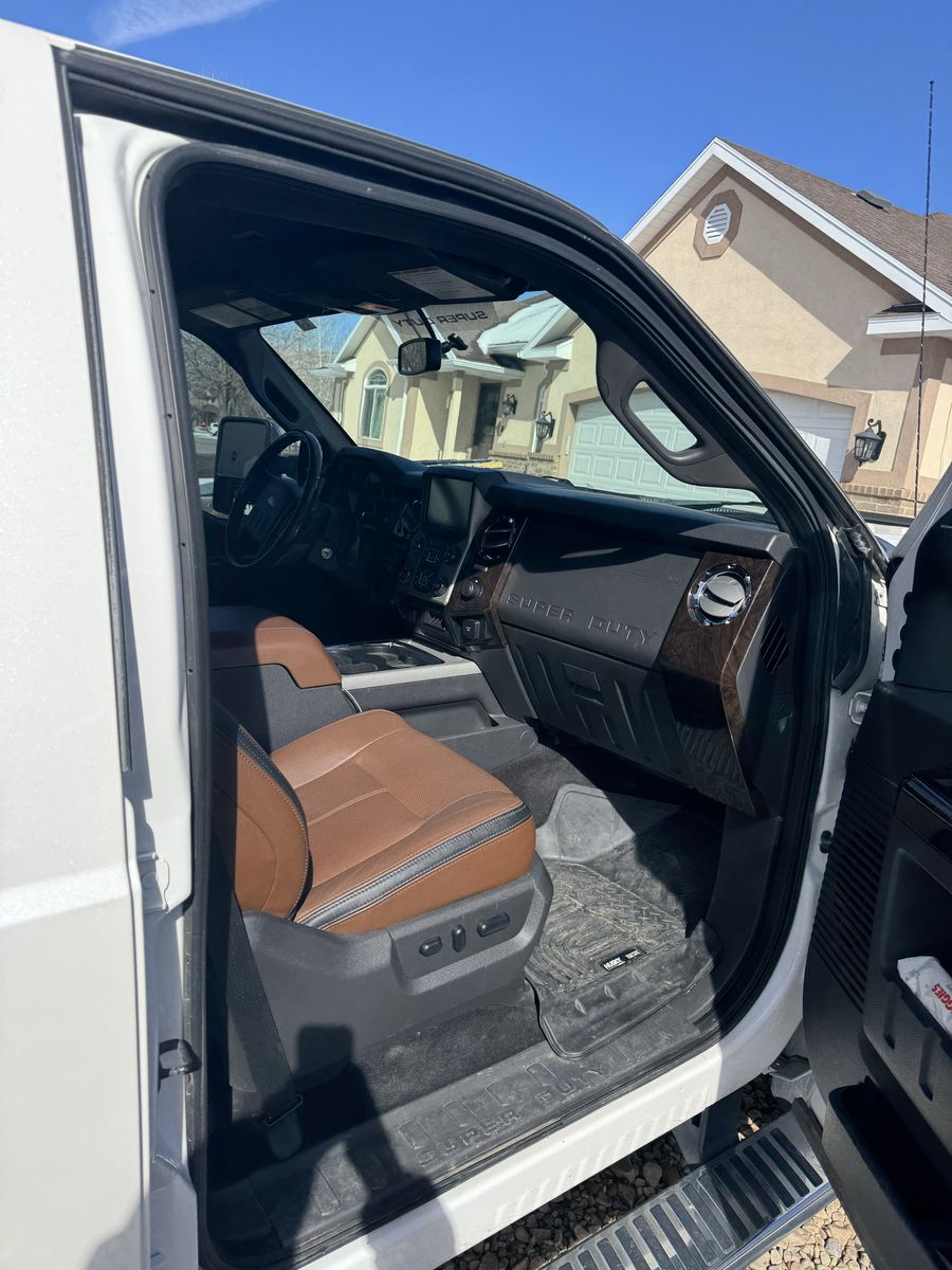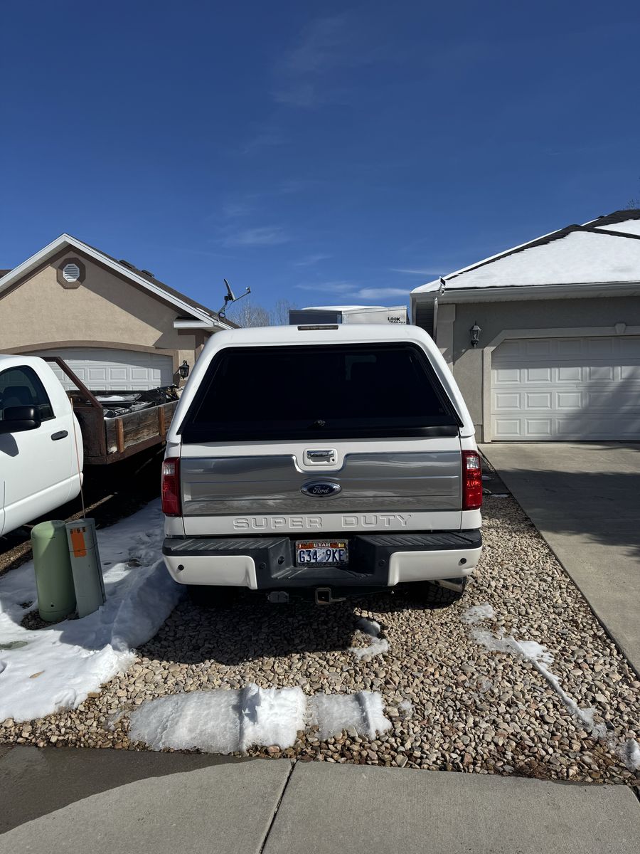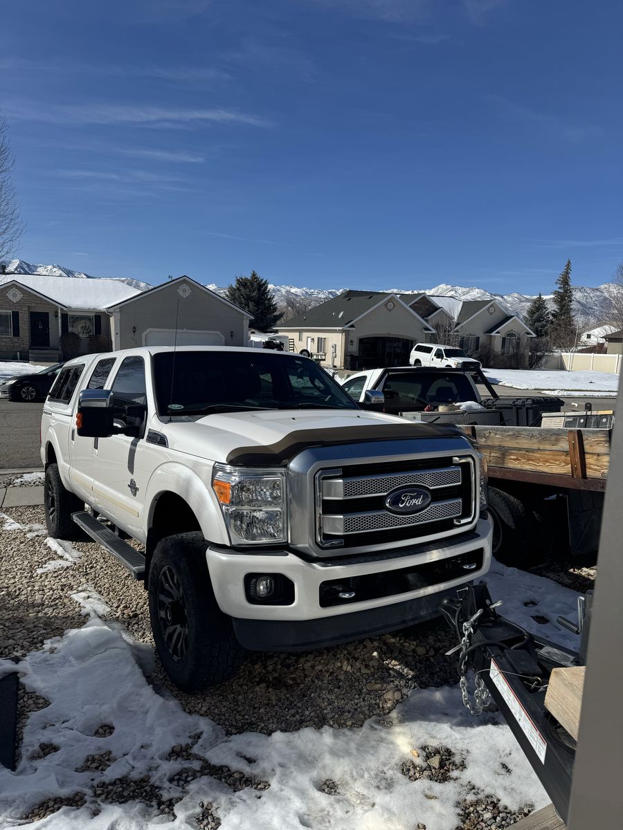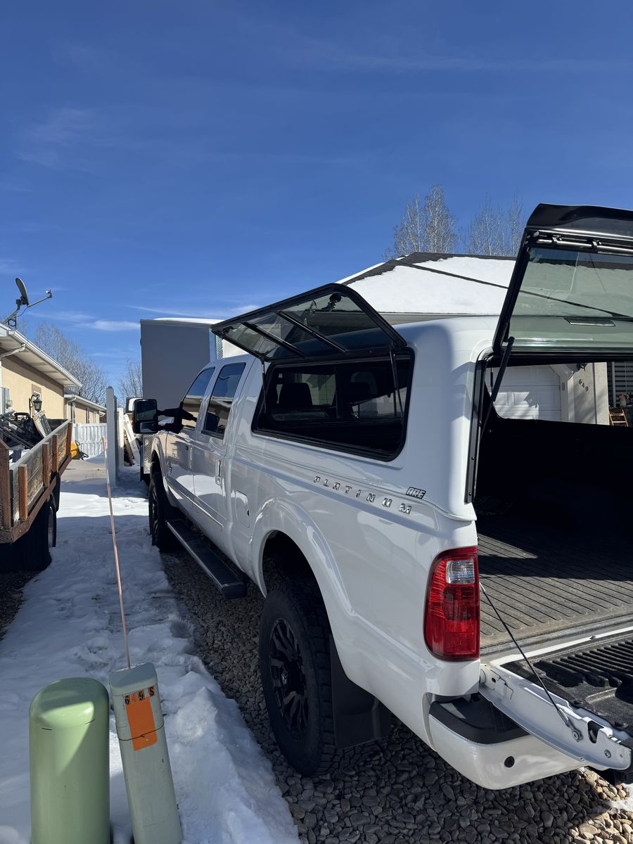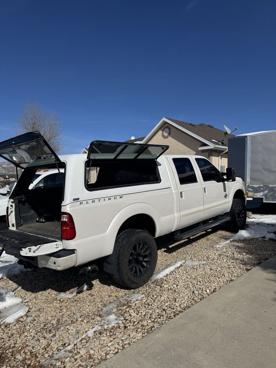 2014 F350 Platinum 6.7 powerstroke 4x4 with only 78,800 miles. Features include, bed liner and bed mat, factory fith wheel/gooseneck puck system, town package with integrated brake controller, tailgate step, sunroof, heated and cooled seats, power front seats, beautiful Chestnut brown interior, back up camera, heated steering wheel, basically almost every option available at the time. This has been a super reliable, trouble free truck for us. Only selling to upgrade to a newer one. Truck also has a 2.5" bds lift with extended radius arms, adjustable track bar, and fox shocks with fuel matte black and bronze wheels with good 35" Toyo tires on it, and a 55 gallon Titan Fuel tank. Also has a fiberglass shell with side access windows on both sides. Best style of shell I have ever had! I would keep it if it would fit the newer trucks!