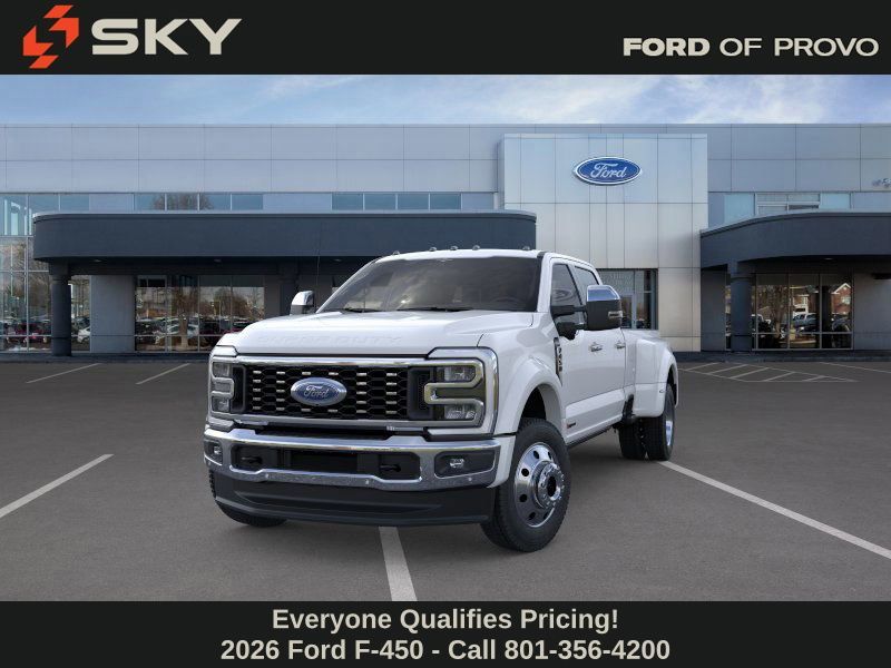 This 2026 Oxford White Ford F-450 SuperDuty Lariat 4WD is well equipped and includes these features and benefits: Ford Connectivity Package (1-Year Included), FX4 Off-Road Package (Hill Descent Control, Off-Road Specifically Tuned Shock Absorbers, and Unique FX4 Off-Road Box Decal), GVWR: 14,000 Lb Payload Package, Internet access capable: 5G Modem - Ford Connectivity Package, 4WD, 19.5'' Forged Polished Aluminum Wheels, 35K 5th Wheel Hitch Kit, 4-Wheel Disc Brakes, 410 Amp Dual Alternators, ABS brakes, Air Conditioning, Alloy wheels, Brake assist, Compass, Delay-off headlights, Dual front impact airbags, Dual front side impact airbags, Dual rear wheels, Electronic Stability Control, Emergency communication system: SYNC 4 911 Assist, Front anti-roll bar, Front License Plate Bracket, Front reading lights, Fully automatic headlights, Heated door mirrors, Illuminated entry, Limited Slip with 4.30 Axle Ratio, Low tire pressure warning, Outside temperature display, Overhead airbag, Overhead console, Panic alarm, Passenger vanity mirror, Power door mirrors, Power steering, Power windows, Pro Power Onboard - 2kW, Rapid-Heat Supplemental Cab Heater, Rear anti-roll bar, Rear reading lights, Rear step bumper, Remote keyless entry, Security system, Speed control, Split folding rear seat, Steering wheel mounted audio controls, Tachometer, Telescoping steering wheel, Tilt steering wheel, Traction control, Trip computer, Turn signal indicator mirrors, Upfitter Switches (6), and Variably intermittent wipers.