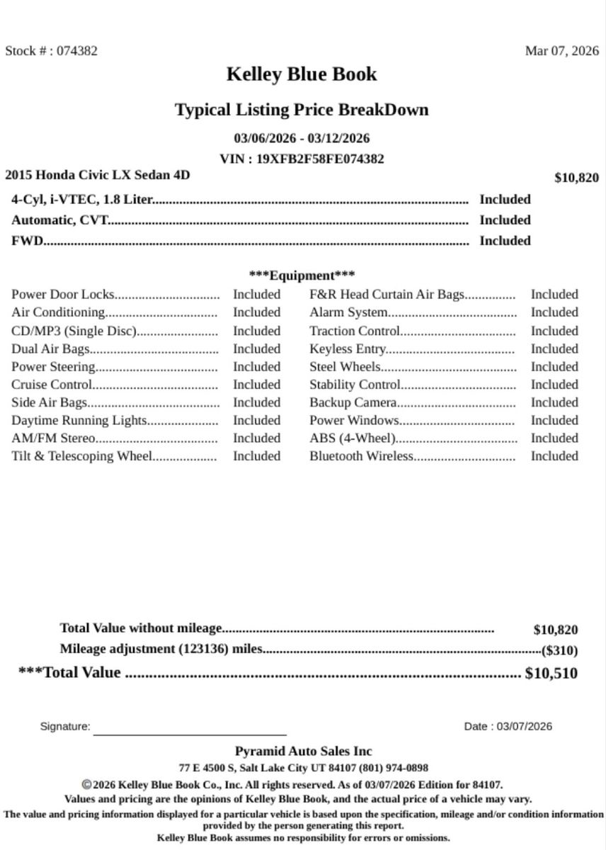 The 2015 Honda Civic LX is known for its reliability, fuel efficiency, and low maintenance costs. With a clean title, automatic transmission, backup camera, and Hondaβs proven 1.8L engine, this Civic makes an excellent daily driver, commuter, or first car.