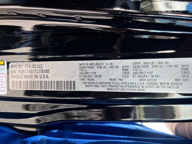 Quick Order Package 24S Sport S,MyFlexCare Service Plan,LED Headlamp and Fog Lamp Group,Convenience Group,Advanced Brake Assist,Freedom Panel Storage Bag,MOPAR All-Weather Slush Mats,3.73 Rear Axle Ratio,Deep Tint Sunscreen Windows,Rear Window Defroster,Rear Sliding Window,Corning Gorilla Glass,Sun Visors with Illuminated Vanity Mirrors,Power Heated Mirrors,Front Door Locks 2-Door Passive Entry,Air Conditioning with Auto Temp Control,Black 3-Piece Hard Top,Cluster 7.0 TFT Color Display,110 Mph Vehicle Max Speed Calibration,Heated Front Seats,Automatic Headlamps,Daytime Running Lamp System,Front LED Fog Lamps,LED Premium Reflector Headlamps,Daytime Running Lamps LED Accents,Security Alarm,Full Speed Forward Collision Warning Plus,Front License Plate Bracket,Heated Steering Wheel,Google Android Auto,USB Host Flip,Alexa Built-in,Apple CarPlay,12.3 Touchscreen Display,Emergency/Assistance Call,Integrated Center Stack Radio,Connectivity - US/Canada,4G LTE Wi-Fi Hot Spot,SiriusXM with 360L,Premium Wrapped Steering Wheel,Normal Duty Suspension,Normal Duty Plus Suspension,Radio: Uconnect 5 with 12.3 Display,Wheels: 17 x 7.5 Black Steel Styled,Wheels: 17 x 7.5 Gray,SiriusXM Radio Service,For Details,Visit DriveUconnect.com,Remote Start System,Universal Garage Door Opener,Manufacturer's Statement of Origin,4-Wheel Disc Brakes,Apple CarPlay/Android Auto,AM/FM radio: SiriusXM with 360L,Front Center Armrest w/Storage,Compass,8 Speakers,Front beverage holders,Variably intermittent wipers,Trip computer,Traction control,Tilt steering wheel,Telescoping steering wheel,Steering wheel mounted audio controls,Split folding rear seat,Speed control,Remote keyless entry,Rear reading lights,Rear anti-roll bar,Radio data system,Power windows,Power steering,Passenger vanity mirror,Passenger door bin,Panic alarm,Overhead airbag,Outside temperature display,Occupant sensing airbag,Low tire pressure warning,Integrated roll-over protection,Illuminated entry,Front reading lights,Front fog lights,Front anti-roll bar,Dual front side impact airbags,Dual front impact airbags,Driver vanity mirror,Driver door bin,Delay-off headlights,Brake assist,ABS brakes,Voltmeter,Tachometer,ParkView Rear Back-Up Camera,Front Bucket Seats,Electronic Stability Control,Air Conditioning,BLACK CLOTH LOW-BACK BUCKET SEATS,MYFLEXCARE SERVICE PLAN,BLACK CLEARCOAT,245/75R17 H/T TIRES (STD),MOPAR ALL-WEATHER SLUSH MATS,17 X 7.5 GRAY WHEELS (STD),5 800 LBS GVWR (STD),BLACK 3-PIECE HARD TOP -inc: Freedom Panel Storage Bag Rear Window Defroster Rear Sliding Window,8-SPEED AUTOMATIC 850RE TRANSMISSION (STD),MANUFACTURER'S STATEMENT OF ORIGIN,LED HEADLAMP & FOG LAMP GROUP -inc: Daytime Running Lamps LED Accents Front LED Fog Lamps LED Premium Reflector Headlamps Molded-In-Color Fender Flares (2 Pcs Fr/1 Pc Rr),3.6L V6 24V VVT UPG I ENGINE W/ESS (STD),QUICK ORDER PACKAGE 24S SPORT S -inc: 3.6L V6 24V VVT UPG I Engine w/ESS 8-Speed Automatic 850RE Transmission Advanced Brake Assist Power Heated Mirrors Automatic Headlamps Deep Tint Sunscreen Windows Premium Wrapped Steering Wheel Security Alarm Sun Visors w/Illuminated Vanity Mirrors Full Speed Forward Collision Warning Plus,3.73 REAR AXLE RATIO (STD),CONVENIENCE GROUP -inc: Emergency/Assistance Call Front Door Locks 2-Door Passive Entry Remote Start System Body Color Fender Flares (2-Piece) Cluster 7.0 TFT Color Display Universal Garage Door Opener Daytime Running Lamp System Heated Front Seats Air Conditioning w/Auto Temp Control Heated Steering Wheel Corning Gorilla Glass,FRONT LICENSE PLATE BRACKET,Four Wheel Drive,Power Steering,ABS,4-Wheel Disc Brakes,Brake Actuated Limited Slip Differential,Aluminum Wheels,Tires - Front All-Season,Tires - Rear All-Season,Conventional Spare Tire,Tow Hooks,Tow Hooks,Intermittent Wipers,Variable Speed Intermittent Wipers,Rollover Protection Bars,Convertible Soft Top,Power Door Locks,Fog Lamps,AM/FM Stereo,Satellite Radio,Bluetooth Connection,Requires Subscription,MP3 Capability,Steering Wheel Audio Controls,Auxiliary Audio Input,Satellite Radio,Requires Subscription,Bluetooth Connection,Driver Adjustable Lumbar,Driver Adjustable Lumbar,Pass-Through Rear Seat,Rear Bench Seat,Adjustable Steering Wheel,Trip Computer,Power Windows,Keyless Entry,Power Door Locks,Keyless Start,Cruise Control,A/C,Cloth Seats,Bucket Seats,Floor Mats,Smart Device Integration,Smart Device Integration,WiFi Hotspot,Power Windows,Power Door Locks,Trip Computer,Immobilizer,Traction Control,Stability Control,Traction Control,Front Side Air Bag,Tire Pressure Monitor,Driver Air Bag,Passenger Air Bag,Front Head Air Bag,Rear Head Air Bag,Passenger Air Bag Sensor,Child Safety Locks,Back-Up Camera
