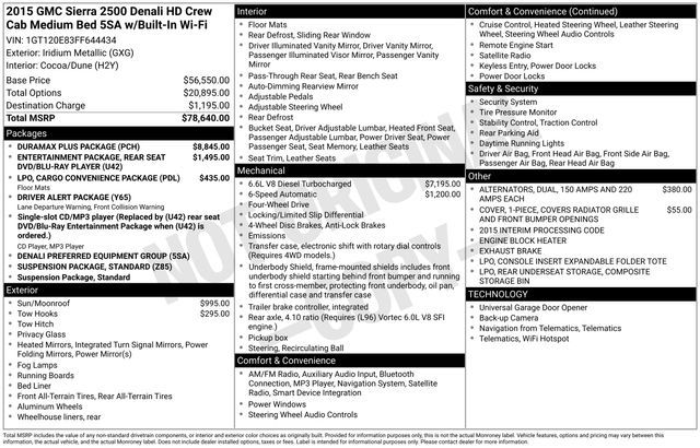 Take your drives to the next level with this GMC Sierra 2500HD from Salt Lake Valley Buick GMC! Engineered for a smooth ride, advanced convenience, and lasting dependability, this vehicle is ready to handle everything your day throws at you. Plus, enjoy a $1,000 finance savings, already included in the sale price, when you finance through one of our trusted lending partners. Looking for quality used cars in Salt Lake City? This GMC Sierra 2500HD delivers style, versatility, and value - perfect for daily commutes, family trips, or weekend adventures. Stop by Salt Lake Valley Buick GMC to see this vehicle in person and explore our wide selection of pre-owned cars, trucks, and SUVs. Browse online at www.slvbuickgmc.com or call 801-265-1511 to schedule your test drive today! With Cargo Convenience Package (Console Insert Expandable Folder Tote (LPO), Front & Rear All-Weather Mats (LPO), and Rear Underseat Storage (LPO)), Driver Alert Package, Duramax Plus Package, Heavy-Duty Trailering Equipment, Rear Seat DVD/Blu-Ray Player Entertainment Package (Wireless Headphones (2 Sets)), Standard Suspension Package, 1-Piece Radiator Grille/Front Bumper Opening Cover, 110-Volt AC Power Outlet, 150 Amps Alternator, 18'' Chromed Aluminum Wheels, 4-Wheel Disc Brakes, 7 Speakers, 8'' Multi-Color Driver Instrument Info Display, ABS brakes, Adjustable pedals, Air Conditioning, Alloy wheels, AM/FM radio: SiriusXM, Auto-dimming door mirrors, Auto-Dimming Inside Rear-View Mirror, Auto-dimming Rear-View mirror, Automatic temperature control, Black Frame-Mounted Front Recovery Hooks, Bluetooth® For Phone, Body-Color Front Bumper, Bodyside moldings, BOSE Sound w/7 Speaker System, Brake assist, Bumpers: body-color, CD player, Chrome Bodyside Moldings, Chrome Door Handles, Chrome Recovery Hooks, Chrome wheels, Color-Keyed Carpeted Floor Mats, Color-Keyed Carpeting Floor Covering, Compass, Deep-Tinted Glass, Delay-off headlights, Denali Decor, Driver & Front Passenger Visors, Driver door bin, Driver vanity mirror, Dual 150 Amps Each Alternators, Dual front impact airbags, Dual front side impact airbags, Dual-Zone Automatic Climate Control, Electric Rear-Window Defogger, Electronic Shift Transfer Case, Electronic Stability Control, Emergency communication system: OnStar Directions & Connections, Engine Block Heater, Exhaust Brake, Exterior Parking Camera Rear, EZ-Lift & Lower Tailgate, Floor Console w/Dual Cup Holders, Front anti-roll bar, Front Center Armrest, Front dual zone A/C, Front fog lights, Front Full Feature Bucket Seats, Front Halogen Fog Lamps, Front reading lights, Front wheel independent suspension, Fully automatic headlights, Garage door transmitter, Heated & Cooled Front Bucket Seats, Heated door mirrors, Heated Driver & Front Passenger Seats, Heated front seats, Heated Leather Steering Wheel, Heated Power-Adjustable Outside Mirrors, Heated steering wheel, Illuminated entry, Low tire pressure warning, Manual Tilt-Wheel/Telescoping Steering Column, Memory seat, Navigation System, Occupant sensing airbag, OnStar 4G LTE Wi-Fi Hotspot, OnStar 6 Months Directions/Connections Plan, Outside temperature display, Overhead airbag, Overhead console, Panic alarm, Passenger door bin, Passenger vanity mirror, Perforated Leather Appointed Seat Trim, Power door mirrors, Power driver seat, Power passenger seat, Power Sliding Rear Window w/Defogger, Power steering, Power Sunroof, Power windows, Power Windows w/Driver Express Up & Down, Power-Adjustable Pedals For Accelerator & Brake, Radio: AM/FM/SiriusXM w/Navigation, Rear 60/40 Folding Bench Seat (Folds Up), Rear Body-Color Bumper w/Bumper CornerSteps, Rear reading lights, Rear seat center armrest, Rear step bumper, Rear Vision Camera w/Dynamic Guide Lines, Rear Wheelhouse Liners, Rear window defroster, Remote Keyless Entry, Remote keyless entry, Remote Vehicle Starter System, Security system, Single Slot CD/MP3 Player, SiriusXM Satellite Radio, Speed control, Split folding rear seat, Steering Wheel Audio