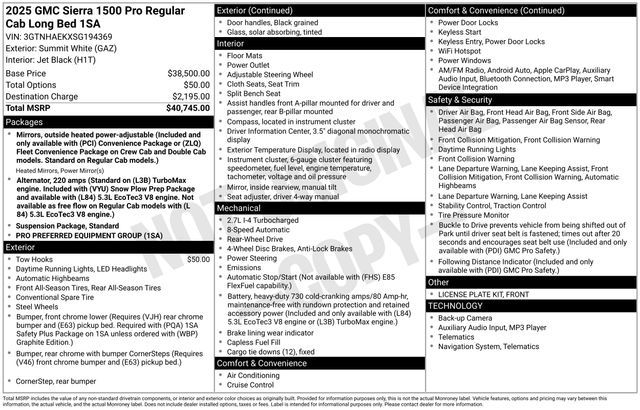 Take your drives to the next level with this GMC Sierra 1500 from Salt Lake Valley Buick GMC! Engineered for a smooth ride, advanced convenience, and lasting dependability, this vehicle is ready to handle everything your day throws at you. Plus, enjoy a $1,000 finance savings, already included in the sale price, when you finance through one of our trusted lending partners. Looking for quality used cars in Salt Lake City? This GMC Sierra 1500 delivers style, versatility, and value - perfect for daily commutes, family trips, or weekend adventures. Stop by Salt Lake Valley Buick GMC to see this vehicle in person and explore our wide selection of pre-owned cars, trucks, and SUVs. Browse online at www.slvbuickgmc.com or call 801-265-1511 to schedule your test drive today! With Preferred Equipment Group 1SA (2 Charge/Data USB Ports, 220 Amp Alternator, Chrome Header w/Flat Black Grille Insert Bars, HD Rear Vision Camera, OnStar Services Capable, Power Door Locks, Power Front Windows w/Driver Express Up/Down, Power Front Windows w/Passenger Express Down, Push Button Start, Remote Keyless Entry, Solar Absorbing Tinted Glass, and Wi-Fi Hotspot Capable), Standard Suspension Package, 2 Speakers, 2-Speaker Audio System Feature, 3.42 Rear Axle Ratio, 4-Way Manual Driver Seat Adjuster, 4-Way Manual Passenger Seat Adjuster, 4-Wheel Disc Brakes, ABS brakes, Air Conditioning, AM/FM radio, Apple CarPlay/Android Auto, Auto High-beam Headlights, Automatic Emergency Braking, Brake assist, Buckle to Drive, Bumpers: chrome, Compass, Delay-off headlights, Driver door bin, Dual front impact airbags, Dual front side impact airbags, Electronic Stability Control, Emergency communication system: OnStar, Following Distance Indicator, Forward Collision Alert, Front 40/20/40 Split-Bench Seat, Front anti-roll bar, Front Center Armrest w/Storage, Front Frame-Mounted Black Recovery Hooks, Front License Plate Kit, Front Pedestrian Braking, Front reading lights, Front wheel independent suspension, Fully automatic headlights, Heated door mirrors, Illuminated entry, IntelliBeam Automatic High Beam On/Off, Lane Keep Assist w/Lane Departure Warning, Low tire pressure warning, Occupant sensing airbag, Outside temperature display, Overhead airbag, Overhead console, Panic alarm, Passenger door bin, Passenger vanity mirror, Power door mirrors, Power steering, Power windows, Radio data system, Radio: GMC Infotainment Audio System, Rear reading lights, Rear step bumper, Remote keyless entry, Speed control, Speed-sensing steering, Tachometer, Tilt steering wheel, Traction control, Trip computer, Variably intermittent wipers, Vinyl Seat Trim, Voltmeter, Wheels: 17'' x 8'' Silver Painted Steel, and Wireless Apple CarPlay/Wireless Android Auto designed for convenience and enjoyment, this GMC Sierra 1500 is ready to take you wherever you want to go.