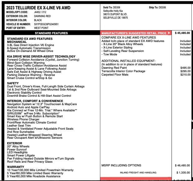 Rear Automatic emergency braking, Front Pedestrian Automatic emergency braking, Front Automatic emergency braking, Intersection/junction Turn Automatic emergency braking, Intersection/junction Cross Automatic emergency braking, Head-on Collision Avoidance Evasive steering assist, Lane keeping assist, Check rear seat reminder, Pedestrian Detection Pre-collision warning system, Pedestrian Detection Rear pre-collision warning system, Driver attention alert system, Audible Warning Pre-collision warning system, Visual Warning Pre-collision warning system, Vehicle exit safety system, Adaptive Speed Limiting Traffic sign recognition, Sensor/alert Blind spot safety, Rear Cross traffic alert, Lane deviation sensors, Driver Knee airbags, Rearview Camera system, Front Side airbags, Rear Side curtain airbags, Rear Side airbags, Front Side curtain airbags, Third Row Side curtain airbags, Rear Parking sensors, 4-wheel ABS, Anti-lockout Power door locks, Cornering brake control, Auto-locking Power door locks, Hill Descent Off-road driving assist, Auto Off Electronic parking brake, Trailer stability control, Alarm Anti-theft system, Braking assist, Hill holder control, Disc Rear brake, Ventilated Disc Front brake, Dual Front airbags, Vehicle Immobilizer Anti-theft system, Power brakes, LATCH System Child seat anchors, Electronic brakeforce distribution, Stability control, Traction control, In Dash Rearview monitor, Occupant Sensing Passenger Airbag deactivation, Front Seatbelt pretensioners, Front Seatbelt force limiters, Front Emergency locking retractors, Roll stability control, Front Seatbelt warning sensor, Fully Automated Adaptive stop and go cruise control, Lane Centering Autonomous lane guidance, Leather-trimmed Upholstery, Adaptive cruise control, Proximity Entry System Multi-function remote, Ventilated Driver seat, Ventilated Passenger seat, Heated steering wheel, Automatic Climate Control Rear air conditioning, Leather Steering wheel trim, Automatic Climate Control Front air conditioning, Dual Front air conditioning zones, 8 Driver seat power adjustments, Front Wireless charging station, Push-button start, Heated Driver seat, Leather Shift knob trim, Remote engine start, Heated Passenger seat, Auto-dimming Rearview mirror, Dual Level Cargo Area Storage, 8 Passenger seat power adjustments, Variable/speed-proportional Power steering, Bucket Front seat, Humidity/dewpoint sensors, Stainless Steel Door sill trim, Captains Chairs Rear seat, Chrome Interior accents, 40-60 Split Bench Third row seat, Simulated Wood Dash trim, Simulated Wood Center console trim, Simulated Wood Door trim, Leatherette Door trim, Leatherette Center console trim, Side Window Sunshade, Air filtration, One-touch Fold Flat Rear seat folding, Flat Third row seat folding, Split Third row seat folding, Split Rear seat folding, Hard Cargo cover, USB-C Front Power outlet(s), USB-C Rear Power outlet(s), 12V Rear Power outlet(s), 12V Front Power outlet(s), 12V Third Row Power outlet(s), Tilt And Telescopic Steering wheel, Third Row Rear vents, Multi-function display, Sliding Rear seat, Front Console With Armrest And Storage Center console, Compass, USB-C Third Row Power outlet(s), 4 One-touch windows, External temperature display, MPG Fuel economy display, Range Fuel economy display, Front Reading lights, Tachometer Gauge, Door Courtesy lights, Rear Reading lights, Lumbar Driver seat power adjustments, Lumbar Passenger seat power adjustments, Reclining Passenger seat power adjustments, Reclining Driver seat power adjustments, Third Row Reading lights, Height Driver seat power adjustments, Height Passenger seat power adjustments, 4.2 In. Instrument cluster screen size, Front Cupholders, Maintenance Due Warnings and reminders, Front Overhead console, Dual Illuminating Vanity mirrors, Rear Cupholders, Cargo area light, Panic Alarm Multi-function remote, Audio Steering wheel mounted controls, Carpet Floor material, Cruise Control Steering wheel mounted controls, Phone Steering wheel mounted controls, Multi-function Steering wheel mounted controls, Front Seatback Storage, Voice Control Steering wheel mounted controls, Single Rear air conditioning zones, Sunglasses Holder Storage, Trunk Release Multi-function remote, Power Glass Moonroof / Sunroof, Painted Aluminum Alloy Wheels, Sensor-activated Rear trunk/liftgate, LED Headlights, Power Operated Rear trunk/liftgate, Auto High Beam Dimmer Headlights, LED Daytime running lights, Dual Tip Exhaust, LED Taillights, Power Folding Side mirror adjustments, Safety Reverse Power windows, Power Side mirror adjustments, Heated Side mirrors, Acoustic Windshield Laminated glass, Steel Spare wheel, Intermittent Rear wiper, Rear Window defogger, Variable Intermittent Front wipers, Rear privacy glass, With Washer Rear wiper, Tire Pressure Monitoring System, Integrated Turn Signals Side mirrors, Roofline Rear spoiler, Chrome Body side moldings, Solar-tinted glass, Auto On/off Headlights, Rear Skid plate(s), Front Skid plate(s), Auto Delay Off Headlights, Tilt/slide Moonroof / Sunroof, Temporary Spare tire size, One-touch Open/close Moonroof / Sunroof, Sliding Sunshade Moonroof / Sunroof, Anti-trapping Moonroof / Sunroof, Chrome Exhaust tip color, Black Fender lip moldings, Fixed Liftgate window, Liftgate Rear trunk/liftgate, Black Rear bumper color, Black Window trim, Black Grille color, Black Headlight bezel color, Hotspot Wi-Fi, Touch Screen Display Navigation system, Voice Operated Navigation system, 12.3 In. Infotainment screen size, Apple CarPlay Smartphone integration, Android Auto Smartphone integration, Kia Access Smart device app compatibility, Bluetooth Wireless data link, Voice Operated Hands-free phone call integration, Voice Operated Radio, Bluetooth Auxiliary audio input, Pandora Internet radio app, Engine Start Smart device app function, Touch Screen Display Radio, Real Time Traffic Navigation data, With Read Function Electronic messaging assistance, Voice Operated Electronic messaging assi