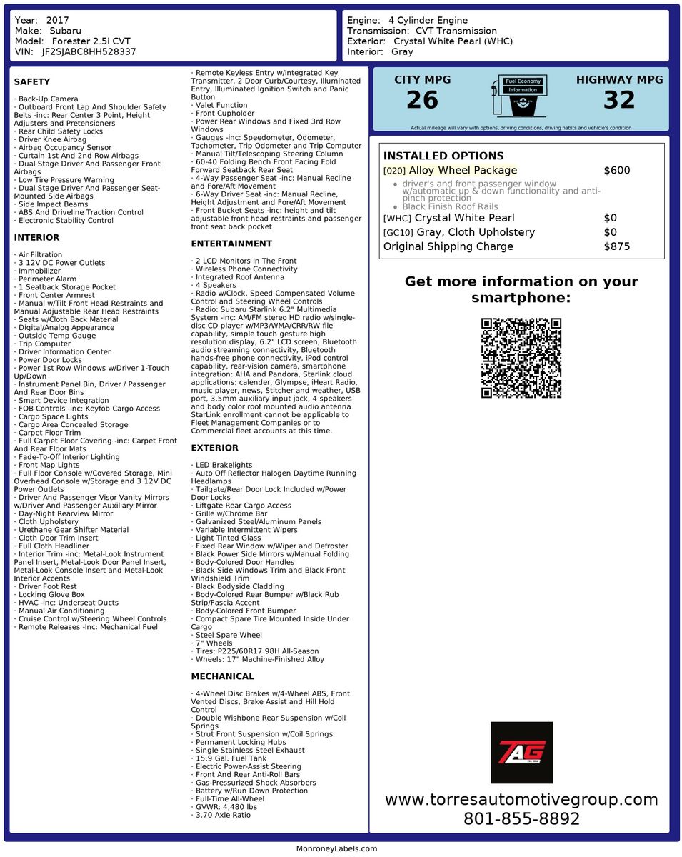 Completing the polished look of the Forester is the alloy wheel package- which adds a modern touch to its overall design. This feature not only enhances the vehicle's aesthetic appeal but also contributes to its robust road performance. Whether you're navigating urban landscapes or exploring off-the-beaten-path destinations- the 2017 Subaru Forester 2.5i CVT is a reliable companion- combining style- performance- and practicality.