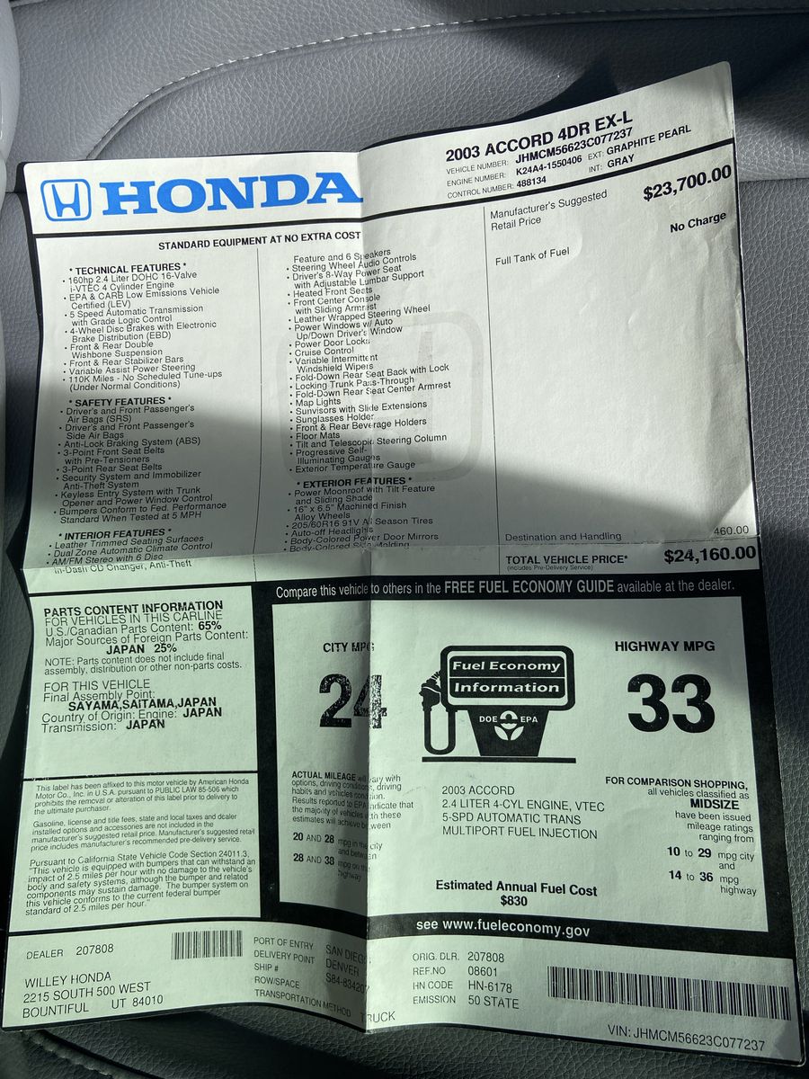 2003 Honda Accord Ex-L with 203,251 miles. Runs and drives well. We are the second owner.
