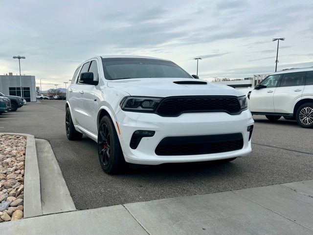 2022 Dodge Durango SRT 392 AWD 8-Speed Automatic SRT HEMI 6.4L V8 MDS Recent Arrival! Odometer is 8878 miles below market average! 1 USB Charging Port in Console, 12V Auxiliary Power Outlet In Console, 19 harman/kardon Amplified Speakers w/Subwoofer, 2nd Row Console w/Armrest & Storage, 825 Watt Amplifier, Apple CarPlay/Android Auto, Auto High-beam Headlights, Auto-dimming door mirrors, Auto-dimming Rear-View mirror, Automatic temperature control, Black Package, Brake assist, Eclipse Black Exhaust Tip, Electronic Stability Control, Forged Carbon Fiber Interior Accents, Front dual zone A/C, Front fog lights, Full Console 3rd Row Floor Mat, Fully automatic headlights, Garage door transmitter, Gloss Black Exterior Mirrors, Gray Metallic Badges, Heated door mirrors, Heated front seats, Heated rear seats, Heated steering wheel, Illuminated Rear Cupholders, Leather Trimmed Bucket Seats, Memory seat, Monaco Wrapped Interior Accents, Navigation system: TomTom, ParkView Rear Back-Up Camera, Power driver seat, Power Liftgate, Power passenger seat, Power Sunroof, Premium Instrument Panel, Premium Interior Group w/Demonic Red/Black, Quick Order Package 29L, Radio: Uconnect 5 Nav w/10.1'' Display, Rain sensing wipers, Remote keyless entry, Satin Black Dodge Tail Lamp Badge, Spoiler, Steering wheel mounted audio controls, Suede Headliner, Turn signal indicator mirrors, Ventilated front seats, Wheels: 20'' x 10'' Lights Out Aluminum. While we make every effort to ensure the data listed here is correct, there may be instances where some of the options or vehicle features may be listed incorrectly as we get data from multiple data sources. PLEASE MAKE SURE to confirm the details of this vehicle with the dealer to ensure its accuracy. Dealer cannot be held liable for data that is listed incorrectly. See Dealer for details.