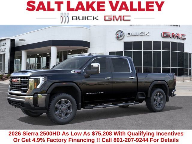 2026 GMC Sierra 2500HD SLT 4D Crew Cab Onyx Black Duramax 6.6L V8 Turbodiesel 4WD --- Please note that the final selling price does not include tax, tag, title, documentation fees, dealer-installed options, or pricing adjustments due to market demand. Financing through GM Financial is required for all discounts to be applied. Special finance offers may not be combined with some factory incentives. While we strive for accuracy, errors may occur, so please verify all information with a customer service representative. For the most accurate pricing, call us at (801) 265-1511 or visit our dealership in person. Prices and payments are subject to change based on manufacturer incentives. ... Sale Price may include dealer discount, $500 - Buick & GMC Consumer Cash Program $500 - Buick GMC Bonus Cash - Price includes $2,000 Down Payment Assistance. Must Finance with GM Financial – Price includes $1,500 Trade-In Allowance for customers trading a 2019 or newer passenger car or truck with under 80,000 miles toward a new 2025–2026 Buick or GMC. Branded or salvage title vehicles do not qualify. Some restrictions apply. See dealer for details.