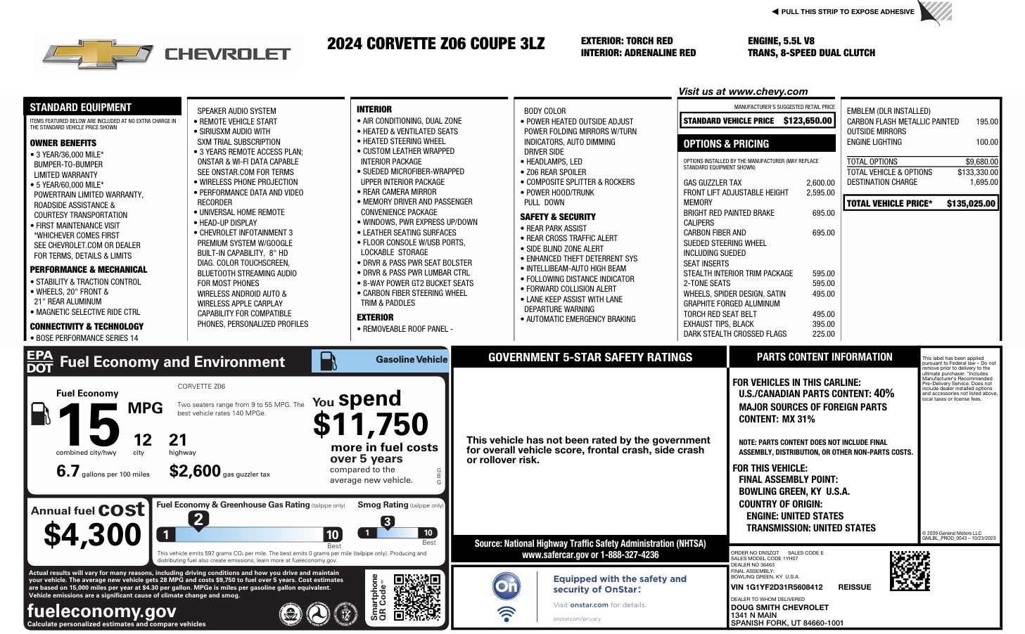 2024 Corvette ZO6 3LZ. One owner, excellent condition, like new. Top Trim level ZO6 with all of the options. All Stock, Two tone black and red interior, front end lift, engine lighting, carbon fiber steering wheel and lots of options. Have original window sticker and owners kit. Full factory warranty.