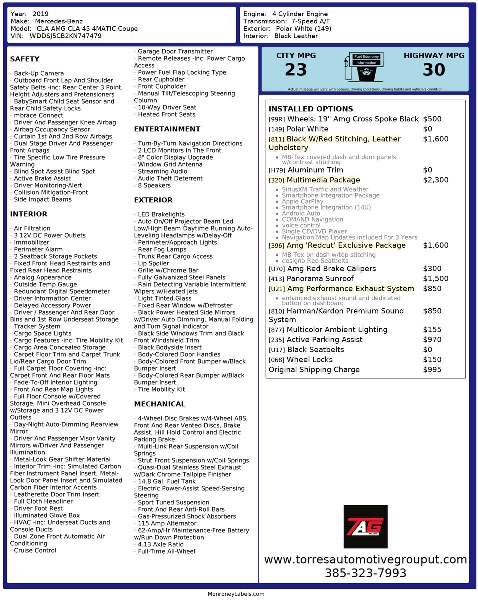 The 2019 Mercedes-Benz AMG CLA 45 4MATIC Coupe is a striking combination of style and performance- exuding a sleek elegance with its Polar White exterior. Under the hood- this coupe is powered by a robust 2.0L 4-cylinder engine- delivering exhilarating power and precision on the road. Its All Wheel Drive drivetrain ensures exceptional handling and grip- making every drive both thrilling and secure.