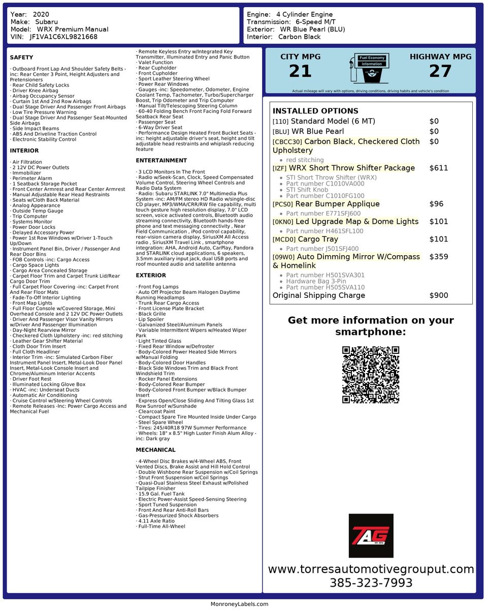 This Carfax 1-Owner 2020 Subaru WRX Premium sports a striking WR Blue Pearl exterior that commands attention on the road. Equipped with a 2.0L 4-cylinder engine- this vehicle is engineered to deliver both impressive performance and fuel efficiency. The All-Wheel Drive system ensures superior traction and stability- allowing you to navigate various terrains with confidence.