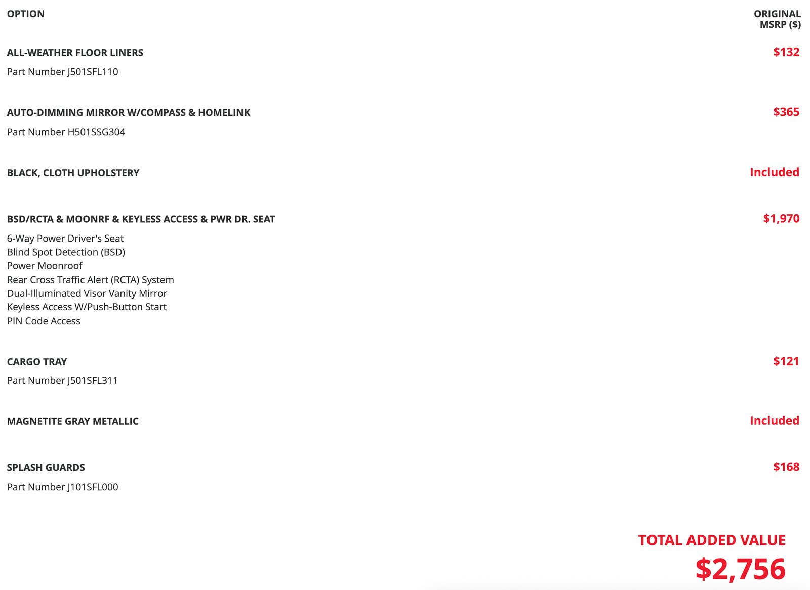 Inside- the black interior provides a modern and cozy atmosphere- complemented by upscale features such as a power driver's seat that offers customizable comfort for long journeys. The interior’s functionality is enhanced with all-weather floor liners and a cargo tray- ensuring that the car remains pristine amid everyday wear and tear. Keyless access streamlines your daily commute- while the auto-dimming mirror with compass and HomeLink adds both convenience and safety features to your driving experience.