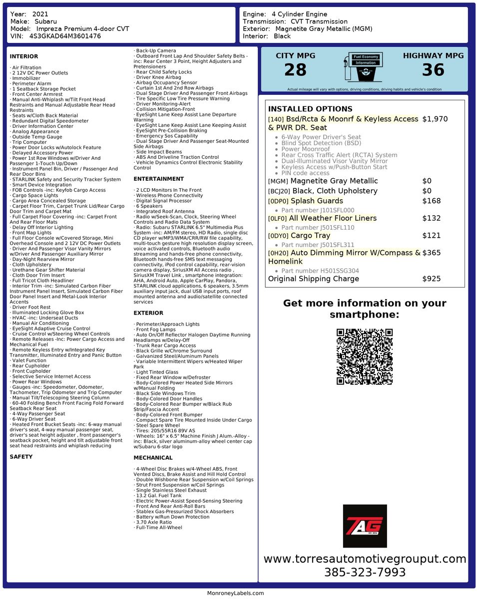 The Impreza's all-wheel-drive system offers confidence-inspiring handling in diverse driving conditions- further bolstered by driver assistance features like Blind Spot Detection (BSD) and Rear Cross-Traffic Alert (RCTA). Enjoy the open road with the added luxury of a moonroof- filling the cabin with natural light at the touch of a button. Exterior enhancements include splash guards that protect the vehicle from the elements- marrying practicality with aesthetic appeal. Overall- this Subaru Impreza stands out as a reliable- high-performing car that refuses to compromise on style and advanced functionality.