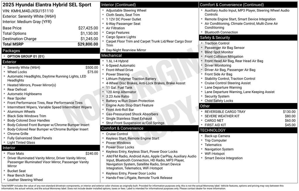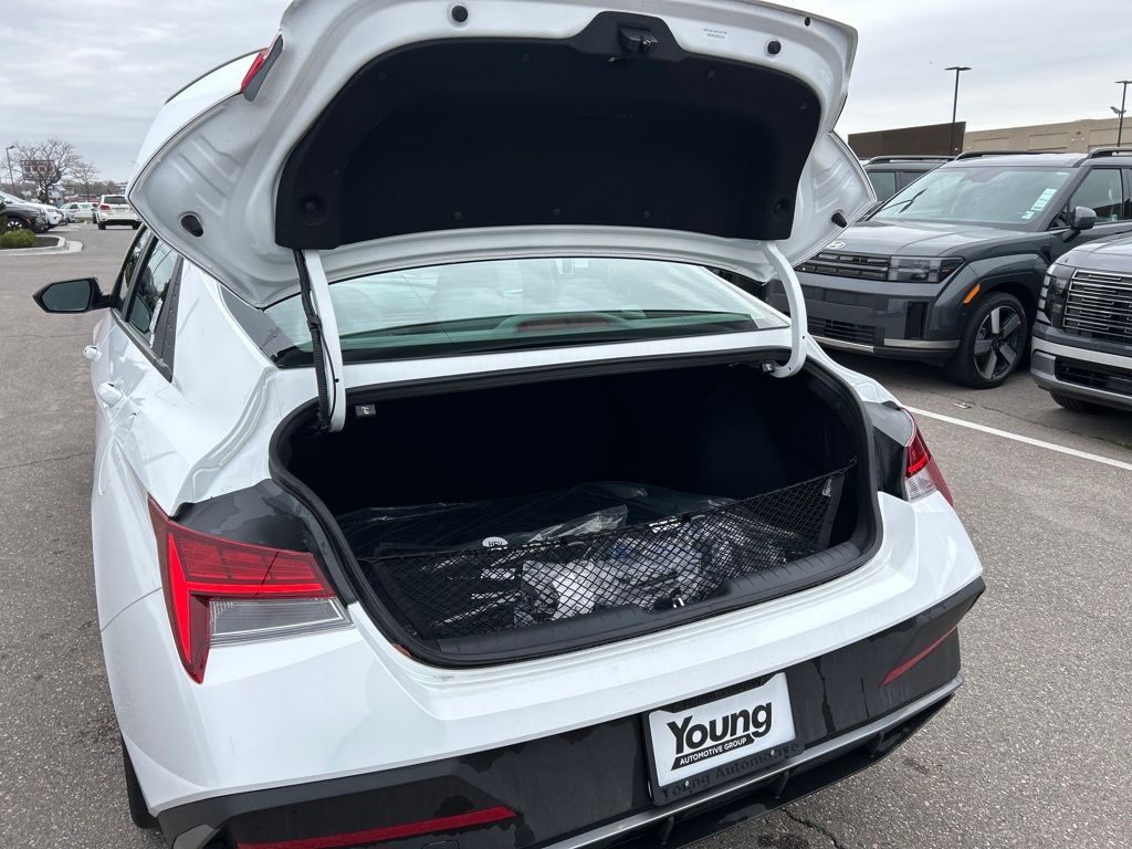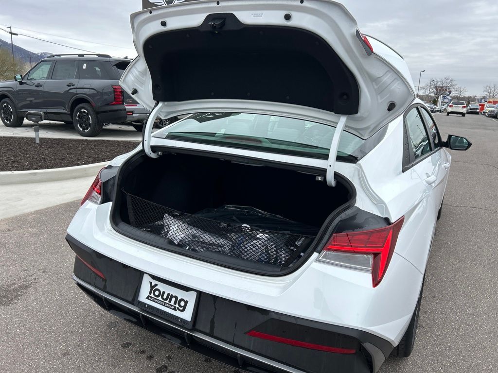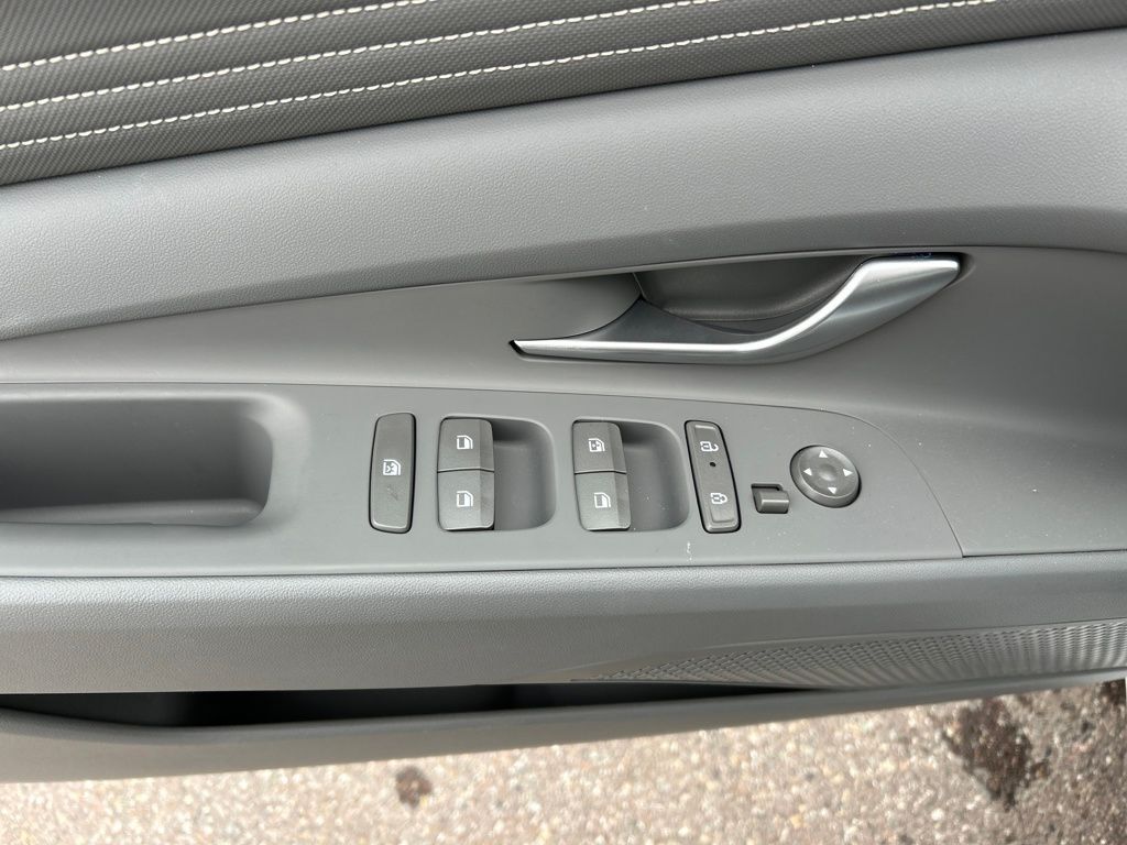 Option Group 01, 17'' x 7.0J Alloy Wheels, 4-Wheel Disc Brakes, 6 Speakers, ABS brakes, Air Conditioning, Alloy wheels, AM/FM radio: SiriusXM, Apple CarPlay & Android Auto, Auto High-beam Headlights, Automatic temperature control, Brake assist, Bumpers: body-color, Cargo Net, Carpeted Floor Mats, Delay-off headlights, Driver door bin, Driver vanity mirror, Dual front impact airbags, Dual front side impact airbags, Electronic Stability Control, Emergency communication system: Bluelink , Exterior Parking Camera Rear, First Aid Kit, Front anti-roll bar, Front Bucket Seats, Front Center Armrest, Front dual zone A/C, Front reading lights, Front wheel independent suspension, Fully automatic headlights, Heated door mirrors, Illuminated entry, Leather Shift Knob, Leather steering wheel, Low tire pressure warning, Navigation System, Occupant sensing airbag, Outside temperature display, Overhead airbag, Overhead console, Panic alarm, Passenger door bin, Passenger vanity mirror, Power door mirrors, Power steering, Power windows, Premium Cloth Seat Trim, Radio: AM/FM/HD/SiriusXM Display Audio, Rear side impact airbag, Rear window defroster, Remote keyless entry, Reversible Cargo Tray, Security system, Severe Weather Kit, Speed control, Speed-sensing steering, Spoiler, Steering wheel mounted audio controls, Tachometer, Telescoping steering wheel, Tilt steering wheel, Traction control, Trip computer, Variably intermittent wipers, and Wheel Locks.