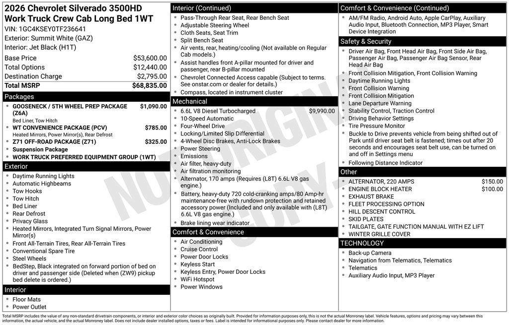 Experience the new Chevrolet Silverado 3500HD, available now at Sky Chevrolet of Provo! With bold design, advanced technology, and dependable performance, Chevrolet makes every mile more exciting. From Utah Valley’s city streets to mountain canyon drives, the Silverado 3500HD is built to handle it all with confidence. Call 801-356-4300 today to schedule your test drive and see what makes it stand out! Summit White 2026 Chevrolet Silverado 3500HD Work Truck 4WD 10-Speed Automatic Duramax 6.6L V8 Turbodiesel 10-Speed Automatic, 4WD, Black Cloth. Price includes: $500 - Chevrolet Consumer Cash Program - Price includes $1,500 Trade-In Allowance for customers trading a 2019 or newer passenger car or truck with under 80,000 miles toward a new 2025–2026 Chevrolet. Branded or salvage title vehicles do not qualify. Some restrictions apply. See dealer for details.