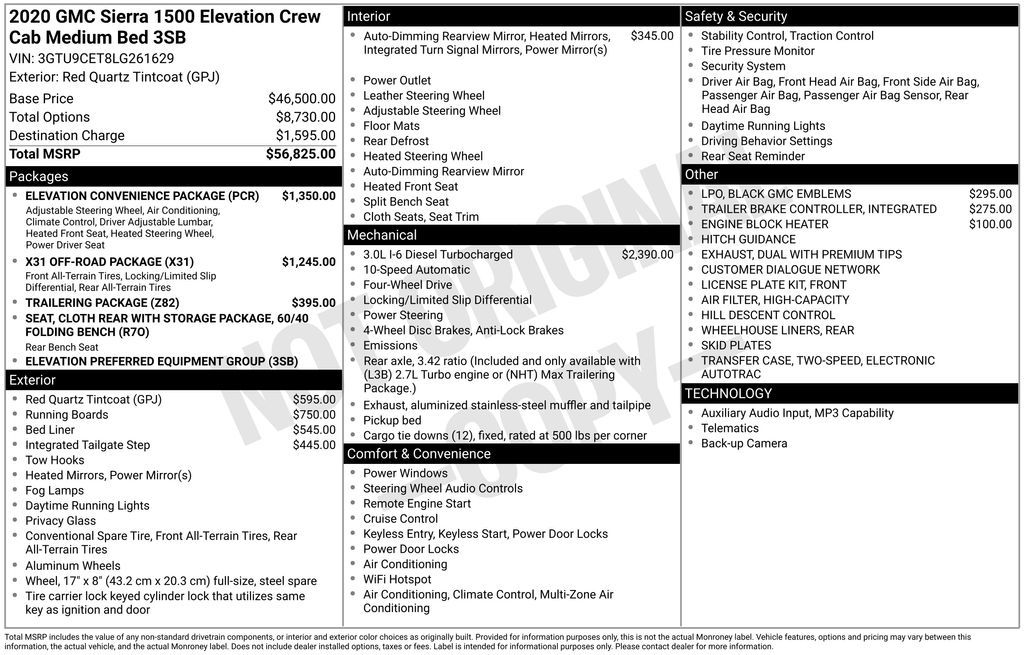 This 2020 GMC Sierra 1500 Elevation is a true workhorse, engineered to conquer any terrain with its exceptional performance and premium features. Boasting a powerful 3.0L I6 Duramax Diesel engine, this Sierra delivers an impressive 460 lb-ft of torque, ensuring effortless towing and hauling capabilities. Paired with a 10-speed automatic transmission and 4-wheel drive, this truck is ready to tackle any job or adventure with confidence.