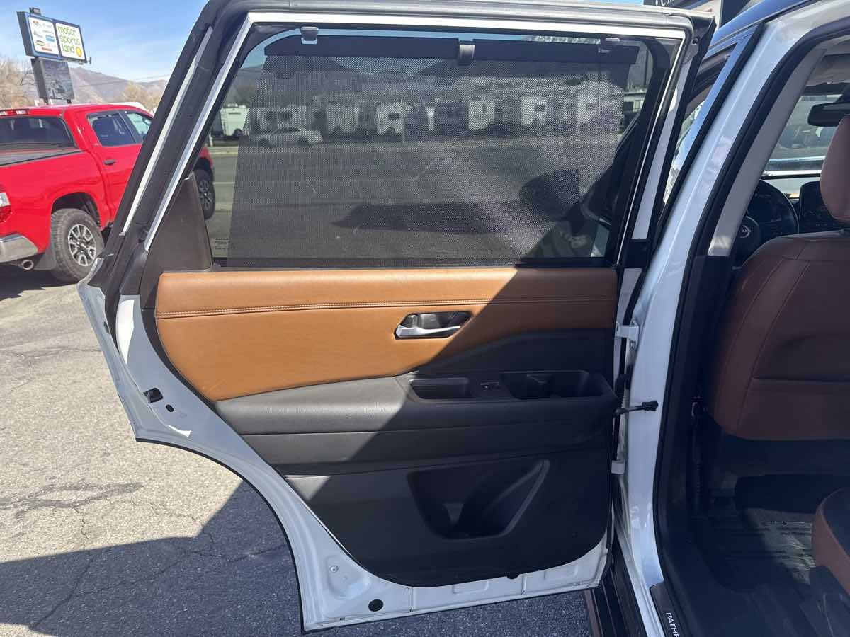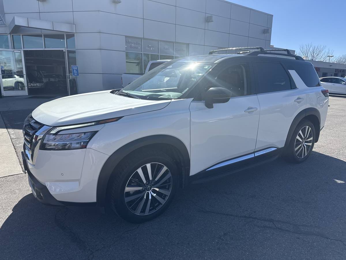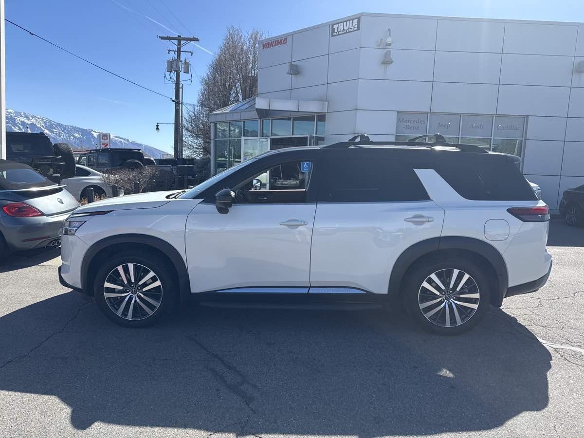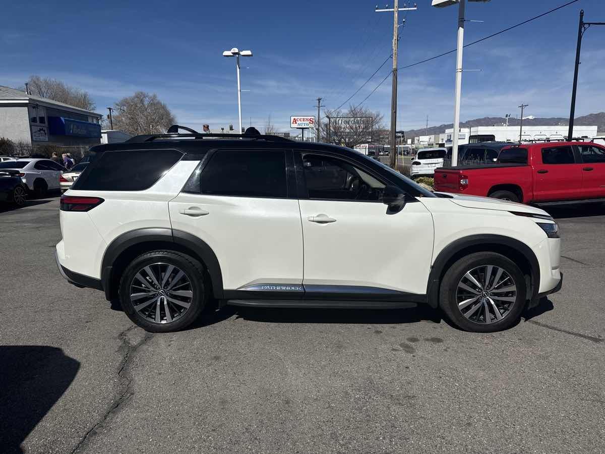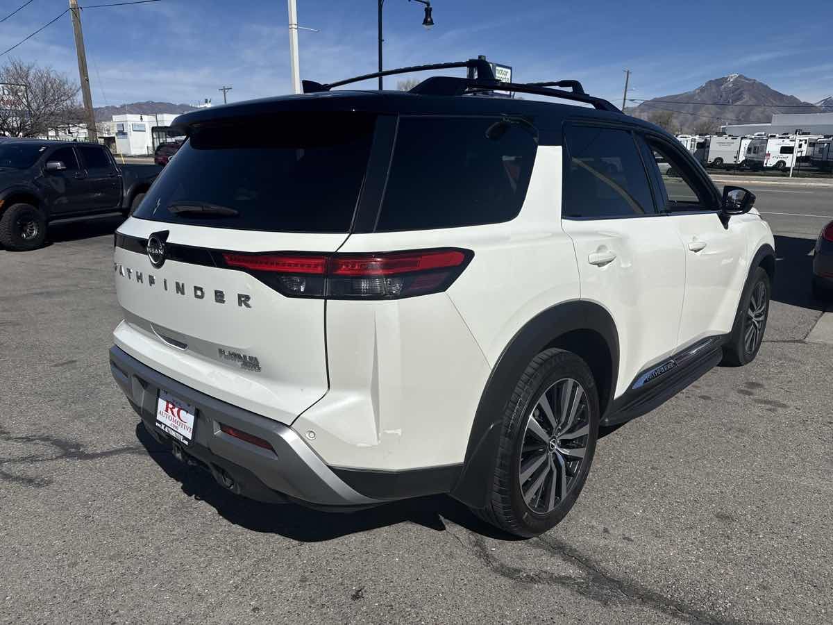 ONE OWNER- CLEAN VEHICLE HISTORY- MOONROOF- BLUETOOTH HANDSFREE- GPS NAVIGATION- LOCAL TRADE-IN- REAR BACK UP CAMERA- LEATHER INTERIOR- 3RD ROW SEATING- GREAT VALUE- THIS VEHICLE QUAILIFES FOR AN EXTENDED WARRANTY UP TO ADDITIONAL 100K MILES- WE TAKE ALL TRADES AND WORK WITH ALL CREDIT UNIONS TO ENSURE THE BEST INTEREST RATE POSSIBLE- CALL US AT 801-268-9911 AND ONE OF OUR FRIENDLY STAFF WILL TAKE CARE OF ALL OF YOUR NEEDS- VISIT US AT WWW.RCAUTOMOTIVE.COM FOR A STRESS FREE AND ENJOYABLE PURCHASE ON YOUR FUTURE VEHICLE- $53-065.00 MSRP- 13 Speakers- Air Conditioning- AM/FM radio: SiriusXM- Automatic temperature control- Bose Premium Audio System- Cargo Area Protector- Cargo Net- Cargo Package- Exterior Parking Camera Rear- First Aid Kit- Front dual zone A/C- Heads-Up Display- Illuminated Kick Plate- Lighting Package (N93)- Memory seat- Navigation system: NissanConnect Navigation- NissanConnect w/Navigation & Services- Power driver seat- Power Liftgate- Power moonroof- Power windows- Radio data system- Radio: AM/FM Audio System- Rear air conditioning- Rear window defroster- Remote keyless entry- Running Boards- Security system- Steering wheel memory- Steering wheel mounted audio controls- Welcome Lighting- Wheels: 20" Alloy w/Unique Finish. CARFAX One-Owner. Clean CARFAX. 2022 Nissan Pathfinder Platinum Pearl White Tricoat/Super Black 4WD 9-Speed Automatic V6