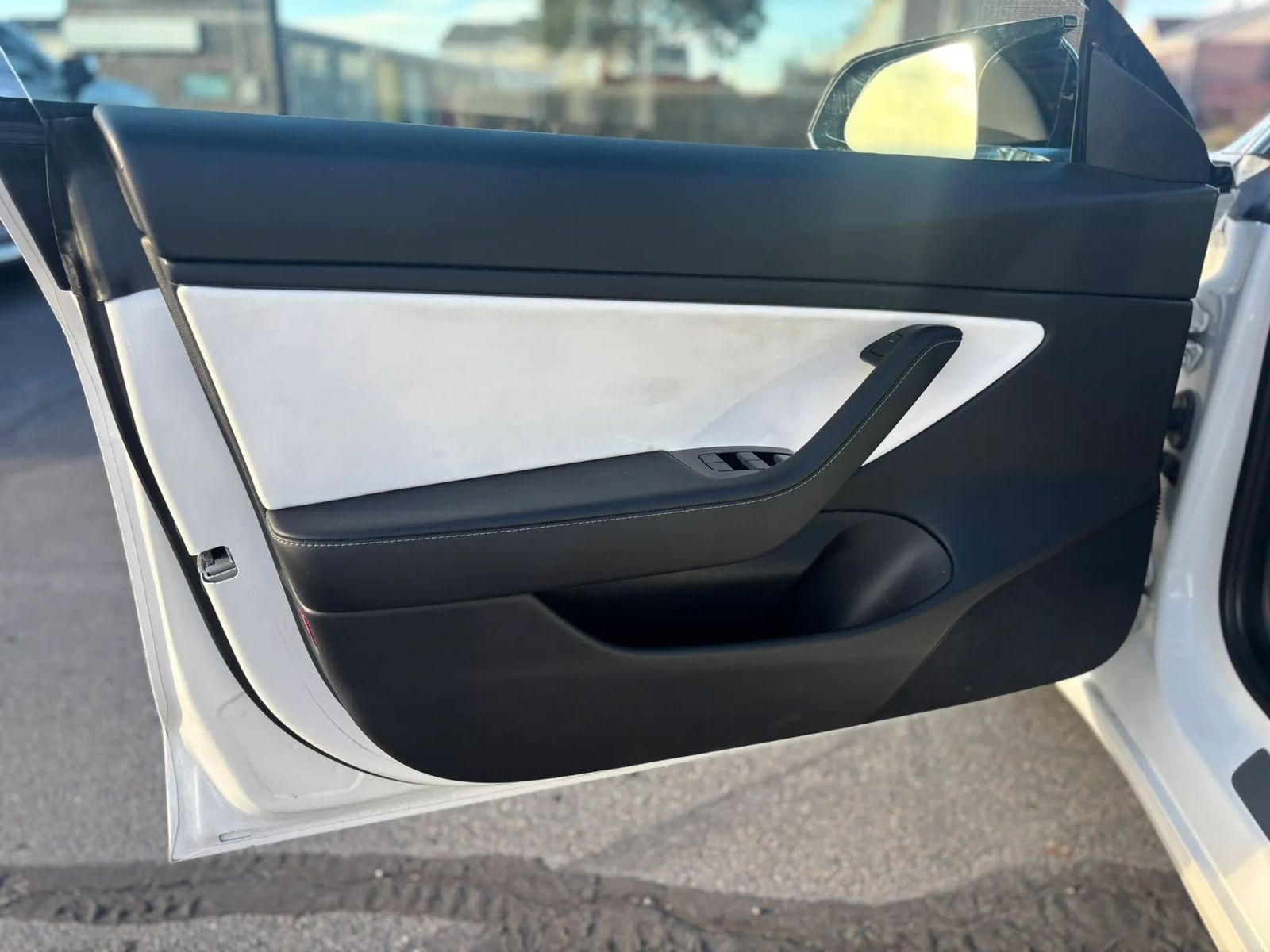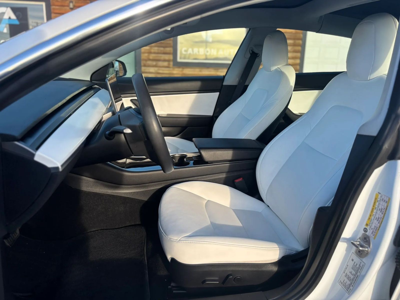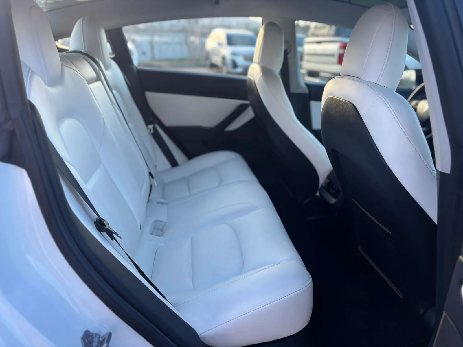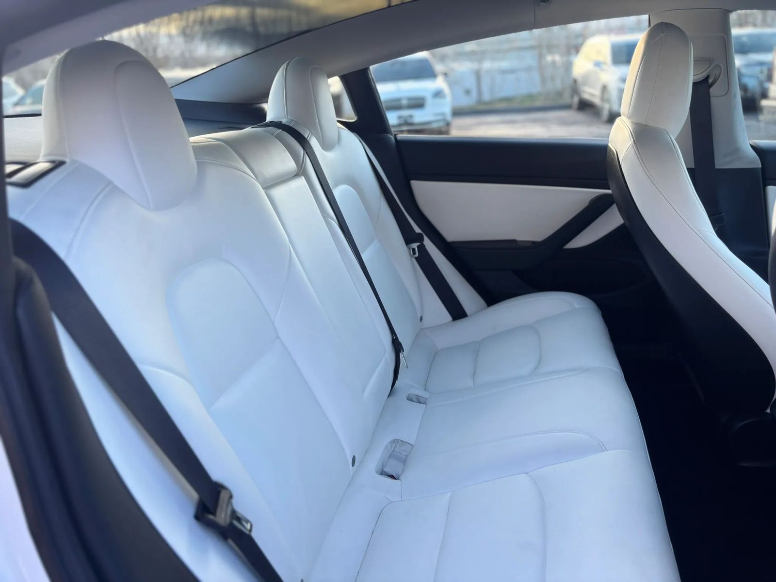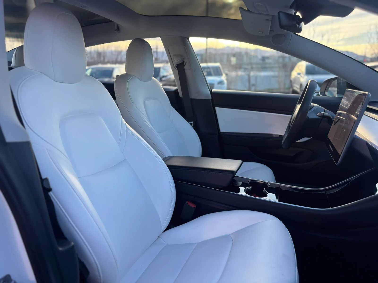 The interior features Tesla’s minimalist design with the large touchscreen display, panoramic glass roof, and bright white premium seats that make the cabin feel modern and spacious.