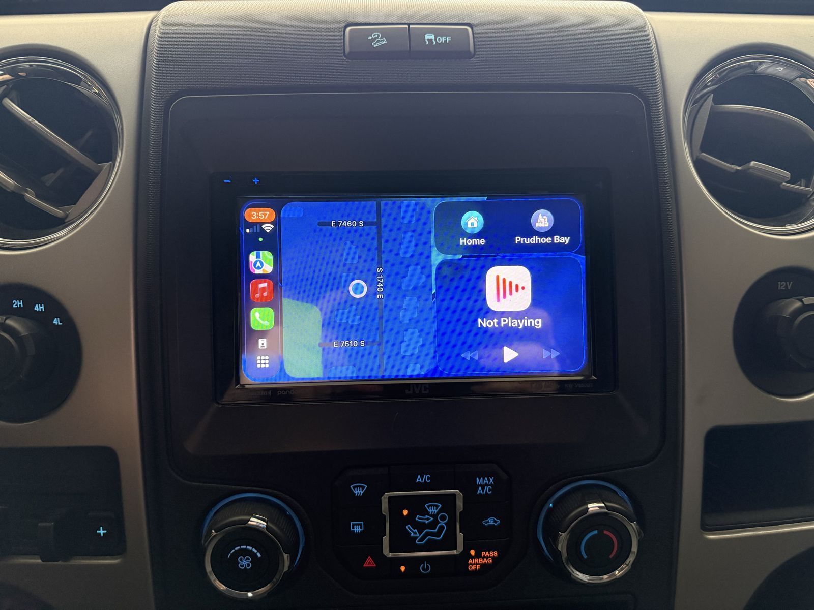 The interior features an aftermarket stereo upgrade with a DVD player and Apple CarPlay, giving it a much more modern entertainment system than the stock setup.