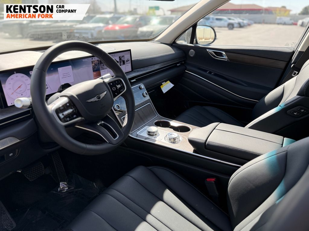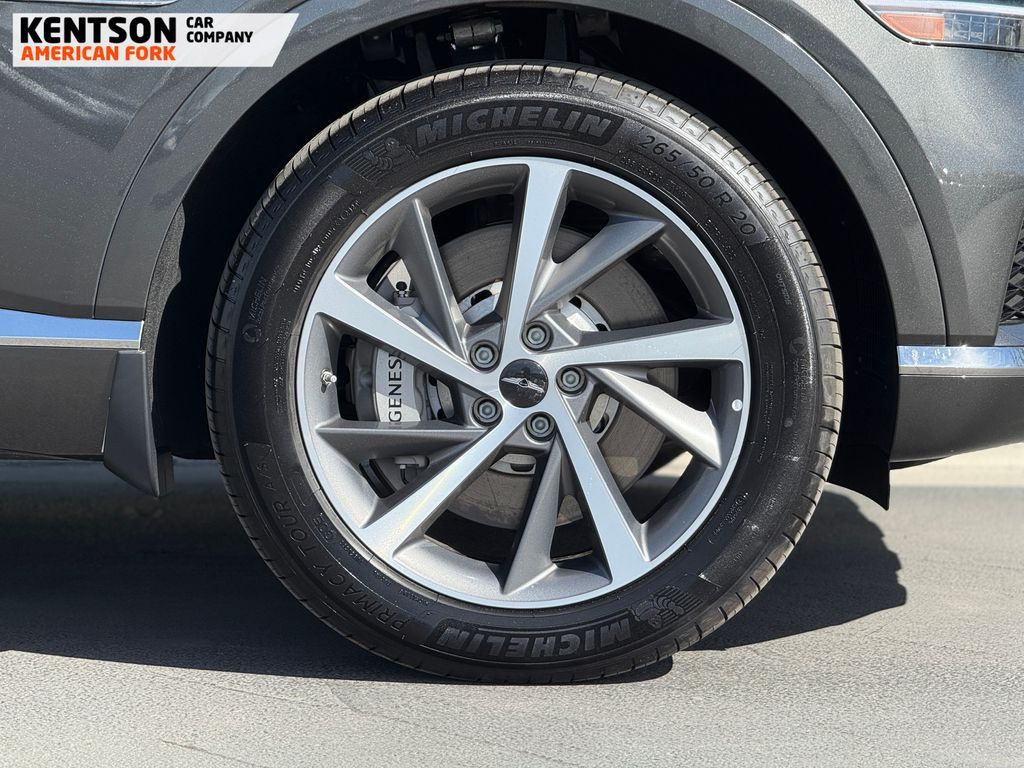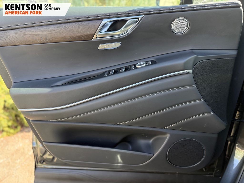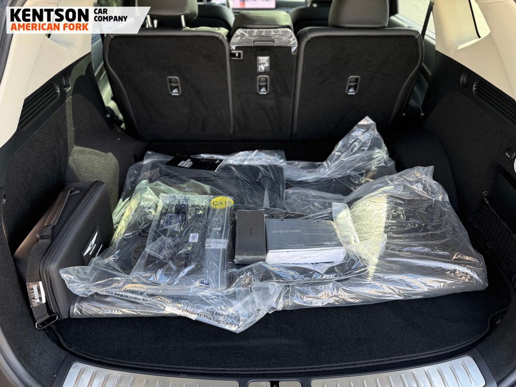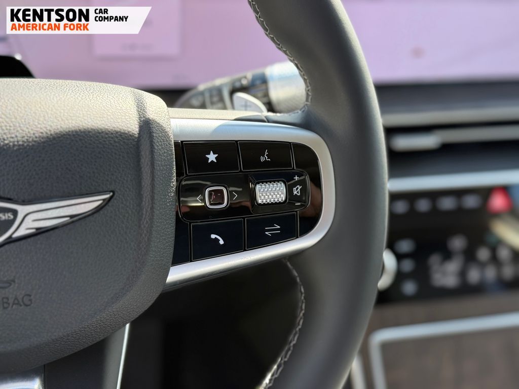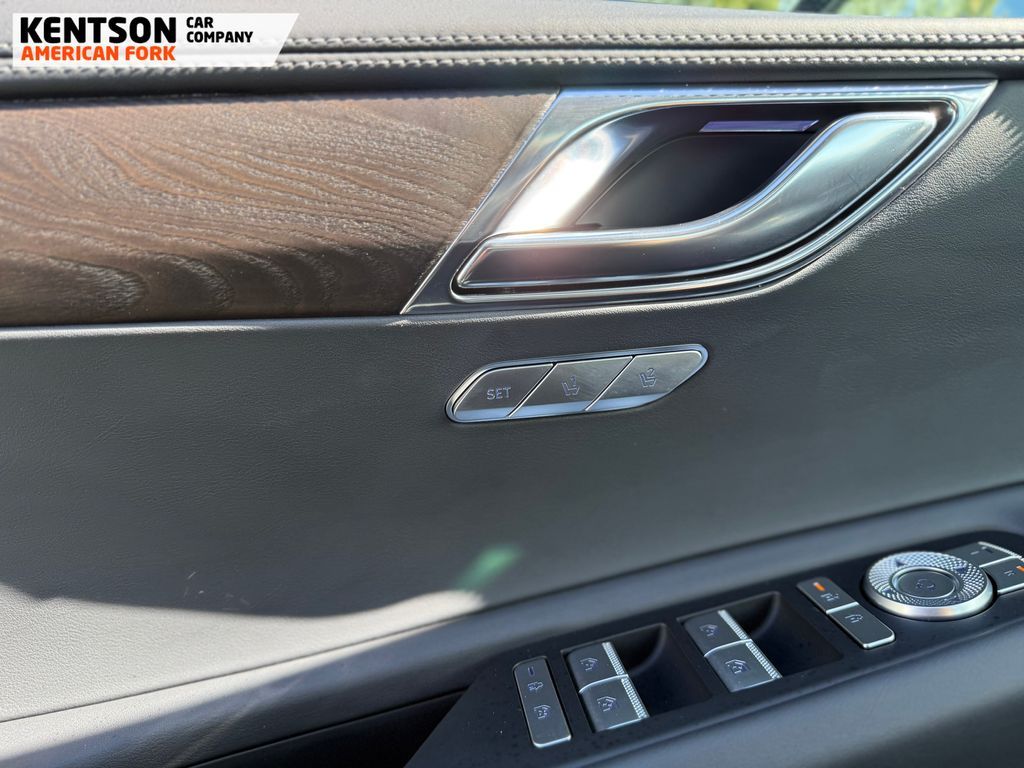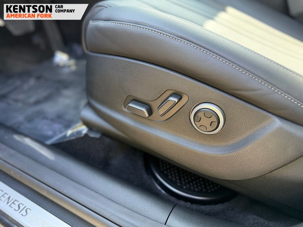 Option Group 01, 12 Speakers, 4-Wheel Disc Brakes, ABS brakes, Air Conditioning, Alloy wheels, AM/FM radio: SiriusXM, Anti-whiplash front head restraints, Auto High-beam Headlights, Auto tilt-away steering wheel, Auto-dimming door mirrors, Auto-dimming Rear-View mirror, Auto-leveling suspension, Automatic temperature control, Brake assist, Bumpers: body-color, Cargo Net, Cargo Tray, Compass, Delay-off headlights, Driver door bin, Driver vanity mirror, Dual front impact airbags, Dual front side impact airbags, Electronic Stability Control, Emergency communication system: Genesis Connected Services, Exterior Parking Camera Rear, First Aid Kit, Four wheel independent suspension, Fragrance Cartridge, Front & Rear Mudguards, Front anti-roll bar, Front Bucket Seats, Front Center Armrest, Front dual zone A/C, Front reading lights, Fully automatic headlights, Garage door transmitter: HomeLink, Genuine wood console insert, Genuine wood dashboard insert, Genuine wood door panel insert, Heated door mirrors, Heated Front Bucket Seats, Heated front seats, Heated steering wheel, Illuminated entry, Knee airbag, Leather steering wheel, Leatherette Seating Surfaces, Low tire pressure warning, Memory seat, Navigation System, NFC Key Card, Occupant sensing airbag, Outside temperature display, Overhead airbag, Overhead console, Panic alarm, Passenger door bin, Passenger vanity mirror, Power door mirrors, Power driver seat, Power Liftgate, Power moonroof, Power passenger seat, Power steering, Power windows, Radio data system, Radio: AM/FM/SiriusXM/HD, Rain sensing wipers, Rear air conditioning, Rear anti-roll bar, Rear reading lights, Rear seat center armrest, Rear side impact airbag, Rear window defroster, Rear window wiper, Remote keyless entry, Roadside Assistance Kit, Security system, Speed control, Speed-sensing steering, Speed-Sensitive Wipers, Split folding rear seat, Spoiler, Steering wheel memory, Steering wheel mounted audio controls, Tachometer, Telescoping steering wheel, Tilt steering wheel, Traction control, Trip computer, Turn signal indicator mirrors, Variably intermittent wipers, and Wheels: 20'' x 8.5J Dark Gray Matte Alloy.