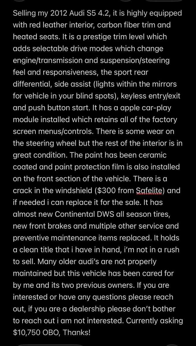Beautiful 2012 Audi S5 with the 4.2L V8, currently has 138k miles but it may go up slightly. Vehicle is in awesome condition and speaks for itself, for the full description see the last photo of the listing. Asking $10,750 OBO, Thanks for looking!